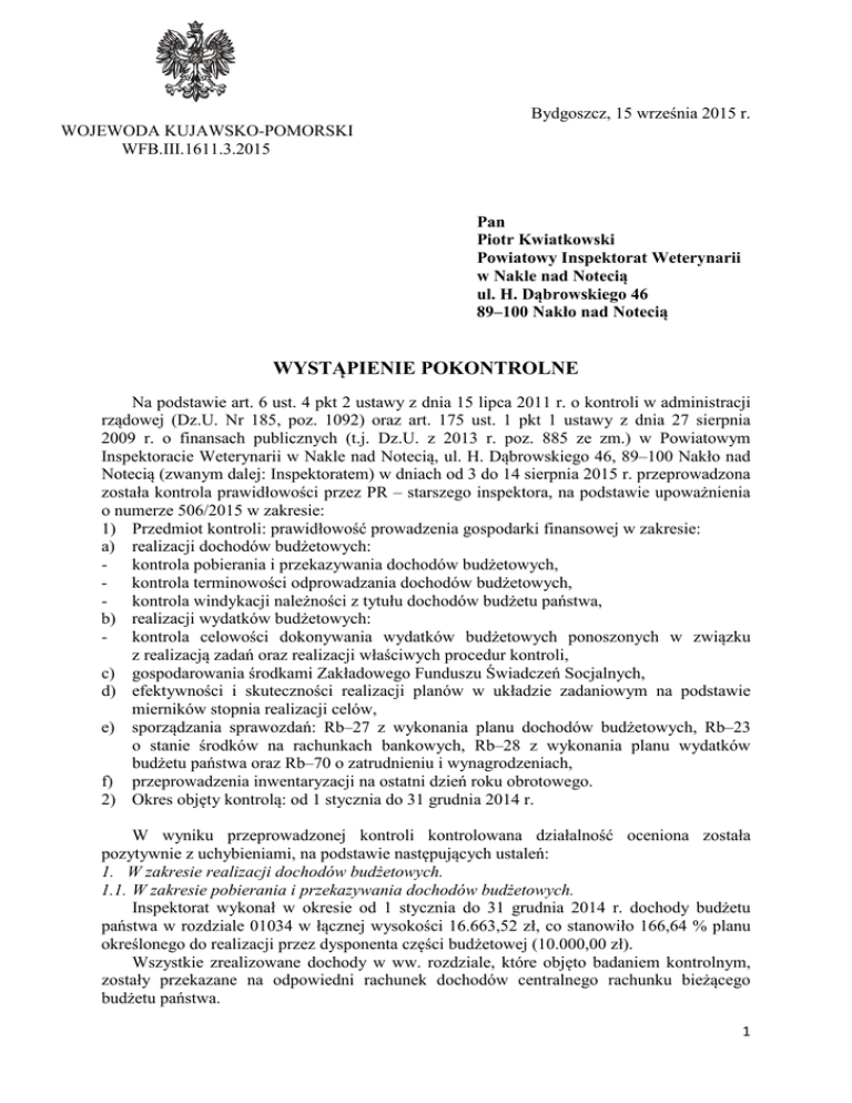 Bydgoszcz, 15 września 2015 r. WOJEWODA KUJAWSKO-POMORSKI WFB.III.1611.3.2015 Pan Piotr Kwiatkowski Powiatowy Inspektorat Weterynarii w Nakle nad Notecią ul. H. Dąbrowskiego 46 89–100 Nakło nad Notecią WYSTĄPIENIE POKONTROLNE Na podstawie art. 6 ust. 4 pkt 2 ustawy z dnia 15 lipca 2011 r. o kontroli w administracji rządowej (Dz.U. Nr 185, poz. 1092) oraz art. 175 ust. 1 pkt 1 ustawy z dnia 27 sierpnia 2009 r. o finansach publicznych (t.j. Dz.U. z 2013 r. poz. 885 ze zm.) w Powiatowym Inspektoracie Weterynarii w Nakle nad Notecią, ul. H. Dąbrowskiego 46, 89–100 Nakło nad Notecią (zwanym dalej: Inspektoratem) w dniach od 3 do 14 sierpnia 2015 r. przeprowadzona została kontrola prawidłowości przez PR – starszego inspektora, na podstawie upoważnienia o numerze 506/2015 w zakresie: 1) Przedmiot kontroli: prawidłowość prowadzenia gospodarki finansowej w zakresie: a) realizacji dochodów budżetowych: - kontrola pobierania i przekazywania dochodów budżetowych, - kontrola terminowości odprowadzania dochodów budżetowych, - kontrola windykacji należności z tytułu dochodów budżetu państwa, b) realizacji wydatków budżetowych: - kontrola celowości dokonywania wydatków budżetowych ponoszonych w związku z realizacją zadań oraz realizacji właściwych procedur kontroli, c) gospodarowania środkami Zakładowego Funduszu Świadczeń Socjalnych, d) efektywności i skuteczności realizacji planów w układzie zadaniowym na podstawie mierników stopnia realizacji celów, e) sporządzania sprawozdań: Rb–27 z wykonania planu dochodów budżetowych, Rb–23 o stanie środków na rachunkach bankowych, Rb–28 z wykonania planu wydatków budżetu państwa oraz Rb–70 o zatrudnieniu i wynagrodzeniach, f) przeprowadzenia inwentaryzacji na ostatni dzień roku obrotowego. 2) Okres objęty kontrolą: od 1 stycznia do 31 grudnia 2014 r. W wyniku przeprowadzonej kontroli kontrolowana działalność oceniona została pozytywnie z uchybieniami, na podstawie następujących ustaleń: 1. W zakresie realizacji dochodów budżetowych. 1.1. W zakresie pobierania i przekazywania dochodów budżetowych. Inspektorat wykonał w okresie od 1 stycznia do 31 grudnia 2014 r. dochody budżetu państwa w rozdziale 01034 w łącznej wysokości 16.663,52 zł, co stanowiło 166,64 % planu określonego do realizacji przez dysponenta części budżetowej (10.000,00 zł). Wszystkie zrealizowane dochody w ww. rozdziale, które objęto badaniem kontrolnym, zostały przekazane na odpowiedni rachunek dochodów centralnego rachunku bieżącego budżetu państwa. 1 Skontrolowano, na podstawie dowodów źródłowych oraz zapisów w księgach rachunkowych, dochody budżetowe (należne, wykonane i przekazane) w ww. rozdziale pobrane w I kwartale 2014 r. w wysokości 2.679,59 zł. W toku kontroli stwierdzono, iż w ewidencji księgowej Inspektoratu zostały ujęte nieprawidłowo w § 0690 pobrane dochody, dotyczące zwrotu wydatków dokonanych w 2013 r. z tytułu nadpłat powstałych w wyniku rozliczenia wynagrodzeń dla wyznaczonych lekarzy weterynarii w łącznej wysokości 318,86 zł oraz odsetek od ww. nadpłat w wysokości 8,20 zł. Zgodnie z rozporządzeniem Ministra Finansów dnia 2 marca 2010 r. w sprawie szczegółowej klasyfikacji dochodów, wydatków, przychodów i rozchodów oraz środków pochodzących ze źródeł zagranicznych (Dz.U. Nr 38, poz. 207 ze zm.), dochody z ww. tytułów powinny prawidłowo zostać ujęte odpowiednio w § 0970 – Wpływy z różnych dochodów oraz w § 0920 – Pozostałe odsetki. Ponadto wykazano, że Inspektorat ewidencjonował na koncie 130 dochody budżetowe bez wyodrębnienia właściwych paragrafów klasyfikacji budżetowej, co stanowiło naruszenie zasad określonych w art. 39 ust. 1 ustawy z dnia 27 sierpnia 2009 r. o finansach publicznych oraz zasad dotyczących funkcjonowania konta 130, które określone zostały w załączniku Nr 3 – Plan kont dla jednostek budżetowych i samorządowych zakładów budżetowych, do rozporządzenia Ministra Finansów z dnia 5 lipca 2010 r. w sprawie szczególnych zasad rachunkowości oraz planów kont dla budżetu państwa, budżetów jednostek samorządu terytorialnego, jednostek budżetowych, samorządowych zakładów budżetowych, państwowych funduszy celowych oraz państwowych jednostek budżetowych mających siedzibę poza granicami Rzeczypospolitej Polskiej (t.j. Dz.U. z 2013 r., poz. 289). 1.2. W zakresie terminowości odprowadzania dochodów budżetowych. W okresie objętym szczegółowym badaniem, wszystkie pobrane dochody budżetowe w rozdziale 01034 przekazywane były na rachunek dochodów budżetu państwa w terminach określonych w § 4 ust. 2 obwiązującego do 31 stycznia 2014 r. rozporządzenia Ministra Finansów z dnia 20 grudnia 2010 r. w sprawie szczegółowego sposobu wykonywania budżetu państwa (Dz.U. Nr 245, poz. 1637 ze zm.) oraz § 4 ust. 2 obwiązującego od 31 stycznia 2014 r. rozporządzenia Ministra Finansów z dnia 15 stycznia 2014 r. w sprawie szczegółowego sposobu wykonywania budżetu państwa (Dz.U. z 2014 r., poz. 82 ze zm.). 1.3. W zakresie windykacji należności z tytułu dochodów budżetu państwa. Nie odnotowano należności wymagalnych z tytułu dochodów budżetowych w rozdziale 01034, według stanu na 31.12.2014 r. W związku z brakiem należności wymagalnych w okresie objętym szczegółową kontrolą, w odniesieniu do stanu tych zaległości na dzień 31.03.2014 r. nie wymagane było prowadzenie czynności windykacyjnych w Inspektoracie. 2. W zakresie realizacji wydatków budżetowych. 2.1. W zakresie celowości dokonywania wydatków budżetowych ponoszonych w związku z realizacją zadań oraz realizacji właściwych procedur kontroli. W 2014 r. Inspektorat wydatkował środki publiczne w rozdziale 01034 na realizację statutowych zadań w wysokości 1.123.495,00 zł, tj. 99,99 % planowanej kwoty (1.123.500,00 zł). Skontrolowano, na podstawie dowodów źródłowych or