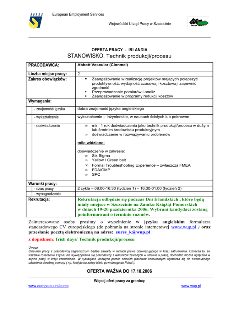 European Employment Services Wojewódzki Urząd Pracy w Szczecinie OFERTA PRACY - IRLANDIA STANOWISKO: Technik produkcji/procesu PRACODAWCA: Abbott Vascular (Clonmel) Liczba miejsc pracy: Zakres obowiązków: 2 Zaangażowanie w realizację projektów mających polepszyć produktywność, wydajność czasową i kosztową i zapewnić zgodność Przeprowadzanie pomiarów i analiz Zaangażowanie w programy redukcji kosztów Wymagania: - znajomość języka dobra znajomość języka angielskiego - wykształcenie wykształcenie – inżynierskie, w naukach ścisłych lub pokrewne - doświadczenie • • min 1 rok doświadczenia jako technik produkcji/procesu w dużym lub średnim środowisku produkcyjnym doświadczenie w rozwiązywaniu problemów mile widziane: doświadczenie w zakresie: • Six Sigma • Yellow / Green belt • Formal Troubleshooting Experience – zwłaszcza FMEA • FDA/GMP • SPC Warunki pracy: - czas pracy - wynagrodzenie Rekrutacja: 2 cykle – 08:00-16:30 (tydzień 1) – 16:30-01:00 (tydzień 2) Rekrutacja odbędzie się podczas Dni Irlandzkich , które będą miały miejsce w Szczecinie na Zamku Książąt Pomorskich w dniach 19-20 października 2006. Wybrani kandydaci zostaną poinformowani o terminie rozmów. Zainteresowane osoby prosimy o wypełnienie w języku angielskim formularza standardowego CV europejskiego (do pobrania na stronie internetowej www.wup.pl ) oraz przesłanie pocztą elektroniczną na adres: [email protected] z dopiskiem: Irish days/ Technik produkcji/procesu Uwaga: Stosunek pracy z pracodawcą zagranicznym będzie zawarty w ramach prawa obowiązującego w kraju zatrudnienia. Oznacza to, że wszelkie roszczenie z tytułu nie wywiązywania się pracodawcy z warunków zawartych w umowie o pracę, dochodzić można wyłącznie w sądzie pracy w kraju zatrudnienia. W sytuacjach losowych pomoc polskich placówek konsularnych ogranicza się do ewentualnego udzielenia doraźnej pomocy ( np. kredytu na zakup biletu powrotnego do Polski ). OFERTA WAŻNA DO 17.10.2006 Więcej ofert pracy za granicą: www.europa.eu.int/eures www.wup.pl