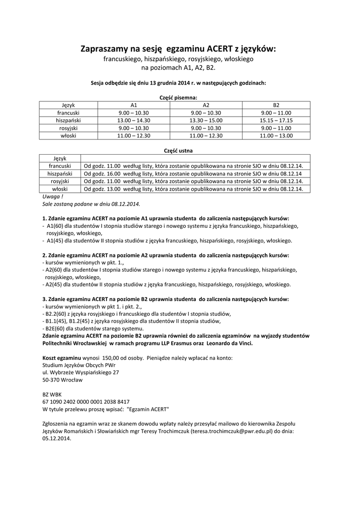Zapraszamy na sesję egzaminu ACERT z języków: francuskiego, hiszpańskiego, rosyjskiego, włoskiego na poziomach A1, A2, B2. Sesja odbędzie się dniu 13 grudnia 2014 r. w następujących godzinach: Część pisemna: Język francuski hiszpański rosyjski włoski A1 9.00 – 10.30 13.00 – 14.30 9.00 – 10.30 11.00 – 12.30 A2 9.00 – 10.30 13.30 – 15.00 9.00 – 10.30 11.00 – 12.30 B2 9.00 – 11.00 15.15 – 17.15 9.00 – 11.00 11.00 – 13.00 Część ustna Język francuski Od godz. 11.00 według listy, która zostanie opublikowana na stronie SJO w dniu 08.12.14. hiszpański Od godz. 16.00 według listy, która zostanie opublikowana na stronie SJO w dniu 08.12.14 rosyjski Od godz. 11.00 według listy, która zostanie opublikowana na stronie SJO w dniu 08.12.14. włoski Od godz. 13.00 według listy, która zostanie opublikowana na stronie SJO w dniu 08.12.14. Uwaga ! Sale zostaną podane w dniu 08.12.2014. 1. Zdanie egzaminu ACERT na poziomie A1 uprawnia studenta do zaliczenia następujących kursów: - A1(60) dla studentów I stopnia studiów starego i nowego systemu z języka francuskiego, hiszpańskiego, rosyjskiego, włoskiego, - A1(45) dla studentów II stopnia studiów z języka francuskiego, hiszpańskiego, rosyjskiego, włoskiego. 2. Zdanie egzaminu ACERT na poziomie A2 uprawnia studenta do zaliczenia następujących kursów: - kursów wymienionych w pkt. 1., - A2(60) dla studentów I stopnia studiów starego i nowego systemu z języka francuskiego, hiszpańskiego, rosyjskiego, włoskiego, - A2(45) dla studentów II stopnia studiów z języka francuskiego, hiszpańskiego, rosyjskiego, włoskiego. 3. Zdanie egzaminu ACERT na poziomie B2 uprawnia studenta do zaliczenia następujących kursów: - kursów wymienionych w pkt 1. i pkt. 2., - B2.2(60) z języka rosyjskiego i francuskiego dla studentów I stopnia studiów, - B1.1(45), B1.2(45) z języka rosyjskiego dla studentów II stopnia studiów, - B2E(60) dla studentów starego systemu. Zdanie egzaminu ACERT na poziomie B2 uprawnia również do zaliczenia egzaminów na wyjazdy studentów Politechniki Wrocławskiej w ramach programu LLP Erasmus oraz Leonardo da Vinci. Koszt egzaminu wynosi 150,00 od osoby. Pieniądze należy wpłacać na konto: Studium Języków Obcych PWr ul. Wybrzeże Wyspiańskiego 27 50-370 Wrocław BZ WBK 67 1090 2402 0000 0001 2038 8417 W tytule przelewu proszę wpisać: "Egzamin ACERT" Zgłoszenia na egzamin wraz ze skanem dowodu wpłaty należy przesyłać mailowo do kierownika Zespołu Języków Romańskich i Słowiańskich mgr Teresy Trochimczuk ([email protected]) do dnia: 05.12.2014.