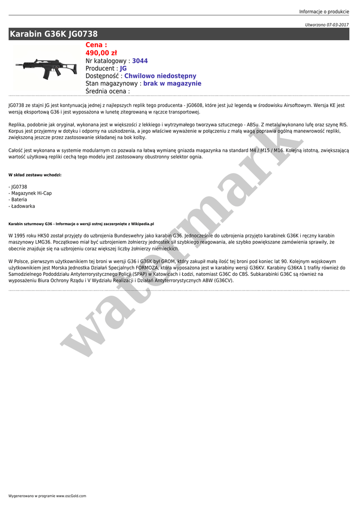 Informacje o produkcie Utworzono 07-03-2017 Karabin G36K JG0738 Cena : 490,00 zł Nr katalogowy : 3044 Producent : JG Dostępność : Chwilowo niedostępny Stan magazynowy : brak w magazynie Średnia ocena : JG0738 ze stajni JG jest kontynuacją jednej z najlepszych replik tego producenta - JG0608, które jest już legendą w środowisku Airsoftowym. Wersja KE jest wersją eksportową G36 i jest wyposażona w lunetę zitegrowaną w rączce transportowej. er m ar k Replika, podobnie jak oryginał, wykonana jest w większości z lekkiego i wytrzymałego tworzywa sztucznego - ABSu. Z metalu wykonano lufę oraz szynę RIS. Korpus jest przyjemny w dotyku i odporny na uszkodzenia, a jego właściwe wyważenie w połączeniu z małą wagą poprawia ogólną manewrowość repliki, zwiększoną jeszcze przez zastosowanie składanej na bok kolby. Całość jest wykonana w systemie modularnym co pozwala na łatwą wymianę gniazda magazynka na standard M4 / M15 / M16. Kolejną istotną, zwiększającą wartość użytkową repliki cechą tego modelu jest zastosowany obustronny selektor ognia. W skład zestawu wchodzi: - JG0738 - Magazynek Hi-Cap - Bateria - Ładowarka Karabin szturmowy G36 - Informacje o wersji ostrej zaczerpnięte z Wikipedia.pl W 1995 roku HK50 został przyjęty do uzbrojenia Bundeswehry jako karabin G36. Jednocześnie do uzbrojenia przyjęto karabinek G36K i ręczny karabin maszynowy LMG36. Początkowo miał być uzbrojeniem żołnierzy jednostek sił szybkiego reagowania, ale szybko powiększane zamówienia sprawiły, że obecnie znajduje się na uzbrojeniu coraz większej liczby żołnierzy niemieckich. w at W Polsce, pierwszym użytkownikiem tej broni w wersji G36 i G36K był GROM, który zakupił małą ilość tej broni pod koniec lat 90. Kolejnym wojskowym użytkownikiem jest Morska Jednostka Działań Specjalnych FORMOZA, która wyposażona jest w karabiny wersji G36KV. Karabiny G36KA 1 trafiły również do Samodzielnego Pododdziału Antyterrorystycznego Policji (SPAP) w Katowicach i Łodzi, natomiast G36C do CBŚ. Subkarabinki G36C są również na wyposażeniu Biura Ochrony Rządu i V Wydziału Realizacji i Działań Antyterrorystycznych ABW (G36CV). Wygenerowano w programie www.oscGold.com