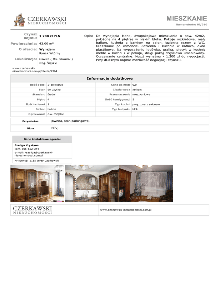 MIESZKANIE Numer oferty: Mi/310 Czynsz 1 200 zł PLN najmu: Powierzchnia: 42.00 m² O ofercie: Wynajem Rynek Wtórny Lokalizacja: Gliwice ( Os. Sikornik ) woj. Śląskie Opis: Do wynajęcia ładne, dwupokojowe mieszkanie o pow. 42m2, położone na 4 piętrze w niskim bloku. Pokoje rozkładowe, mały balkon, kuchnia z barkiem na salon, łazienka razem z WC. Mieszkanie po remoncie. Łazienka i kuchnia w kaflach, okna plastikowe. Na wyposażeniu lodówka, pralka, piecyk w kuchni; meble w kuchni i w pokoju, drugi pokój częściowo umeblowany. Ogrzewanie centralne. Koszt wynajmu - 1.200 zł do negocjacji. Przy dłuższym najmie możliwość negocjacji czynszu. www.czerkawskinieruchomosci.com.pl/oferta/7364 Informacje dodatkowe Ilość pokoi 2-pokojowe Stan do użytku Standard średni Piętro 4 Cena za metr 0.0 Ciepła woda junkers Przeznaczenie mieszkaniowe Ilość kondygnacji 5 Ilość łazienek 1 Typ kuchni połączona z salonem Balkon balkon Typ budynku blok Ogrzewanie c.o. miejskie Przynależne Okna piwnica, stan.parkingowe, PCV, Dane kontaktowe agenta: Szeliga Krystyna kom. 605-622-344 e-mail: [email protected] Nr licencji: 2185 Jerzy Czerkawski www.czerkawski-nieruchomosci.com.pl