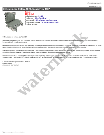 Informacje o produkcie Utworzono 07-03-2017 Ochraniacze kolan ALTA SuperFlex UCP Cena : 109,00 zł Nr katalogowy : 2140 Producent : Alta Tactical Dostępność : Chwilowo niedostępny Stan magazynowy : brak w magazynie Średnia ocena : er m ar k Ochraniacze na kolana ULTRAFLEX Doskonałe nakolanniki firmy Alta Industries. Znane i cenione przez żołnierzy jednostek specjalnych łączą w sobie bezpieczeństwo oraz niespotykaną w innych modelach wygodę użytkowania. Opatentowany system mocowania AltaLock składa się z dwóch taśm oraz specjalnych obrotowych zaczepów. Doskonałe trzymanie się nakolannika na nodze zapewnione jest dzięki dolnej, nierozciągliwej taśmie oraz górnej, która dostosowuje się do kształtu nogi użytkownika podczas ruchu. Nakolanniki składają się z wytrzymałej, wykonanej z wytrzymałego tworzywa sztucznego zewnętrznej nakładki oraz wewnętrznej miękkiej wkładki obszytej materiałem Cordura. Wewnątrz znajduje się również gruba gąbka która dostosowuje się do kształtu kolana. Nakolanniki ULTRAFLEX posiadają trzy, osobno pracujące segmenty zapewniające jeszcze lepsze dopasowanie do kolana i elastyczność. Każdy z nich zbudowany jest z obszytej Cordurą pianki. Środkowy segment wzmocniony jest skorupą z tworzywa sztucznego zabezpieczający kolano przed urazami. ● ● w at ● Zestaw ochraniaczy na kolana ULTRAFLEX Kolor: coyote Producent: Alta Tactical Wygenerowano w programie www.oscGold.com
