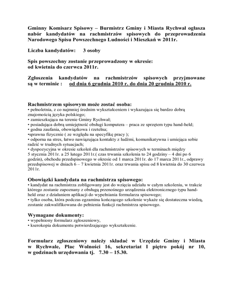 Gminny Komisarz Spisowy – Burmistrz Gminy i Miasta Rychwał ogłasza nabór kandydatów na rachmistrzów spisowych do przeprowadzenia Narodowego Spisu Powszechnego Ludności i Mieszkań w 2011r. Liczba kandydatów: 3 osoby Spis powszechny zostanie przeprowadzony w okresie: od kwietnia do czerwca 2011r. Zgłoszenia kandydatów na rachmistrzów spisowych przyjmowane są w terminie : od dnia 6 grudnia 2010 r. do dnia 20 grudnia 2010 r. Rachmistrzem spisowym może zostać osoba: • pełnoletnia, z co najmniej średnim wykształceniem i wykazująca się bardzo dobrą znajomością języka polskiego; • zamieszkująca na terenie Gminy Rychwał; • posiadająca dobrą umiejętność obsługi komputera – praca ze sprzętem typu hand-held; • godna zaufania, obowiązkowa i rzetelna; •sprawna fizycznie ( ze względu na specyfikę pracy ); • odporna na stres, łatwo nawiązująca kontakty z ludźmi, komunikatywna i umiejąca sobie radzić w trudnych sytuacjach; • dyspozycyjna w okresie szkoleń dla rachmistrzów spisowych w terminach między 5 stycznia 2011r. a 25 lutego 2011r.( czas trwania szkolenia to 24 godziny – 4 dni po 6 godzin), obchodu przedspisowego w okresie od 1 marca 2011r. do 17 marca 2011r., odprawy przedspisowej w dniach 6 – 7 kwietnia 2011r. oraz trwania spisu od 8 kwietnia do 30 czerwca 2011r. Obowiązki kandydata na rachmistrza spisowego: • kandydat na rachmistrza zobligowany jest do wzięcia udziału w całym szkoleniu, w trakcie którego zostanie zapoznany z obsługą przenośnego urządzenia elektronicznego typu handheld oraz z działaniem aplikacji do wypełniania formularza spisowego; • tylko osoba, która podczas egzaminu kończącego szkolenie wykaże się dostateczna wiedzą, zostanie zakwalifikowana do pełnienia funkcji rachmistrza spisowego. Wymagane dokumenty: • wypełniony formularz zgłoszeniowy, • kserokopia dokumentu potwierdzającego wykształcenie. Formularz zgłoszeniowy należy składać w Urzędzie Gminy i Miasta w Rychwale, Plac Wolności 16, sekretariat I piętro pokój nr 10, w godzinach urzędowania tj. 7.30 – 15.30.