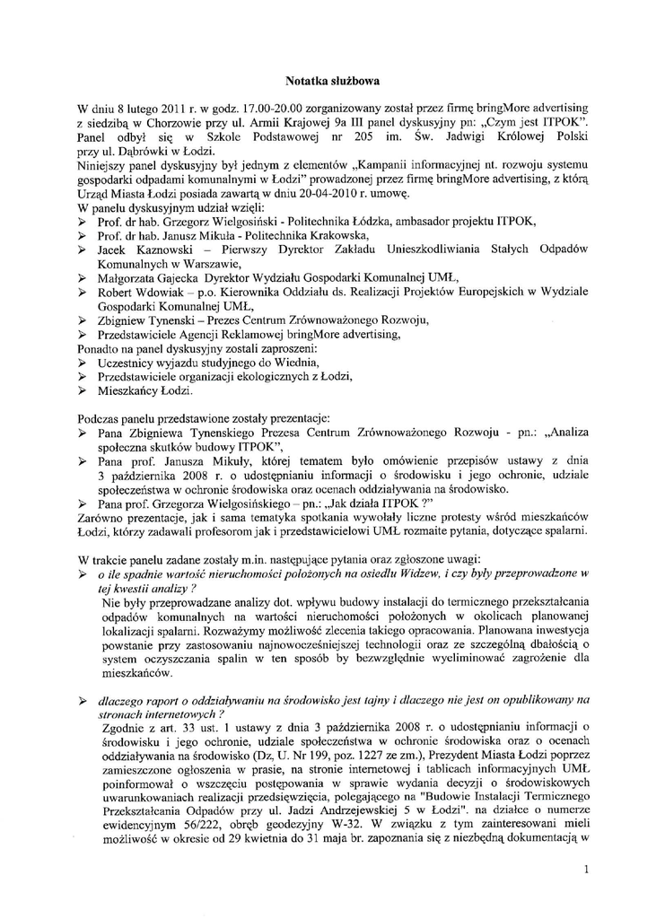 Notatka sluzbowa W dniu 8 lutego 2011 r. w godz. 17.00-20.00 zorganizowany zostal przez firing bringMore advertising z siedzibq. w Chorzowie przy ul. Armii Krajowej 9a III panel dyskusyjny pn: ,,Czym jest ITPOK". Panel odbyl SIQ w Szkole Podstawowej nr 205 im. Sw. Jadwigi Krolowej Polski przy ul. Dabrowki w Lodzi. Niniejszy panel dyskusyjny byl jednym z elementow ,,Kampanii informacyjnej nt. rozwoju systemu gospodarki odpadami komunalnymi w Lodzi" prowadzonej przez firme_ bringMore advertising, z ktora_ Urza^d Miasta Lodzi posiada zawartg. w dniu 20-04-2010 r. umow$. W panelu dyskusyjnym udzial wzieji: > Prof, dr hab. Grzegorz Wielgosiriski - Politechnika Lodzka, ambasador projektu ITPOK, > Prof, dr hab. Janusz Mikula - Politechnika Krakowska, > Jacek Kaznowski - Pierwszy Dyrektor Zakladu Unieszkodliwiania Stalych Odpadow Komunalnych w Warszawie, > Malgorzata Gajecka Dyrektor Wydziahi Gospodarki Komunalnej UML, > Robert Wdowiak - p.o. Kierownika Oddzialu ds. Realizacji Projektow Europejskich w Wydziale Gospodarki Komunalnej UML, > Zbigniew Tynenski - Prezes Centrum Zrownowazonego Rozwoju, > Przedstawiciele Agencji Reklamowej bringMore advertising, Ponadto na panel dyskusyjny zostali zaproszeni: > Uczestnicy wyjazdu studyjnego do Wiednia, ^ Przedstawiciele organizacji ekologicznych z Lodzi, > Mieszkancy Lodzi. Podczas panelu przedstawione zostaty prezentacje: > Pana Zbigniewa Tynenskiego Prezesa Centrum Zrownowazonego Rozwoju - pn.: ,,Analiza spoleczna skutkow budowy ITPOK", > Pana prof. Janusza Mikuly, ktorej tematem bylo omowienie przepisow ustawy z dnia 3 pazdziernika 2008 r. o udostejmianiu informacji o srodowisku i jego ochronie, udziale spoleczenstwa w ochronie srodowiska oraz ocenach oddzialywania na srodowisko. > Pana prof. Grzegorza Wielgosinskiego - pn.: ,,Jak dziala ITPOK ?" Zarowno prezentacje, jak i sama tematyka spotkania wywolaly liczne protesty wsrod mieszkaticow Lodzi, ktorzy zadawali profesorom jak i przedstawicielowi UML rozmaite pytania, dotyczq.ce spalarni. W trakcie panelu zadane zostaiy m.in. nast^puja^ce pytania oraz zgloszone uwagi: > o He spadnie wartosc meruchomosci polozonych na osiedlu Widzew, i czy byfy przeprowadzone w tej kwestii analizy ? Nie byly przeprowadzane analizy dot. wplywu budowy instalacji do termicznego przeksztalcania odpadow komunalnych na wartosci nieruchomosci polozonych w okolicach planowanej lokalizacji spalarni. Rozwazymy mozliwosc zlccenia takiego opracowania. Planowana inwestycja powstanie przy zastosowaniu najnowoczesniejszej technologii oraz ze szczegolna^ dbaloscia_ o system oczyszczania spalin w ten sposob by bezwzgl^dnie wyeliminowac zagrozenie dla mieszkahcow. > dlaczego raport o oddziatywaniu na srodowisko jest tajny i dlaczego me jest on opublikowany na stronach internetowych ? Zgodnie z art. 33 ust. 1 ustawy z dnia 3 pazdziernika 2008 r. o udostejmianiu informacji o srodowisku i jego ochronie, udziale spoleczenstwa w ochronie srodowiska oraz o ocenach oddzialywania na srodowisko (Dz, U. Nr 199, poz. 1227 ze zm.), Prezydent Miasta Lodzi poprzez zamieszczone ogloszenia w prasie, na stronie internetowej i tablicach informacyjnych UML poinformowal o wszcz^ciu postej>owania w sprawie wydania decyzji o srodowiskowych uwarunkowaniach realizacji przedsi^wziecia, polegajapego na "Budowie Instalacji Termicznego Przeksztalcania Odpadow przy ul. Jadzi Andrzejewskiej 5 w Lodzi". na dzialce o numerze ewidencyjnym 56/222, obreb geodezyjny W-32. W zwia^zku z tym zainteresowani mieli mozliwosc w okresie od 29 kwietnia do 31 maja br. zapoznania sie^ z niezbe_dna_ dokumentacja^ w 1 sprawie wydania decyzji o srodowiskowych uwarunkowaniach realizacji przedsi$wzie_cia oraz skladania uwag i wnioskow w formie pisemnej, ustnie do protokolu w siedzibie Wydzialu Ochrony Srodowiska i Rolnictwa UML lub e-mailem (adresmailowy: [email protected]). W ramach zapewnienia udziahi spoleczenstwa w podejmowaniu decyzji na temat planowanej inwestycji odbyly siq spotkania: - w dniu 18 maja 2010 r. z przedstawicielami Rad OsiedH - w dniu 22 maja 2010 r. o godz. 11:00 w duzej sali obrad Rady Miejskiej w Lodzi przy ul. Piotrkowskiej 104,odbylo sie_ spotkanie z mieszkaricami. - w dniu 22 czerwca 2010 r. o godz. 17— w matej sali obrad Rady Miejskiej w Lodzi przy ul. Piotrkowskiej 104, z mieszkancami miasta. W dniu 28 czerwca 2010 r. Prezydent Miasta Lodzi Decyzja^Nr 51/U/2010 ustalil srodowiskowe uwarunkowania realizacji przedsi^wziqcia, polegajaeego na budowie instalacji Termicznego Przeksztalcania Odpadow. W uzasadnieniu niniejszej Decyzji zamicszczona zostala informacja o przeprowadzonych w dniach 22 maja i 22 czerwca 2010 r. w siedzibie Urze_du Miasta Lodzi, ul. Piotrkowska 104 odbyly sie_ spotkania z mieszkancami miasta, a w dniu 18 maja 2010 r. odbylo sie, spotkanie z przedstawicielami Rad Osiedli. > czy Urzqd Miasta Lodzi wiedzqc, ze mieszkancy Widzewa sqprzeciwni budowie spalarni na swoim osiedlu, zamierza kontymtowac plany realizacji inwestycji ? W dniu 30-06-2010 r. zlozony zostal w Narodowym Funduszu Ochrony Srodowiska i Gospodarki Wodnej w Warszawie wniosek o przyznanie dofinansowania ze srodkow Programu Operacyjnego Infrastruktura i Srodowisko w ramach Priorytetu II Gospodarka odpadami i ochrona powierzchni ziemi, Dzialanie 2.1 - Kompleksowe przedsiQwzie_cia w zakresie gospodarki odpadami ze szczegomym uwzgl^dnieniem odpadow niebezpiecznych na realizacje, projektu ,,Gospodarka odpadami komunalnymi w Lodzi - faza II", Wniosek o dofmansowanie Projektu ,,Gospodarka odpadami komunalnymi w Lodzi - faza II" wraz z wymagana^ dokumentacja_ zostal zlozony w dniu 30 czerwca 2010 r. W lipcu 2010 r. Narodowy Fundusz Ochrony Srodowiska i Gospodarki Wodnej (Instytucja Wdrazajaca dla Programu Operacyjnego Infrastruktura i Srodowisko) poinformowal o wyniku przeprowadzonej oceny w oparciu o kryteria formalne i merytoryczne pierwszego stopnia. Wniosek uzyskal pozytywna^ ocene_ formalna^ i merytorycznq. pierwszego stopnia, przekraczaja_c tym samym prog wymaganych 60% mozliwyc