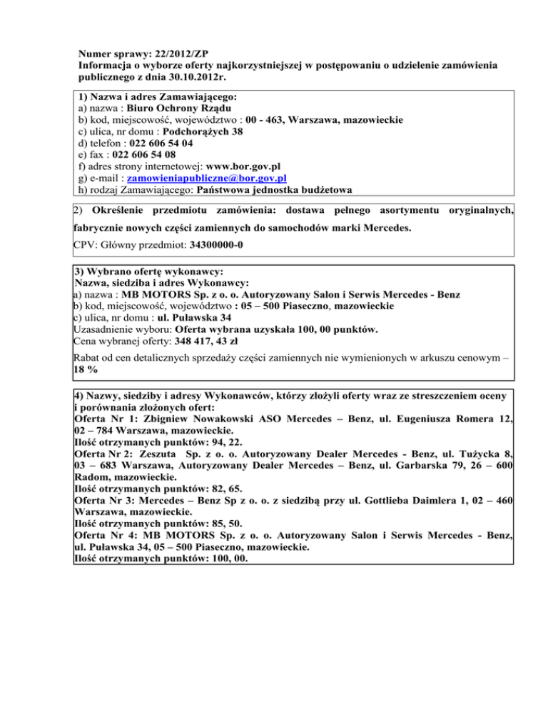 Numer sprawy: 22/2012/ZP Informacja o wyborze oferty najkorzystniejszej w postępowaniu o udzielenie zamówienia publicznego z dnia 30.10.2012r. 1) Nazwa i adres Zamawiającego: a) nazwa : Biuro Ochrony Rządu b) kod, miejscowość, województwo : 00 - 463, Warszawa, mazowieckie c) ulica, nr domu : Podchorążych 38 d) telefon : 022 606 54 04 e) fax : 022 606 54 08 f) adres strony internetowej: www.bor.gov.pl g) e-mail : [email protected] h) rodzaj Zamawiającego: Państwowa jednostka budżetowa 2) Określenie przedmiotu zamówienia: dostawa pełnego asortymentu oryginalnych, fabrycznie nowych części zamiennych do samochodów marki Mercedes. CPV: Główny przedmiot: 34300000-0 3) Wybrano ofertę wykonawcy: Nazwa, siedziba i adres Wykonawcy: a) nazwa : MB MOTORS Sp. z o. o. Autoryzowany Salon i Serwis Mercedes - Benz b) kod, miejscowość, województwo : 05 – 500 Piaseczno, mazowieckie c) ulica, nr domu : ul. Puławska 34 Uzasadnienie wyboru: Oferta wybrana uzyskała 100, 00 punktów. Cena wybranej oferty: 348 417, 43 zł Rabat od cen detalicznych sprzedaży części zamiennych nie wymienionych w arkuszu cenowym – 18 % 4) Nazwy, siedziby i adresy Wykonawców, którzy złożyli oferty wraz ze streszczeniem oceny i porównania złożonych ofert: Oferta Nr 1: Zbigniew Nowakowski ASO Mercedes – Benz, ul. Eugeniusza Romera 12, 02 – 784 Warszawa, mazowieckie. Ilość otrzymanych punktów: 94, 22. Oferta Nr 2: Zeszuta Sp. z o. o. Autoryzowany Dealer Mercedes - Benz, ul. Tużycka 8, 03 – 683 Warszawa, Autoryzowany Dealer Mercedes – Benz, ul. Garbarska 79, 26 – 600 Radom, mazowieckie. Ilość otrzymanych punktów: 82, 65. Oferta Nr 3: Mercedes – Benz Sp z o. o. z siedzibą przy ul. Gottlieba Daimlera 1, 02 – 460 Warszawa, mazowieckie. Ilość otrzymanych punktów: 85, 50. Oferta Nr 4: MB MOTORS Sp. z o. o. Autoryzowany Salon i Serwis Mercedes - Benz, ul. Puławska 34, 05 – 500 Piaseczno, mazowieckie. Ilość otrzymanych punktów: 100, 00.