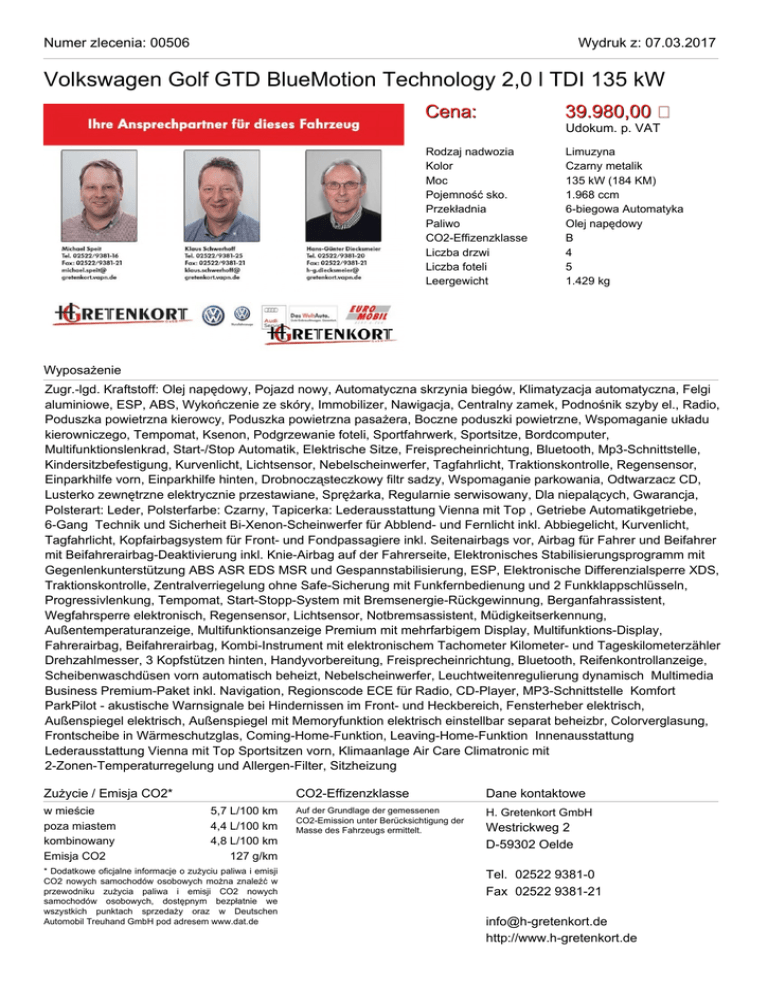 Numer zlecenia: 00506 Wydruk z: 07.03.2017 Volkswagen Golf GTD BlueMotion Technology 2,0 l TDI 135 kW Cena: 39.980,00 Rodzaj nadwozia Kolor Moc Pojemność sko. Przekładnia Paliwo CO2-Effizenzklasse Liczba drzwi Liczba foteli Leergewicht Limuzyna Czarny metalik 135 kW (184 KM) 1.968 ccm 6-biegowa Automatyka Olej napędowy B 4 5 1.429 kg Udokum. p. VAT Wyposażenie Zugr.-lgd. Kraftstoff: Olej napędowy, Pojazd nowy, Automatyczna skrzynia biegów, Klimatyzacja automatyczna, Felgi aluminiowe, ESP, ABS, Wykończenie ze skóry, Immobilizer, Nawigacja, Centralny zamek, Podnośnik szyby el., Radio, Poduszka powietrzna kierowcy, Poduszka powietrzna pasażera, Boczne poduszki powietrzne, Wspomaganie układu kierowniczego, Tempomat, Ksenon, Podgrzewanie foteli, Sportfahrwerk, Sportsitze, Bordcomputer, Multifunktionslenkrad, Start-/Stop Automatik, Elektrische Sitze, Freisprecheinrichtung, Bluetooth, Mp3-Schnittstelle, Kindersitzbefestigung, Kurvenlicht, Lichtsensor, Nebelscheinwerfer, Tagfahrlicht, Traktionskontrolle, Regensensor, Einparkhilfe vorn, Einparkhilfe hinten, Drobnocząsteczkowy filtr sadzy, Wspomaganie parkowania, Odtwarzacz CD, Lusterko zewnętrzne elektrycznie przestawiane, Sprężarka, Regularnie serwisowany, Dla niepalących, Gwarancja, Polsterart: Leder, Polsterfarbe: Czarny, Tapicerka: Lederausstattung Vienna mit Top , Getriebe Automatikgetriebe, 6-Gang Technik und Sicherheit Bi-Xenon-Scheinwerfer für Abblend- und Fernlicht inkl. Abbiegelicht, Kurvenlicht, Tagfahrlicht, Kopfairbagsystem für Front- und Fondpassagiere inkl. Seitenairbags vor, Airbag für Fahrer und Beifahrer mit Beifahrerairbag-Deaktivierung inkl. Knie-Airbag auf der Fahrerseite, Elektronisches Stabilisierungsprogramm mit Gegenlenkunterstützung ABS ASR EDS MSR und Gespannstabilisierung, ESP, Elektronische Differenzialsperre XDS, Traktionskontrolle, Zentralverriegelung ohne Safe-Sicherung mit Funkfernbedienung und 2 Funkklappschlüsseln, Progressivlenkung, Tempomat, Start-Stopp-System mit Bremsenergie-Rückgewinnung, Berganfahrassistent, Wegfahrsperre elektronisch, Regensensor, Lichtsensor, Notbremsassistent, Müdigkeitserkennung, Außentemperaturanzeige, Multifunktionsanzeige Premium mit mehrfarbigem Display, Multifunktions-Display, Fahrerairbag, Beifahrerairbag, Kombi-Instrument mit elektronischem Tachometer Kilometer- und Tageskilometerzähler Drehzahlmesser, 3 Kopfstützen hinten, Handyvorbereitung, Freisprecheinrichtung, Bluetooth, Reifenkontrollanzeige, Scheibenwaschdüsen vorn automatisch beheizt, Nebelscheinwerfer, Leuchtweitenregulierung dynamisch Multimedia Business Premium-Paket inkl. Navigation, Regionscode ECE für Radio, CD-Player, MP3-Schnittstelle Komfort ParkPilot - akustische Warnsignale bei Hindernissen im Front- und Heckbereich, Fensterheber elektrisch, Außenspiegel elektrisch, Außenspiegel mit Memoryfunktion elektrisch einstellbar separat beheizbr, Colorverglasung, Frontscheibe in Wärmeschutzglas, Coming-Home-Funktion, Leaving-Home-Funktion Innenausstattung Lederausstattung Vienna mit Top Sportsitzen vorn, Klimaanlage Air Care Climatronic mit 2-Zonen-Temperaturregelung und Allergen-Filter, Sitzheizung Zużycie / Emisja CO2* w mieście poza miastem kombinowany Emisja CO2 5,7 L/100 km 4,4 L/100 km 4,8 L/100 km 127 g/km * Dodatkowe oficjalne informacje o zużyciu paliwa i emisji CO2 nowych samochodów osobowych można znaleźć w przewodniku zużycia paliwa i emisji CO2 nowych samochodów osobowych, dostępnym bezpłatnie we wszystkich punktach sprzedaży oraz w Deutschen Automobil Treuhand GmbH pod adresem www.dat.de CO2-Effizenzklasse Dane kontaktowe Auf der Grundlage der gemessenen CO2-Emission unter Berücksichtigung der Masse des Fahrzeugs ermittelt. H. Gretenkort GmbH Westrickweg 2 D-59302 Oelde Tel. 02522 9381-0 Fax 02522 9381-21 [email protected] http://www.h-gretenkort.de Numer zlecenia: 00506 Wydruk z: 07.03.2017 Volkswagen Golf GTD BlueMotion Technology 2,0 l TDI 135 kW
