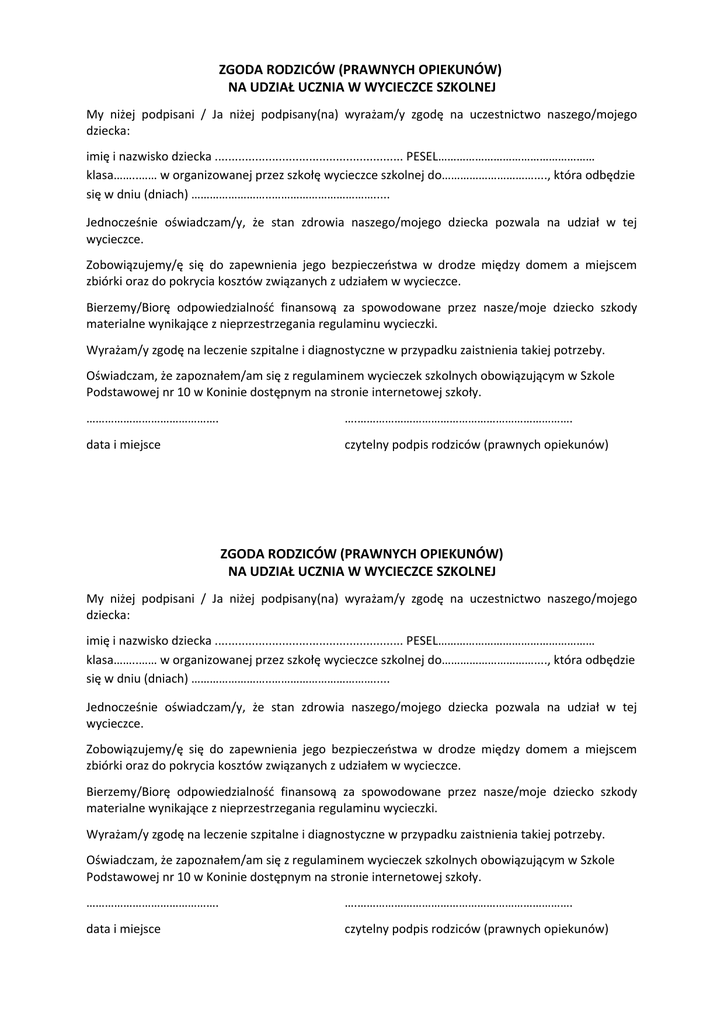 ZGODA RODZICÓW (PRAWNYCH OPIEKUNÓW) NA UDZIAŁ UCZNIA W WYCIECZCE SZKOLNEJ My niżej podpisani / Ja niżej podpisany(na) wyrażam/y zgodę na uczestnictwo naszego/mojego dziecka: imię i nazwisko dziecka ........................................................ PESEL…………………………………………… klasa……..…… w organizowanej przez szkołę wycieczce szkolnej do…………………………...., która odbędzie się w dniu (dniach) ……………………..……………………………..... Jednocześnie oświadczam/y, że stan zdrowia naszego/mojego dziecka pozwala na udział w tej wycieczce. Zobowiązujemy/ę się do zapewnienia jego bezpieczeństwa w drodze między domem a miejscem zbiórki oraz do pokrycia kosztów związanych z udziałem w wycieczce. Bierzemy/Biorę odpowiedzialność finansową za spowodowane przez nasze/moje dziecko szkody materialne wynikające z nieprzestrzegania regulaminu wycieczki. Wyrażam/y zgodę na leczenie szpitalne i diagnostyczne w przypadku zaistnienia takiej potrzeby. Oświadczam, że zapoznałem/am się z regulaminem wycieczek szkolnych obowiązującym w Szkole Podstawowej nr 10 w Koninie dostępnym na stronie internetowej szkoły. ……………………………………. ….……………………………………………………………. data i miejsce czytelny podpis rodziców (prawnych opiekunów) ZGODA RODZICÓW (PRAWNYCH OPIEKUNÓW) NA UDZIAŁ UCZNIA W WYCIECZCE SZKOLNEJ My niżej podpisani / Ja niżej podpisany(na) wyrażam/y zgodę na uczestnictwo naszego/mojego dziecka: imię i nazwisko dziecka ........................................................ PESEL…………………………………………… klasa……..…… w organizowanej przez szkołę wycieczce szkolnej do…………………………...., która odbędzie się w dniu (dniach) ……………………..……………………………..... Jednocześnie oświadczam/y, że stan zdrowia naszego/mojego dziecka pozwala na udział w tej wycieczce. Zobowiązujemy/ę się do zapewnienia jego bezpieczeństwa w drodze między domem a miejscem zbiórki oraz do pokrycia kosztów związanych z udziałem w wycieczce. Bierzemy/Biorę odpowiedzialność finansową za spowodowane przez nasze/moje dziecko szkody materialne wynikające z nieprzestrzegania regulaminu wycieczki. Wyrażam/y zgodę na leczenie szpitalne i diagnostyczne w przypadku zaistnienia takiej potrzeby. Oświadczam, że zapoznałem/am się z regulaminem wycieczek szkolnych obowiązującym w Szkole Podstawowej nr 10 w Koninie dostępnym na stronie internetowej szkoły. ……………………………………. ….……………………………………………………………. data i miejsce czytelny podpis rodziców (prawnych opiekunów)
