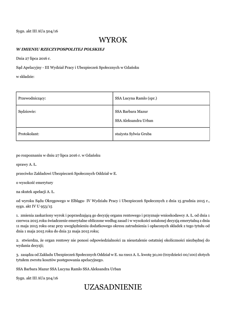 Sygn. akt III AUa 504/16 WYROK W IMIENIU RZECZYPOSPOLITEJ POLSKIEJ Dnia 27 lipca 2016 r. Sąd Apelacyjny - III Wydział Pracy i Ubezpieczeń Społecznych w Gdańsku w składzie: Przewodniczący: SSA Lucyna Ramlo (spr.) Sędziowie: SSA Barbara Mazur SSA Aleksandra Urban Protokolant: stażysta Sylwia Gruba po rozpoznaniu w dniu 27 lipca 2016 r. w Gdańsku sprawy A. Ł. przeciwko Zakładowi Ubezpieczeń Społecznych Oddział w E. o wysokość emerytury na skutek apelacji A. Ł. od wyroku Sądu Okręgowego w Elblągu- IV Wydziału Pracy i Ubezpieczeń Społecznych z dnia 15 grudnia 2015 r., sygn. akt IV U 953/15 1. zmienia zaskarżony wyrok i poprzedzającą go decyzję organu rentowego i przyznaje wnioskodawcy A. Ł. od dnia 1 czerwca 2015 roku świadczenie emerytalne obliczone według zasad i w wysokości ustalonej decyzją emerytalną z dnia 11 maja 2015 roku oraz przy uwzględnieniu dodatkowego okresu zatrudnienia i opłaconych składek z tego tytułu od dnia 1 maja 2015 roku do dnia 31 maja 2015 roku; 2. stwierdza, że organ rentowy nie ponosi odpowiedzialności za nieustalenie ostatniej okoliczności niezbędnej do wydania decyzji; 3. zasądza od Zakładu Ubezpieczeń Społecznych Oddział w E. na rzecz A. Ł. kwotę 30,00 (trzydzieści 00/100) złotych tytułem zwrotu kosztów postępowania apelacyjnego. SSA Barbara Mazur SSA Lucyna Ramlo SSA Aleksandra Urban Sygn. akt III AUa 504/16 UZASADNIENIE A. Ł. wniósł odwołanie od decyzji Zakładu Ubezpieczeń Społecznych Oddział w E. z dnia 18.06.2015r., którą to decyzją Zakład Ubezpieczeń Społecznych ustalił wysokość i podjął wypłatę emerytury. W uzasadnieniu odwołania skarżący wskazał, że wniosek o emeryturę zgłosił w marcu 2015r i wówczas ustalono mu emeryturę od 30.04.2015r tj. od osiągnięcia wieku emerytalnego w kwocie zaliczkowej, która wynosiła 3463,13zł, natomiast po podjęciu wypłaty emerytury, po zakończeniu zatrudnienia, z niezrozumiałych dla ubezpieczonego względów, organ rentowy ustalił wysokość świadczenia na 3168,91zł. W odpowiedzi na odwołanie pozwany Zakład Ubezpieczeń Społecznych Oddział w E. wniósł o jego oddalenie. Pozwany powołał przepisy art. 25 ust 3 ustawy z dnia 17.12.1998r. o emeryturach i rentach z Funduszu Ubezpieczeń Społecznych (Dz. U. Nr 39, poz. 353) wskazując, że w związku z podjęciem wypłaty od 1 czerwca kapitał początkowy został zwaloryzowany wskaźnikiem rocznym, a nie jak w decyzji zaliczkowej kwartalnym. Sąd Okręgowy w Elblągu Wydział IV Pracy i Ubezpieczeń Społecznych wyrokiem z dnia 15 grudnia 2015 r. oddalił odwołanie ubezpieczonego, powołując jako podstawę rozstrzygnięcia następujące ustalenia faktyczne i rozważania prawne. Skarżący A. Ł. w dniu 30 marca 2015r. złożył do organu rentowego wniosek o emeryturę. Decyzją z 11.05.2015r organ rentowy przyznał ubezpieczonemu zaliczkę na poczet przysługującej emerytury od 30.04.2015r tj. od osiągnięcia wieku emerytalnego. Wyliczona kwota zaliczkowa wynosiła 3463,13zł , w tym kwota składki zewidencjonowana na koncie z uwzględnieniem waloryzacji -195966,83 zł ,kwota zwaloryzowanego kapitału początkowego -709295,36zł ,średnie dalsze trwanie życia 261,40 miesięcy. Decyzja miała charakter zaliczkowy, albowiem z uwagi na kontynuowanie zatrudnienia wypłata emerytury została zawieszona. Wysokość zaliczki ustalono zgodnie z art. 25 ust 1ustawy o emeryturach i rentach z FUS, zgodnie z którym podstawę obliczenia emerytury, o której mowa w art. 24, stanowi kwota składek na ubezpieczenie emerytalne, z uwzględnieniem waloryzacji składek zewidencjonowanych na koncie ubezpieczonego do końca miesiąca poprzedzającego miesiąc, od którego przysługuje wypłata emerytury, zwaloryzowanego kapitału początkowego określonego w art. 173-175 oraz kwot środków zewidencjonowanych na subkoncie, o którym mowa w art. 40a ustawy z dnia 13 października 1998 r. o systemie ubezpieczeń społecznych, z zastrzeżeniem ust. 1a i 1b oraz art. 185. Stosownie do ust 3 cyt. przepisu waloryzację składek przeprowadza się corocznie, od dnia 1 czerwca każdego roku, poczynając od waloryzacji za rok 2000, z uwzględnieniem art. 25a. W wyniku przeprowadzonej waloryzacji stan konta nie może ulec obniżeniu. Art. 25a ustawy emerytalnej stanowi 1. Przy ustalaniu wysokości emerytury kwota składek na ubezpieczenie emerytalne zewidencjonowanych na koncie ubezpieczonego po dniu 31 stycznia roku, za który przeprowadzono ostatnią waloryzację, o której mowa w art. 25, jest waloryzowana kwartalnie. 2. W przypadku ustalania wysokości emerytury: 1)w pierwszym kwartale danego roku - ostatniej kwartalnej waloryzacji składek dokonuje się za trzeci kwartał poprzedniego roku; 2)w drugim kwartale danego roku - ostatniej kwartalnej waloryzacji składek dokonuje się za czwarty kwartał poprzedniego roku; 3)w trzecim kwartale danego roku - ostatniej kwartalnej waloryzacji składek dokonuje się za pierwszy kwartał danego roku; 4)w czwartym kwartale danego roku - ostatniej kwartalnej waloryzacji składek dokonuje się za drugi kwartał danego roku. 3. Waloryzacji kwartalnej podlega kwota składek zewidencjonowanych na ostatni dzień pierwszego miesiąca kwartału, za który przeprowadzana jest waloryzacja, powiększona o kwoty uzyskane w wyniku poprzednich waloryzacji kwartalnych. 4. Waloryzacja kwartalna składek polega na pomnożeniu zewidencjonowanych na koncie ubezpieczonego składek przez wskaźnik waloryzacji określony w ust. 5. W wyniku przeprowadzonej waloryzacji stan konta nie może ulec obniżeniu. 5. Wskaźnik waloryzacji kwartalnej składek jest równy wskaźnikowi cen towarów i usług konsumpcyjnych ogółem w kwartale, za który przeprowadzana jest waloryzacja w stosunku do poprzedniego kwartału, powiększonemu o wzrost realny sumy przypisu składek na ubezpieczenie emerytalne w kwartale, za który przeprowadzana jest waloryzacja w stosunku do kwartału poprzedniego. Wskaź