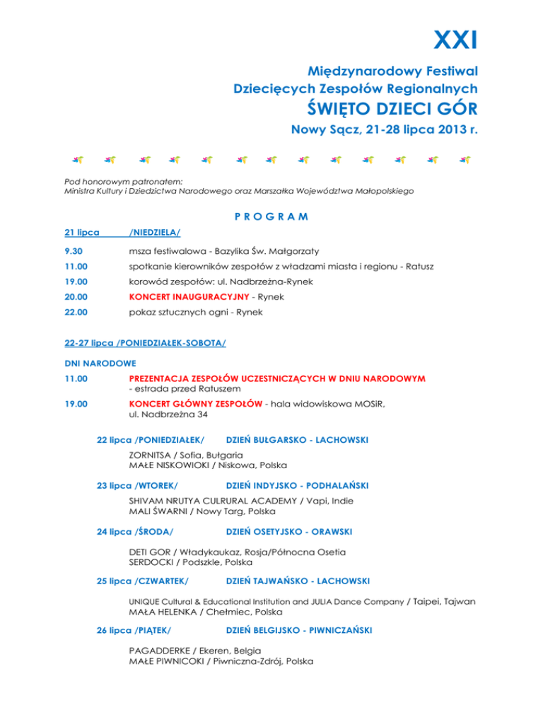 XXI Międzynarodowy Festiwal Dziecięcych Zespołów Regionalnych ŚWIĘTO DZIECI GÓR Nowy Sącz, 21-28 lipca 2013 r. Pod honorowym patronatem: Ministra Kultury i Dziedzictwa Narodowego oraz Marszałka Województwa Małopolskiego PROGRAM 21 lipca /NIEDZIELA/ 9.30 msza festiwalowa - Bazylika Św. Małgorzaty 11.00 spotkanie kierowników zespołów z władzami miasta i regionu - Ratusz 19.00 korowód zespołów: ul. Nadbrzeżna-Rynek 20.00 KONCERT INAUGURACYJNY - Rynek 22.00 pokaz sztucznych ogni - Rynek 22-27 lipca /PONIEDZIAŁEK-SOBOTA/ DNI NARODOWE 11.00 PREZENTACJA ZESPOŁÓW UCZESTNICZĄCYCH W DNIU NARODOWYM - estrada przed Ratuszem 19.00 KONCERT GŁÓWNY ZESPOŁÓW - hala widowiskowa MOSiR, ul. Nadbrzeżna 34 22 lipca /PONIEDZIAŁEK/ DZIEŃ BUŁGARSKO - LACHOWSKI ZORNITSA / Sofia, Bułgaria MAŁE NISKOWIOKI / Niskowa, Polska 23 lipca /WTOREK/ DZIEŃ INDYJSKO - PODHALAŃSKI SHIVAM NRUTYA CULRURAL ACADEMY / Vapi, Indie MALI ŚWARNI / Nowy Targ, Polska 24 lipca /ŚRODA/ DZIEŃ OSETYJSKO - ORAWSKI DETI GOR / Władykaukaz, Rosja/Północna Osetia SERDOCKI / Podszkle, Polska 25 lipca /CZWARTEK/ DZIEŃ TAJWAŃSKO - LACHOWSKI UNIQUE Cultural & Educational Institution and JULIA Dance Company / Taipei, Tajwan MAŁA HELENKA / Chełmiec, Polska 26 lipca /PIĄTEK/ DZIEŃ BELGIJSKO - PIWNICZAŃSKI PAGADDERKE / Ekeren, Belgia MAŁE PIWNICOKI / Piwniczna-Zdrój, Polska 27 lipca /SOBOTA/ DZIEŃ AFRYKAŃSKO - UKRAIŃSKO - ŻYWIECKI FREESPIRIT / Moree, Ghana GORGANY / Lwów, Ukraina HULAJNIKI / Milówka, Polska 28 LIPCA /NIEDZIELA/ 9.30 msza festiwalowa - Bazylika Św. Małgorzaty 10.30 pożegnanie miasta - Rynek 11.30 finisaż wystawy fotograficznej członków Grupy Twórczej WIDZI SIĘ, Galeria SOKÓŁ, ul. Długosza 3 12.00 konferencja prasowa - Małopolskie Centrum Kultury SOKÓŁ, sala Sichrawy 19.00 KONCERT FINAŁOWY - hala widowiskowa MOSiR, ul. Nadbrzeżna 34 Imprezy towarzyszące: lipiec, wystawa fotografii: Święto Dzieci Gór 2012 w obiektywie członków Grupy Twórczej WIDZI SIĘ - Galeria SOKÓŁ, ul. Długosza 3 10-31 lipca, plenerowa wystawa fotografii: ŚWIĘTO DZIECI GÓR w obiektywie Sylwestra i Jakuba Adamczyków - Szczawnica, Plac Dietla 22-28 lipca, godz. 18.00 -21.00, kiermasz twórczości ludowej i rękodzieła artystycznego - plac przed Halą MOSiR, ul. Nadbrzeżna 34 Estrady plenerowe poza Nowym Sączem: 23 lipca, godz. 18.30 25 -26 lipca, godz. 19.00 27 lipca, godz. 16.30 27 lipca, godz. 18.00 27 lipca, godz. 17.30 Szczawnica, Dworek Gościnny Krynica Zdrój, Estrada na Deptaku Bardejov (Słowacja), Estrada w Rynku Muszyna, Amfiteatr Zapopradzie Tylicz, Osada Turystyczna „Domki w lesie” Zajęcia edukacyjne: "Pod górkę - plastyczny survival" 22-26 lipca, godz. 12.00 -13.00 - zajęcia plastyczne dla dzieci (10 -13 lat) Galeria Sztuki Współczesnej BWA SOKÓŁ, ul. Długosza 3 W trakcie warsztatów dzieci zapoznają się z wybranymi zjawiskami sztuki współczesnej narodów uczestniczących w festiwalu a zdobytą wiedzę wykorzystają w różnego rodzaju działaniach plastycznych. Motywem przewodnim zajęć będzie tworzenie Sztucznej Góry w przestrzeni Galerii BWA SOKÓŁ. Bilet: 5 zł od osoby za spotkanie (20 zł za cały cykl). Ilość miejsc ograniczona! Zapisy obowiązkowe - Dominika Jarmolińska, tel. 18 534 06 77, e-mail: [email protected] www.swietodziecigor.pl