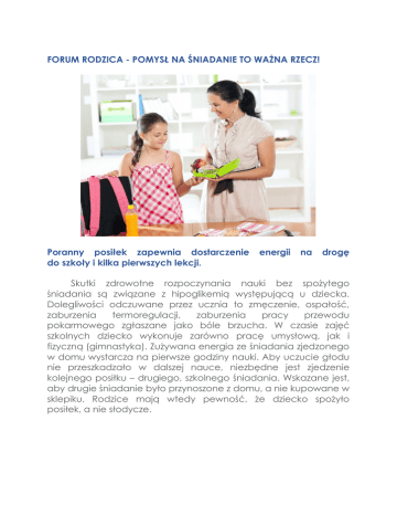 FORUM RODZICA - POMYSŁ NA ŚNIADANIE TO WAŻNA RZECZ! Poranny posiłek zapewnia dostarczenie do szkoły i kilka pierwszych lekcji. energii na drogę Skutki zdrowotne rozpoczynania nauki bez spożytego śniadania są związane z hipoglikemią występującą u dziecka. Dolegliwości odczuwane przez ucznia to zmęczenie, ospałość, zaburzenia termoregulacji, zaburzenia pracy przewodu pokarmowego zgłaszane jako bóle brzucha. W czasie zajęć szkolnych dziecko wykonuje zarówno pracę umysłową, jak i fizyczną (gimnastyka). Zużywana energia ze śniadania zjedzonego w domu wystarcza na pierwsze godziny nauki. Aby uczucie głodu nie przeszkadzało w dalszej nauce, niezbędne jest zjedzenie kolejnego posiłku – drugiego, szkolnego śniadania. Wskazane jest, aby drugie śniadanie było przynoszone z domu, a nie kupowane w sklepiku. Rodzice mają wtedy pewność, że dziecko spożyło posiłek, a nie słodycze. Kilka śniadaniowych rad:  Zamień czasem pieczywo pszenne na pełnoziarniste. Pyszne jest pieczywo z pestkami słonecznika, dyni lub suszoną śliwką. Na pewno takie urozmaicenie spodoba się dziecku.  Wybierz śniadaniówkę, która będzie miała dobre zamknięcie i nie otworzy się w plecaku. Wybierz kolorowe pudełeczka razem z dzieckiem - wtedy zachęcisz je do ich używania!  Oprócz kanapki dodaj małe przekąski w postaci orzechów oraz suszonych owoców – coś do pochrupania na każdej przerwie.  Warzywa oraz owoce podawaj w małych porcjach, które będą łatwe do zjedzenia w czasie krótkiej przerwy.  Wkładaj do śniadaniówki chusteczki nawilżające, aby twoje dziecko miało zawsze czyste ręce przed jedzeniem.  Zamiast kanapek możesz zrobić do szkoły sałatkę, makaron czy ryż z warzywami.  Wodę czy sok zastąp od czasu do czasu owocowym koktajlem słodzonym miodem.
