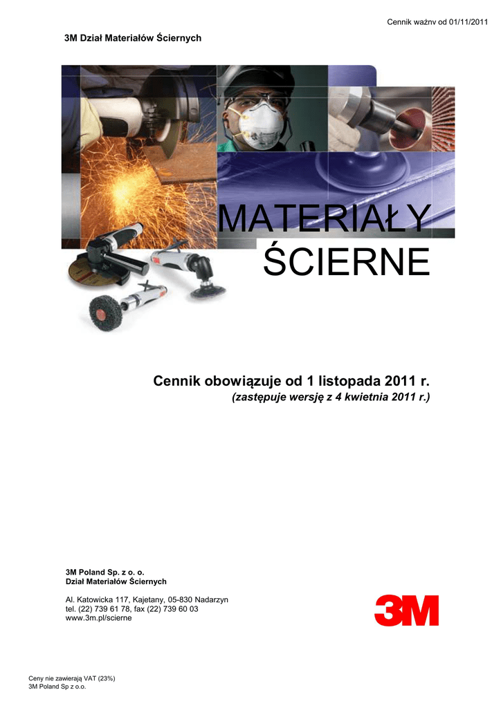 Cennik ważny od 01/11/2011 3M Dział Materiałów Ściernych MATERIAŁY ŚCIERNE Cennik obowiązuje od 1 listopada 2011 r. (zastępuje wersję z 4 kwietnia 2011 r.) 3M Poland Sp. z o. o. Dział Materiałów Ściernych Al. Katowicka 117, Kajetany, 05-830 Nadarzyn tel. (22) 739 61 78, fax (22) 739 60 03 www.3m.pl/scierne Ceny nie zawierają VAT (23%) 3M Poland Sp z o.o. Cennik ważny od 01/11/2011 3M Poland Sp. z o.o. Dział Materiałów Ściernych Al. Katowicka 117, 05-830 Nadarzyn tel. (22) 739 60 00, fax (22) 739 60 03 CENNIK PRODUKTÓW 3M DZIAŁ MATERIAŁÓW ŚCIERNYCH obowiązuje od 1 listopada 2011r., zastępuje wersję z dnia 4 kwietnia 2011r. WARUNKI SPRZEDAŻY 1. Ceny podane w cenniku są cenami netto, dla użytkownika końcowego. Do podanych cen należy doliczyć podatek VAT w wysokości 23%. 2. Minimalna, realizowana przez 3M wartość zamówienia wynosi 5000 PLN netto (po uwzględnieniu rabatów). Zamówienia poniżej podanej wartości realizowane będą na koszt Klienta – odbiór własny lub wysyłka firmą spedycyjną Spedpol. 3. Zwroty towaru następują tylko po wcześniejszym uzgodnieniu z pracownikiem Działu Obsługi Klienta i mogą być realizowane wyłącznie za pośrednictwem Spedpolu. 4. Towar w ramach reklamacji jakościowych do wartości 500 PLN pozostaje u Klienta. Przy najbliższej wizycie towar odbiera lub niszczy Przedstawiciel Handlowy. 5. Minimalne wielkości zamawianych produktów muszą być zgodne z ilościami podanymi w cenniku. 6. Produkty wyszczególnione szarym tłem, powinny być na bieżąco w magazynie 3M Poland. 7. Termin realizacji zamówienia na pozostałe produkty wynosi od 4 do 6 tygodni. 8. Realizowane są wyłącznie pisemne zamówienia. 9. Zamówienia prosimy kierować na nr faksu: (022) 739 60 03 lub e-mail: [email protected] (produkty z marką 3M) [email protected] (produkty z marka Unifam) 10. Warunki handlowe uzgadniane są indywidualnie. Wszelkie pytania dotyczące informacji zawartych w cenniku prosimy kierować do Przedstawicieli Handlowych odpowiedzialnych za dany region lub do pracowników Działu Obsługi Klienta. Dyrektor Sprzedaży i Marketingu: Wojciech Gibas tel. 0 602 416 041 Przedstawiciele Handlowi: Damian Drobnica tel. 0 602 115 178 - kierownik regionu małopolskie, świętokrzyskie, Podkarpackie,Lubelskie, Śląskie Michał Gabryś tel. 0 602 410 909 - kierownik regionu: opolskie, lubuskie, zachodniopomorskie, kujawsko-pomorskie, pomorskie, dolnośląskie, wielkopolskie Dariusz Gracjasz tel. 0 606 785 220 - województwo zachodnio - pomorskie, Bartosz Miąsik tel. 600 942 486 pomorskie, warmińsko - mazurskie, podlaskie Piotr Ossowski tel. 0 602 443 250 - województwo wielkopolskie i kujawsko-pomorskie Paweł Paduch, tel. 0 606 422 868 - województwo lubelskie i podkarpackie Piotr Siwiec, tel. 0 608 652 128 - województwo małopolskie Damian Drobnica, tel. 0 602 115 178 - województwo śląskie i świętokrzyskie Waldemar Janoszka, tel. 0 668 280 564 - województwo dolnośląskie i opolskie Ryszard Śliwkiewicz, tel. 0 608 402 007 - województwo mazowieckie i łódzkie Inżynier serwisu technicznego Kamil Babski - 662 246 098 Dział Obsługi Klienta: Anna Pawełkiewicz tel. (022) 739 62 07 Urszula Adamczyk tel. (022) 739 62 09 Dział Marketingu: Magdalena Maleszewska , tel.662 274 292, (022) 739 61 77 Marta Pianko - tel 664 138 582, (022) 739 61 97 Maciej Czubak - tel. (022) 739 61 78 Ceny nie zawierają VAT (23%) 3M Poland Sp z o.o. Cennik ważny od 01/11/2011 CENNIK OBOWIĄZUJE OD 01.11.2011r. Spis treści: Strony Urządzenia Elektronarzędzia 3M 4 Urządzenia Pneumatyczne szlifierki oscylacyjne 3M 5 Urządzenia Pneumatyczne narzędzia 3M 7 Urządzenia Podkładki do narzędzi elektrycznych oraz pneumatycznych 9 Materiały nasypowe Pasy 984F 36+,60+,80+ 12-14 Materiały nasypowe Arkusze papierowe WOD 13 Materiały nasypowe Gąbki ścierne 14 Materiały nasypowe System Hookit™ Materiały nasypowe Krążki mikrościerne na podłożu z folii 19 Materiały nasypowe System Hookit - Akcesoria 20 Materiały nasypowe Tarcze do cięcia Materiały nasypowe Tarcze do szlifowania Materiały nasypowe Dyski fibrowe Materiały nasypowe Dyski Green Corps™ Materiały nasypowe Dyski Lamelkowe Materiały nasypowe Dyski Roloc™ 31 Scotch-Brite Dyski Roloc™ 32 Scotch-Brite Dyski Scotch-Brite™ Surface Conditioning 33 Scotch-Brite Szczotki i ściernice walcowe Scotch-Brite™ 34 Scotch-Brite Szczotki Scotch-Brite™ na trzpieniu 35 Scotch-Brite Koła nawijane 36 Scotch-Brite Koła DL-WM 36 Scotch-Brite Clean&Strip 37 Scotch-Brite Arkusze ręczne 38 Scotch-Brite Rolki 39 Scotch-Brite Szczotki BB-ZB 40 Scotch-Brite Szczotki BB-ZS na trzpieniu 41 Scotch-Brite Dyski typu BRISTLE 42 Mikrościerne Imperial Film 43 Mikrościerne Do usuwania wtrąceń 44 Mikrościerne Akcesoria 45 Szlifowanie krawędzi szkła i szyb zespolonych Usuwanie rys na szkle Index Ceny nie zawierają VAT (23%) 3M Poland Sp z o.o. 15-18 21-22 23 24-26 27 28-30 46 47 index Cennik ważny od 01/11/2011 ELEKTRONARZĘDZIA 3M Elektronarzędzia 3M NOWOŚĆ! Od podanych cen katalogowych elektrycznych szlifierek kątowych nie obowiązuje standardowy rabat dystrybutora Produkt Model Moc (W) Obroty /min Min.zam. Cena/szt. Numer katalogowy Kątówka elektryczna z regulacją obrotów 64864 1250 6000-12000 1 495,00 DC272926700 Kątówka elektryczna bez regulacji obrotów 64869 1010 12000 1 435,00 DC272926734 Produkt Średnica (mm) Moc (W) Obroty /min Min.zam. Cena/szt. Numer katalogowy Polerka elektryczna 240V 200 1100 700-1850 1 1 550,00 DC272925512 Elektryczna szlifierka oscylacyjna 3/16" 240V 150 450 5000-10000 1 980,00 DC272925439 Elektryczna szlifierka oscylacyjna 3/32" 240V 150 450 5000-10000 1 980,00 DC272925470 Odkurzacze przemysłowe 3M Działają zarówno z narzędziami elektrycznymi, jaki i pneumatycznymi 3M. Produkt Pojemność (litr) Ciśnienie (hPa) Moc (W) Min.zam. Cena/szt. Numer katalogowy Odkurzacz przemysłowy (klasa L) 25 248 1400 1 2 600,00 DC272925561 Odkurzac