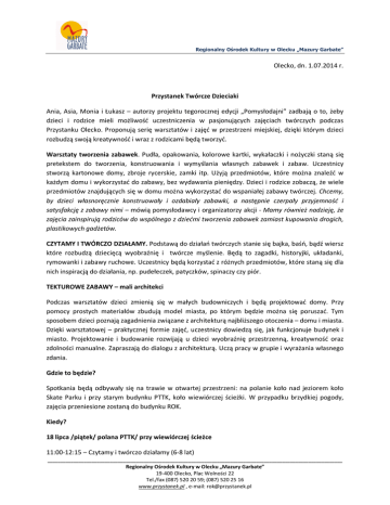 Regionalny Ośrodek Kultury w Olecku „Mazury Garbate” Olecko, dn. 1.07.2014 r. Przystanek Twórcze Dzieciaki Ania, Asia, Monia i Łukasz – autorzy projektu tegorocznej edycji „Pomysłodajni” zadbają o to, żeby dzieci i rodzice mieli możliwość uczestniczenia w pasjonujących zajęciach twórczych podczas Przystanku Olecko. Proponują serię warsztatów i zajęć w przestrzeni miejskiej, dzięki którym dzieci rozbudzą swoją kreatywność i wraz z rodzicami będą tworzyć. Warsztaty tworzenia zabawek. Pudła, opakowania, kolorowe kartki, wykałaczki i nożyczki staną się pretekstem do tworzenia, konstruowania i wymyślania własnych zabawek i zabaw. Uczestnicy stworzą kartonowe domy, zbroje rycerskie, zamki itp. Użyją przedmiotów, które można znaleźć w każdym domu i wykorzystać do zabawy, bez wydawania pieniędzy. Dzieci i rodzice zobaczą, że wiele przedmiotów znajdujących się w domu można wykorzystać do wspaniałej zabawy twórczej. Chcemy, by dzieci własnoręcznie konstruowały i ozdabiały zabawki, a następnie czerpały przyjemność i satysfakcję z zabawy nimi – mówią pomysłodawcy i organizatorzy akcji - Mamy również nadzieję, że zajęcia zainspirują rodziców do wspólnego z dziećmi tworzenia zabawek zamiast kupowania drogich, plastikowych gadżetów. CZYTAMY I TWÓRCZO DZIAŁAMY. Podstawą do działań twórczych stanie się bajka, baśń, bądź wiersz które rozbudzą dziecięcą wyobraźnię i twórcze myślenie. Będą to zagadki, historyjki, układanki, rymowanki i zabawy ruchowe. Uczestnicy będą korzystać z różnych przedmiotów, które staną się dla nich inspiracją do działania, np. pudełeczek, patyczków, spinaczy czy piór. TEKTUROWE ZABAWY – mali architekci Podczas warsztatów dzieci zmienią się w małych budowniczych i będą projektować domy. Przy pomocy prostych materiałów zbudują model miasta, po którym będzie można się poruszać. Tym sposobem dzieci poznają zagadnienia związane z architekturą najbliższego otoczenia – domu i miasta. Dzięki warsztatowej – praktycznej formie zajęć, uczestnicy dowiedzą się, jak funkcjonuje budynek i miasto. Projektowanie i budowanie rozwijają u dzieci wyobraźnię przestrzenną, kreatywność oraz zdolności manualne. Zapraszają do dialogu z architekturą. Uczą pracy w grupie i wyrażania własnego zdania. Gdzie to będzie? Spotkania będą odbywały się na trawie w otwartej przestrzeni: na polanie koło nad jeziorem koło Skate Parku i przy starym budynku PTTK, koło wiewiórczej ścieżki. W przypadku brzydkiej pogody, zajęcia przeniesione zostaną do budynku ROK. Kiedy? 18 lipca /piątek/ polana PTTK/ przy wiewiórczej ścieżce 11:00-12:15 – Czytamy i twórczo działamy (6-8 lat) _________________________________________________________________________________________________________________ Regionalny Ośrodek Kultury w Olecku „Mazury Garbate” 19-400 Olecko, Plac Wolności 22 Tel./fax (087) 520 20 59; (087) 520 25 16 www.przystanek.pl , e-mail: [email protected] Regionalny Ośrodek Kultury w Olecku „Mazury Garbate” 12:30 – Akcja „Namaluj Łosia – Króla Przystanku Olecko” (4-8 lat) 19 lipca /sobota/ polana przy Skate Parku 11:00-12:30 – Warsztat tworzenia zabawek (3-5 lat) 13:30-15:00 – Tekturowe zabawy – Mali architekci (6-8 lat) 20 lipca/niedziela/ polana PTTK, przy wiewiórczej ścieżce 11:00-12:30 – Czytamy i twórczo działamy (3-5 lat) Jak można się zapisać? Wystarczy wypełnić formularz na stronie www.przystanekdzieciaki.pl Decyduje kolejność zgłoszeń. Zapisy ruszają 2 lipca 2014. Udział w zajęciach jest bezpłatny. _________________________________________________________________________________________________________________ Regionalny Ośrodek Kultury w Olecku „Mazury Garbate” 19-400 Olecko, Plac Wolności 22 Tel./fax (087) 520 20 59; (087) 520 25 16 www.przystanek.pl , e-mail: [email protected]