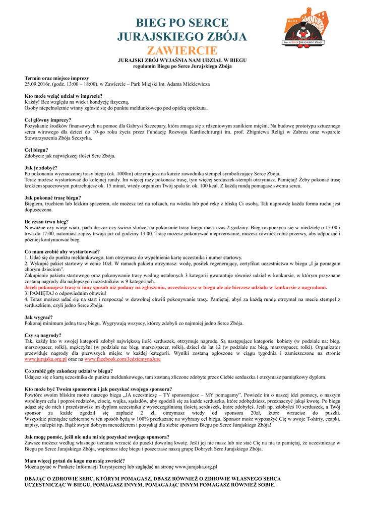 BIEG PO SERCE JURAJSKIEGO ZBÓJA ZAWIERCIE JURAJSKI ZBÓJ WYJAŚNIA NAM UDZIAŁ W BIEGU regulamin Biegu po Serce Jurajskiego Zbója Termin oraz miejsce imprezy 25.09.2016r, (godz. 13:00 – 18:00), w Zawiercie – Park Miejski im. Adama Mickiewicza Kto może wziąć udział w imprezie? Każdy! Bez względu na wiek i kondycję fizyczną. Osoby niepełnoletnie winny zgłosić się do punktu meldunkowego pod opieką opiekuna. Cel główny imprezy? Pozyskanie środków finansowych na pomoc dla Gabrysi Szczepary, która zmaga się z rdzeniowym zanikiem mięśni. Na budowę prototypu sztucznego serca wirowego dla dzieci do 10-go roku życia przez Fundację Rozwoju Kardiochirurgii im. prof. Zbigniewa Religi w Zabrzu oraz wsparcie Stowarzyszenia Zbója Szczyrka. Cel biegu? Zdobycie jak największej ilości Serc Zbója. Jak je zdobyć? Po pokonaniu wyznaczonej trasy biegu (ok. 1000m) otrzymujesz na karcie zawodnika stempel symbolizujący Serce Zbója. Teraz możesz wystartować do kolejnej rundy. Im więcej razy pokonasz trasę, tym więcej serduszek-stempli otrzymasz. Pamiętaj! Żeby pokonać trasę krokiem spacerowym potrzebujesz ok. 15 minut, wtedy organizm Twój spala śr. ok. 100 kcal. Z każdą rundą pomagasz swemu sercu. Jak pokonać trasę biegu? Biegiem, truchtem lub lekkim spacerem, ale możesz też na rolkach, na wózku lub pod rękę z bliską Ci osobą. Tak naprawdę każda forma ruchu jest dopuszczona. Ile czasu trwa bieg? Nieważne czy wieje wiatr, pada deszcz czy świeci słońce, na pokonanie trasy biegu masz czas 2 godziny. Bieg rozpoczyna się w niedzielę o 15:00 i trwa do 17:00, natomiast zapisy trwają już od godziny 13:00. Trasę możesz pokonywać nieprzerwanie, możesz również robić przerwy, aby odpocząć i później kontynuować bieg. Co mam zrobić aby wystartować? 1. Udać się do punktu meldunkowego, tam otrzymasz do wypełnienia kartę uczestnika i numer startowy. 2. Wykupić pakiet startowy w cenie 10zł. W ramach pakietu otrzymasz: wodę, posiłek regenerujący, certyfikat uczestnictwa w biegu „I ja pomagam chorym dzieciom”. Zakupienie pakietu startowego oraz pokonywanie trasy według ustalonych 3 kategorii gwarantuje również udział w konkursie, w którym przyznane zostaną nagrody dla najlepszych uczestników w 9 kategoriach. Jeżeli pokonujesz trasę w inny sposób niż podany na zgłoszeniu, uczestniczysz w biegu ale nie bierzesz udziału w konkursie z nagrodami. 3. PAMIĘTAJ o odpowiednim obuwiu! 4. Teraz możesz udać się na start i rozpocząć w dowolnej chwili pokonywanie trasy. Pamiętaj, abyś za każdą rundę otrzymał na mecie stempel z serduszkiem, czyli jedno Serce Zbója. Jak wygrać? Pokonaj minimum jedną trasę biegu. Wygrywają wszyscy, którzy zdobyli co najmniej jedno Serce Zbója. Czy są nagrody? Tak, każdy kto w swojej kategorii zdobył największą ilość serduszek, otrzymuje nagrodę. Są następujące kategorie: kobiety (w podziale na: bieg, marsz/spacer, rolki), mężczyźni (w podziale na: bieg, marsz/spacer, rolki), dzieci do lat 12 (w podziale na: bieg, marsz/spacer, rolki). Organizator przewiduje nagrody dla pierwszych miejsc w każdej kategorii. Wyniki zostaną ogłoszone w ciągu tygodnia i zamieszczone na stronie www.jurajska.org.pl oraz na www.facebook.com/JedziemynaJure Co zrobić gdy zakończę udział w biegu? Udajesz się z kartą uczestnika do punktu meldunkowego, tam zostaną zliczone zdobyte przez Ciebie serduszka i otrzymasz pamiątkowy dyplom. Kto może być Twoim sponsorem i jak pozyskać swojego sponsora? Powtórz swoim bliskim motto naszego biegu „JA uczestniczę – TY sponsorujesz – MY pomagamy”. Powiedz im o naszej idei pomocy, o naszym wspólnym celu i poproś rodziców, ciocię, wujka, sąsiadów, aby zgodzili się za każde serduszko, które zdobędziesz, przeznaczyć jakąś kwotę. Po biegu udasz się do nich i przedstawisz im dyplom uczestnika z wyszczególnioną ilością serduszek, które zdobyłeś. Jeśli np. zdobyłeś 10 serduszek, a Twój sponsor za każde zgodził się zapłacić 2 zł, otrzymasz wtedy od sponsora 20zł, które wrzucisz do puszki. Wszystkie pieniądze uzbierane w ten sposób będą w 100% przekazane na wybrany cel biegu. Sponsor może wyposażyć Cię w swoje T-shirty, czapki, napisy, nalepki itp. Bądź swym dobrym menedżerem i pozyskaj dla siebie sponsora Biegu po Serce Jurajskiego Zbója! Jak mogę pomóc, jeśli nie uda mi się pozyskać swojego sponsora? Zawsze możesz według własnego uznania wrzucić do puszki dowolną kwotę. Jeśli jej nie masz lub nie stać Cię na nią to pamiętaj, że uczestnicząc w Biegu po Serce Jurajskiego Zbója, wspierasz ideę biegu i poszerzasz naszą grupę Dobrych Serc Jurajskiego Zbója. Mam więcej pytań do kogo mam się zwrócić? Można pytać w Punkcie Informacji Turystycznej lub zaglądać na stronę www.jurajska.org.pl DBAJĄC O ZDROWIE SERC, KTÓRYM POMAGASZ, DBASZ RÓWNIEŻ O ZDROWIE WŁASNEGO SERCA UCZESTNICZĄC W BIEGU, POMAGASZ INNYM, POMAGAJĄC INNYM POMAGASZ RÓWNIEŻ SOBIE.