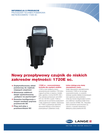 INFORMACJA O PRODUKCIE PROCESOWA TECHNIKA POMIAROWA MĘTNOŚCIOMIERZ 1720E SC Nowy przepływowy czujnik do niskich zakresów mętności: 1720E sc. ➔ Zoptymalizowany układ pomiarowy do najdrobniejszych zmętnień ➔ Eliminacja zakłóceń dzięki opatentowanej „pułapce na pęcherzyki” ➔ Dowolna konfiguracja z innymi sondami poprzez przetwornik SC ➔ Plug and play z przetwornikami SC 1720E sc – nowocześniejsza technika dla czystych mediów. 1720E sc jest następcą znanej i sprawdzonej serii czujników 1720 dokonujących pomiaru w oparciu o światło białe, zgodnie z normą US-EPA 180.1. Przy zakresie pomiarowym od 0,0001 NTU do 100 NTU czujnik 1720E sc zalecany jest do pomiarów przejrzystych i mało zmętnionych mediów. Zastosowanie 1720E sc gwarantuje optymalne sterowanie filtracją w komunalnym i przemysłowym uzdatnianiu wody. Łatwa obsługa przy dużej oszczędności czasu. Dzięki odpowiednio zaprojektowanej konstrukcji 1720E sc nie wymaga czyszczenia kuwety, co wyrażnie redukuje wysokie nakłady konserwacyjne oraz ogranicza czas przestojów. Unika się również długotrwałych przerw przy kalibracji i weryfikacji dzięki stosowaniu wzorców STABL CAL. Wszystkie dane pomiarowe opracowywane są cyfrowo, w sposób niezawodny i efektywny przez przetwornik SC. PROCESOWA TECHNIKA POMIAROWA_MĘTNOŚCIOMIERZ 1720E SC Usługi HACH LANGE. Pomoc na miejscu świadczona przez Przedstawicieli Regionalnych. Wymiary mętnościomierza 1720E sc: 524 x 305 x 406 mm (szer. x wys. x głęb.), wymaga 254 mm wolnej przestrzeni (od góry). Dane techniczne. Metoda pomiaru Max. 50 °C Temperatura próbki Temperatura otoczenia Przy jednym czujniku: +2 do +50 °C; Przy dwóch czujnikach: +2 °C do +40 °C Dopływ próbki: gwint wewnętrzny 1/4" NPT Przyłączenie próbki Odpływ próbki: gwint wewnętrzny: 1/2" NPT (króćce węża w zakresie dostawy) Materiały Klasa ochrony Konserwacja Ciężar Jednostka pomiarowa Odporny na korozję polistyrol NEMA 4X /IP 66 1,5 h/miesiąc Ok. 4,54 kg Uniwersalny przetwornik SC 100 (model LXV401) lub SC 1000 (model LXV400 i model LXV402) Informacje do zamówienia. OPIS Przepływowy czujnik do pomiaru mętności 1720E sc z kablem dł. 2m AKCESORIA Wzorzec mętności: formazyna 4000 NTU Zestaw do kalibracji formazyna (cylinder do kalibracji, pipeta TenSette, butelka 500 ml 4000 NTU wzorzec pierwotny formazyny) Filtr membranowy 0,2 µm do kontroli punktu zerowego (bez węża) Wzorzec kalibracyjny STABLCAL - > 0,1 NTU (1 l) - 1 NTU (1 l) - 20 NTU (1 l) Weryfikator ICE-PIC / moduł kalibracyjny (wzorzec stałocząsteczkowy) - 1 NTU - 20 NTU Kabel przedłużający dł. 7 m Ochronny daszek przeciwsłoneczny Stojak montażowy CZĘŚCI ZAMIENNE I ZUŻYWAJĄCE SIĘ Lampa wolframowo-fotometryczna Zatyczka do odpływu próbki NR. ZAM. LPV417.99.00001 LCW813 44156-00 EXF014 26597-53 26598-53 26601-53 52215-00 52250-00 58659-00 58690-00 52160-00 18950-00 44116-00 DOC 053.60.03714.Apr04 Oparta na 90° świetle rozproszonym zgodnie z USEPA 180.1 (wolframowe światło białe) 0,0001-100 NTU (TE/F, mg/l) programowalny Zakres pomiarowy 0,0001-9.9999 / 10,000-99,999 Rozdzielczość ±0,015 NTU lub. ±2 % (0-10 NTU), Dokładność ±5 % (10-40 NTU), ±10 % (40-100 NTU) ±0,002 NTU lub. ±1,0% Powtarzalność Współczynnik wariacji 1 % według normy DIN 38402 6, 30, 60, 90 s (programowalny), Czas zadziałania 75 s w pełnym zakresie pomiarowym Fizyczna, poprzez opatentowaną „pułapkę na Kompensacja pęcherzyków powietrza pęcherzyki” Przy pomocy wzorców formazyny lub STABL Kalibracja CAL Wzorzec stałocząsteczkowy ICE-PIC lub STABL Weryfikacja CAL Min. 0,25 l/min, max. 0,75 l/min Zapotrzebowanie na próbki