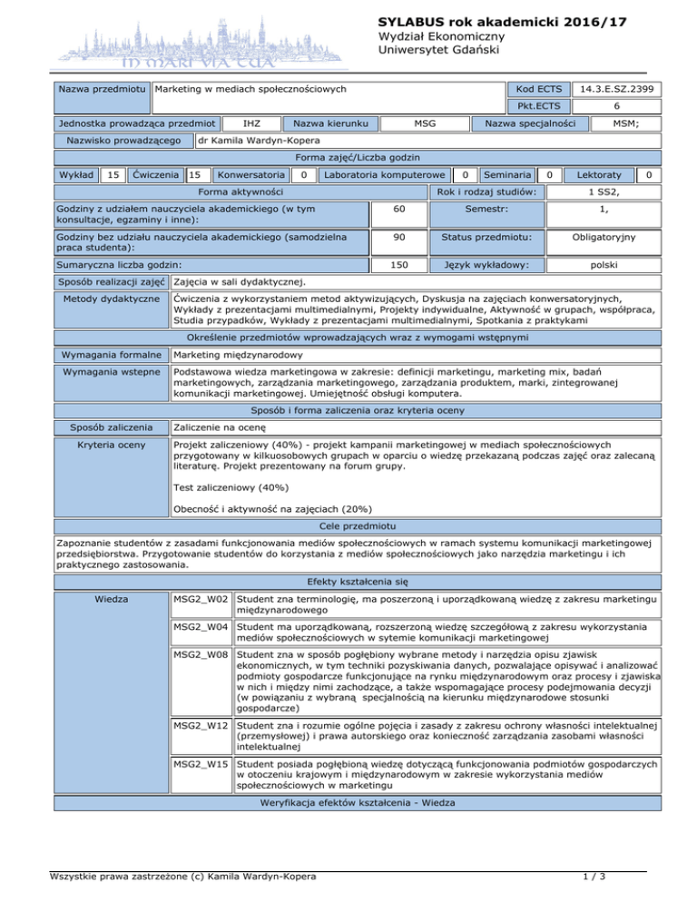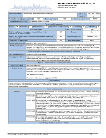 SYLABUS rok akademicki 2016/17 Wydział Ekonomiczny Uniwersytet Gdański Nazwa przedmiotu Marketing w mediach społecznościowych Jednostka prowadząca przedmiot Nazwisko prowadzącego IHZ Nazwa kierunku MSG Kod ECTS 14.3.E.SZ.2399 Pkt.ECTS 6 Nazwa specjalności MSM; dr Kamila Wardyn-Kopera Forma zajęć/Liczba godzin Wykład 15 Ćwiczenia 15 Konwersatoria 0 Laboratoria komputerowe Forma aktywności 0 Seminaria 0 Lektoraty Rok i rodzaj studiów: 1 SS2, Godziny z udziałem nauczyciela akademickiego (w tym konsultacje, egzaminy i inne): 60 Semestr: 1, Godziny bez udziału nauczyciela akademickiego (samodzielna praca studenta): 90 Status przedmiotu: Obligatoryjny 150 Język wykładowy: polski Sumaryczna liczba godzin: 0 Sposób realizacji zajęć Zajęcia w sali dydaktycznej. Metody dydaktyczne Ćwiczenia z wykorzystaniem metod aktywizujących, Dyskusja na zajęciach konwersatoryjnych, Wykłady z prezentacjami multimedialnymi, Projekty indywidualne, Aktywność w grupach, współpraca, Studia przypadków, Wykłady z prezentacjami multimedialnymi, Spotkania z praktykami Określenie przedmiotów wprowadzających wraz z wymogami wstępnymi Wymagania formalne Marketing międzynarodowy Wymagania wstepne Podstawowa wiedza marketingowa w zakresie: definicji marketingu, marketing mix, badań marketingowych, zarządzania marketingowego, zarządzania produktem, marki, zintegrowanej komunikacji marketingowej. Umiejętność obsługi komputera. Sposób i forma zaliczenia oraz kryteria oceny Sposób zaliczenia Kryteria oceny Zaliczenie na ocenę Projekt zaliczeniowy (40%) - projekt kampanii marketingowej w mediach społecznościowych przygotowany w kilkuosobowych grupach w oparciu o wiedzę przekazaną podczas zajęć oraz zalecaną literaturę. Projekt prezentowany na forum grupy. Test zaliczeniowy (40%) Obecność i aktywność na zajęciach (20%) Cele przedmiotu Zapoznanie studentów z zasadami funkcjonowania mediów społecznościowych w ramach systemu komunikacji marketingowej przedsiębiorstwa. Przygotowanie studentów do korzystania z mediów społecznościowych jako narzędzia marketingu i ich praktycznego zastosowania. Efekty kształcenia się Wiedza MSG2_W02 Student zna terminologię, ma poszerzoną i uporządkowaną wiedzę z zakresu marketingu międzynarodowego MSG2_W04 Student ma uporządkowaną, rozszerzoną wiedzę szczegółową z zakresu wykorzystania mediów społecznościowych w sytemie komunikacji marketingowej MSG2_W08 Student zna w sposób pogłębiony wybrane metody i narzędzia opisu zjawisk ekonomicznych, w tym techniki pozyskiwania danych, pozwalające opisywać i analizować podmioty gospodarcze funkcjonujące na rynku międzynarodowym oraz procesy i zjawiska w nich i między nimi zachodzące, a także wspomagające procesy podejmowania decyzji (w powiązaniu z wybraną specjalnością na kierunku międzynarodowe stosunki gospodarcze) MSG2_W12 Student zna i rozumie ogólne pojęcia i zasady z zakresu ochrony własności intelektualnej (przemysłowej) i prawa autorskiego oraz konieczność zarządzania zasobami własności intelektualnej MSG2_W15 Student posiada pogłębioną wiedzę dotyczącą funkcjonowania podmiotów gospodarczych w otoczeniu krajowym i międzynarodowym w zakresie wykorzystania mediów społecznościowych w marketingu Weryfikacja efektów kształcenia - Wiedza Wszystkie prawa zastrzeżone (c) Kamila Wardyn-Kopera 1/3 SYLABUS rok akademicki 2016/17 Wydział Ekonomiczny Uniwersytet Gdański Efekty MSG2_W02 X MSG2_W04 X MSG2_W08 X MSG2_W08 X MSG2_W15 Umiejętności X MSG2_U02 Student umie wykorzystać wiedzę teoretyczną w praktyce, w odniesieniu do prowadzenia działań marketingowych w mediachs społecznościowych na rynku międzynarodowym MSG2_U04 Student potrafi dokonywać obserwacji i analiz procesów gospodarczych zachodzących w gospodarce otwartej, potrafi interpretować niezbędne w tym zakresie dane statystyczne oraz wskaźniki ekonomiczne, a także prognozować procesy i zjawiska gospodarcze z wykorzystaniem zaawansowanych metod i narzędzi w naukach ekonomicznych MSG2_U06 Student umie wykorzystywać wiedzę do podejmowania nowych wyzwań, do samodzielnego rozstrzygania problemów pojawiających się w pracy zawodowej, związanych z funkcjonowaniem w środowisku wielokulturowym i w odmiennych systemach prawnych i politycznych; charakteryzuje się krytycznym podejściem do prowadzenia działań marketingowych w mediach społecznościowych MSG2_U08 Student potrafi wykorzystywać metody i narzędzia, w tym narzędzia statystyczne i techniki pozyskiwania danych w celu weryfikacji prostych hipotez i diagnozowania procesów gospodarczych i na tej podstawie podejmowania właściwych decyzji ekonomicznych MSG2_U09 Student prawidłowo posługuje się specjalistycznymi pojęciami z zakresu międzynarodowych stosunków gospodarczych oraz wyraża się w sposób precyzyjny na temat marketingu w mediach społecznościowych MSG2_U12 Student posiada umiejętność prezentowania własnego stanowiska, wątpliwości i sugestii, popierając je argumentacją opartą na wybranych teoriach, poglądach różnych autorów i/lub danych statystycznych Weryfikacja efektów kształcenia - Umiejętności Efekty MSG2_U02 X MSG2_U04 X MSG2_U06 X MSG2_U08 X MSG2_U09 X MSG2_U12 Kompetencje X X X X MSG2_K01 Student zna ograniczenia własnej wiedzy oraz umiejętności i rozumie potrzebę uczenia się przez całe życie oraz pogłębiania i uzupełniania nabytej wiedzy i umiejętności, rozszerzone o wymiar interdyscyplinarny; oraz potrafi inspirować i organizować proces uczenia się innych osób MSG2_K05 Student potrafi efektywnie uczestniczyć w podejmowaniu i realizacji grupowych zadań projektowych dotyczących funkcjonowania współczesnych podmiotów gospodarczych oraz gospodarki, jako całości w warunkach postępującego umiędzynarodawiania działalności gospodarczej i rozwoju procesów integracyjnych MSG2_K07 Student ma świadomość ważności zachowania się w życiu za