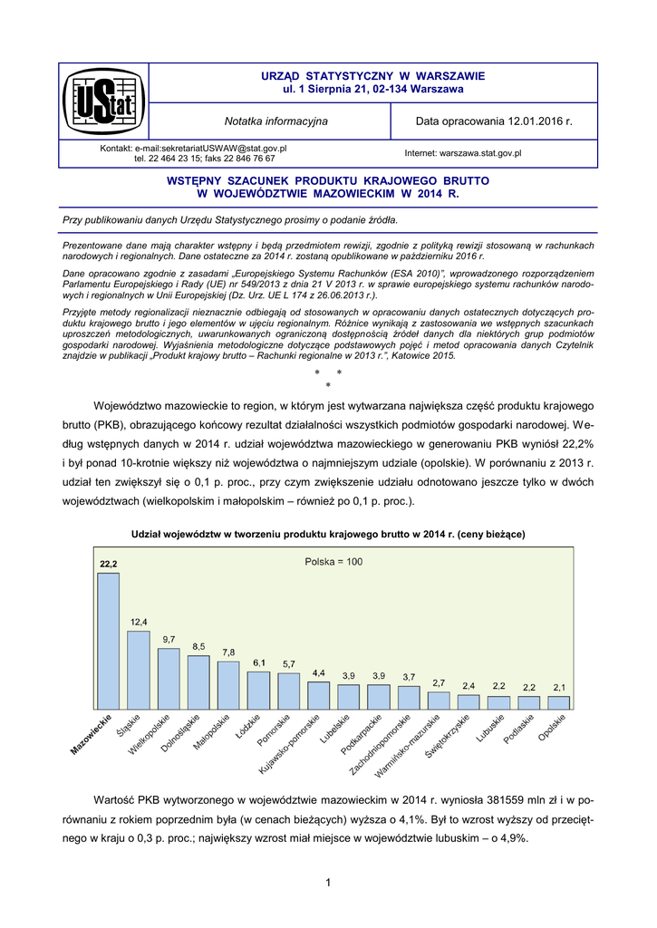 URZĄD STATYSTYCZNY W WARSZAWIE ul. 1 Sierpnia 21, 02-134 Warszawa Notatka informacyjna Data opracowania 12.01.2016 r. Kontakt: e-mail:[email protected] tel. 22 464 23 15; faks 22 846 76 67 Internet: warszawa.stat.gov.pl WSTĘPNY SZACUNEK PRODUKTU KRAJOWEGO BRUTTO W WOJEWÓDZTWIE MAZOWIECKIM W 2014 R. Przy publikowaniu danych Urzędu Statystycznego prosimy o podanie źródła. Prezentowane dane mają charakter wstępny i będą przedmiotem rewizji, zgodnie z polityką rewizji stosowaną w rachunkach narodowych i regionalnych. Dane ostateczne za 2014 r. zostaną opublikowane w październiku 2016 r. Dane opracowano zgodnie z zasadami „Europejskiego Systemu Rachunków (ESA 2010)”, wprowadzonego rozporządzeniem Parlamentu Europejskiego i Rady (UE) nr 549/2013 z dnia 21 V 2013 r. w sprawie europejskiego systemu rachunków narodowych i regionalnych w Unii Europejskiej (Dz. Urz. UE L 174 z 26.06.2013 r.). Przyjęte metody regionalizacji nieznacznie odbiegają od stosowanych w opracowaniu danych ostatecznych dotyczących produktu krajowego brutto i jego elementów w ujęciu regionalnym. Różnice wynikają z zastosowania we wstępnych szacunkach uproszczeń metodologicznych, uwarunkowanych ograniczoną dostępnością źródeł danych dla niektórych grup podmiotów gospodarki narodowej. Wyjaśnienia metodologiczne dotyczące podstawowych pojęć i metod opracowania danych Czytelnik znajdzie w publikacji „Produkt krajowy brutto – Rachunki regionalne w 2013 r.”, Katowice 2015. * * * Województwo mazowieckie to region, w którym jest wytwarzana największa część produktu krajowego brutto (PKB), obrazującego końcowy rezultat działalności wszystkich podmiotów gospodarki narodowej. W edług wstępnych danych w 2014 r. udział województwa mazowieckiego w generowaniu PKB wyniósł 22,2% i był ponad 10-krotnie większy niż województwa o najmniejszym udziale (opolskie). W porównaniu z 2013 r. udział ten zwiększył się o 0,1 p. proc., przy czym zwiększenie udziału odnotowano jeszcze tylko w dwóch województwach (wielkopolskim i małopolskim – również po 0,1 p. proc.). Udział województw w tworzeniu produktu krajowego brutto w 2014 r. (ceny bieżące) Wartość PKB wytworzonego w województwie mazowieckim w 2014 r. wyniosła 381559 mln zł i w porównaniu z rokiem poprzednim była (w cenach bieżących) wyższa o 4,1%. Był to wzrost wyższy od przeciętnego w kraju o 0,3 p. proc.; największy wzrost miał miejsce w województwie lubuskim – o 4,9%. 1 Wzrost produktu krajowego brutto według województw w 2014 r. (ceny bieżące) W 2014 r. produkt krajowy brutto w przeliczeniu na 1 mieszkańca (PKB per capita) wyniósł w województwie mazowieckim 71661 zł i był o 3,8% wyższy niż rok wcześniej. Województwo mazowieckie od lat osiąga najwyższy w Polsce poziom omawianego wskaźnika – w 2014 r. przewyższył on średnią krajową o 60,4% (o 26991 zł); w 2013 r. był większy o 60,5%. Oprócz mazowieckiego, jeszcze tylko trzy województwa przekroczyły średnią krajową, ale w znacznie mniejszym stopniu. PKB per capita odnotowany w naszym województwie był ponad 2 razy wyższy niż w województwie o najniższym poziomie tego miernika (lubelskie – 31233 zł). Produkt krajowy brutto na 1 mieszkańca według województw w 2014 r. (ceny bieżące) Opracowanie: Mazowiecki Ośrodek Badań Regionalnych, tel. 48 362 21 01 w. 351 e-mail: [email protected] 2