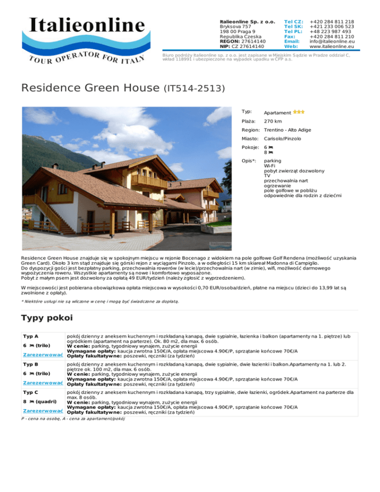 Italieonline Sp. z o.o. Bryksova 757 198 00 Praga 9 Republika Czeska REGON: 27614140 NIP: CZ 27614140 Tel CZ: Tel SK: Tel PL: Fax: Email: Web: +420 284 811 218 +421 233 006 523 +48 223 987 493 +420 284 811 210 [email protected] www.italieonline.eu Biuro podróży Italieonline sp. z o.o. jest zapisane w Miejskim Sądzie w Pradze oddział C, wkład 118991 i ubezpieczone na wypadek upadku w ČPP a.s. Residence Green House (IT514-2513) Typ: Apartament Plaża: 270 km Region: Trentino - Alto Adige Miasto: Carisolo/Pinzolo Pokoje: 6 8 Opis*: parking Wi-Fi pobyt zwierząt dozwolony TV przechowalnia nart ogrzewanie pole golfowe w pobliżu odpowiednie dla rodzin z dziećmi Residence Green House znajduje się w spokojnym miejscu w rejonie Bocenago z widokiem na pole golfowe Golf Rendena (możliwość uzyskania Green Card). Około 3 km stąd znajduje się górski rejon z wyciągami Pinzolo, a w odległości 15 km skiareał Madonna di Campiglio. Do dyspozycji gości jest bezpłatny parking, przechowalnia rowerów (w lecie)/przechowalnia nart (w zimie), wifi, możliwość darmowego wypożyczenia roweru. Wszystkie apartamenty są nowe i komfortowo wyposażone. Pobyt z małym psem jest dozwolony za opłatą 49 EUR/tydzień (należy zgłosić z wyprzedzeniem). W miejscowości jest pobierana obowiązkowa opłata miejscowa w wysokości 0,70 EUR/osoba/dzień, płatne na miejscu (dzieci do 13,99 lat są zwolnione z opłaty). * Niektóre usługi nie są wliczone w cenę i mogą być świadczone za dopłatą. Typy pokoi Typ A pokój dzienny z aneksem kuchennym i rozkładaną kanapą, dwie sypialnie, łazienka i balkon (apartamenty na 1. piętrze) lub ogródkiem (apartament na parterze). Ok. 80 m2, dla max. 6 osób. 6 (trilo) W cenie: parking, tygodniowy wynajem, zużycie energii Wymagane opłaty: kaucja zwrotna 150€/A, opłata miejscowa 4.90€/P, sprzątanie końcowe 70€/A Zarezerwować Opłaty fakultatywne: poszewki, ręczniki (za tydzień) Typ B pokój dzienny z aneksem kuchennym i rozkładaną kanapą, dwie sypialnie, dwie łazienki i balkon.Apartamenty na 1. lub 2. piętrze ok. 100 m2, dla max. 6 osób. 6 (trilo) W cenie: parking, tygodniowy wynajem, zużycie energii Wymagane opłaty: kaucja zwrotna 150€/A, opłata miejscowa 4.90€/P, sprzątanie końcowe 70€/A Zarezerwować Opłaty fakultatywne: poszewki, ręczniki (za tydzień) Typ C pokój dzienny z aneksem kuchennym i rozkładana kanapą, trzy sypialnie, dwie łazienki, ogródek.Apartament na parterze dla max. 8 osób. 8 (quadri) W cenie: parking, tygodniowy wynajem, zużycie energii Wymagane opłaty: kaucja zwrotna 150€/A, opłata miejscowa 4.90€/P, sprzątanie końcowe 70€/A Zarezerwować Opłaty fakultatywne: poszewki, ręczniki (za tydzień) P - cena na osobę, A - cena za apartament/pokój Prezentowane zdjęcia są przykładowe. https://www.italieonline.eu/pl/carisolo-pinzolo/residence-green-house-2513.html www.ITALIEONLINE.eu TOUR OPERATOR FOR ITALY
