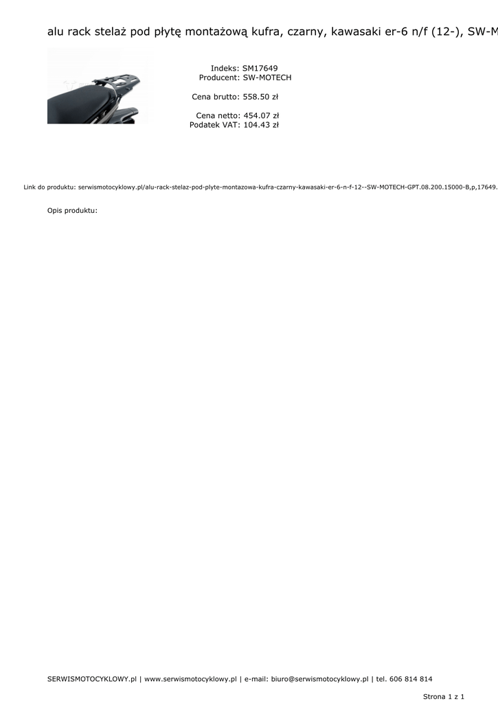 alu rack stelaż pod płytę montażową kufra, czarny, kawasaki er-6 n/f (12-), SW-M Indeks: SM17649 Producent: SW-MOTECH Cena brutto: 558.50 zł Cena netto: 454.07 zł Podatek VAT: 104.43 zł Link do produktu: serwismotocyklowy.pl/alu-rack-stelaz-pod-plyte-montazowa-kufra-czarny-kawasaki-er-6-n-f-12--SW-MOTECH-GPT.08.200.15000-B,p,17649. Opis produktu: SERWISMOTOCYKLOWY.pl | www.serwismotocyklowy.pl | e-mail: [email protected] | tel. 606 814 814 Strona 1 z 1