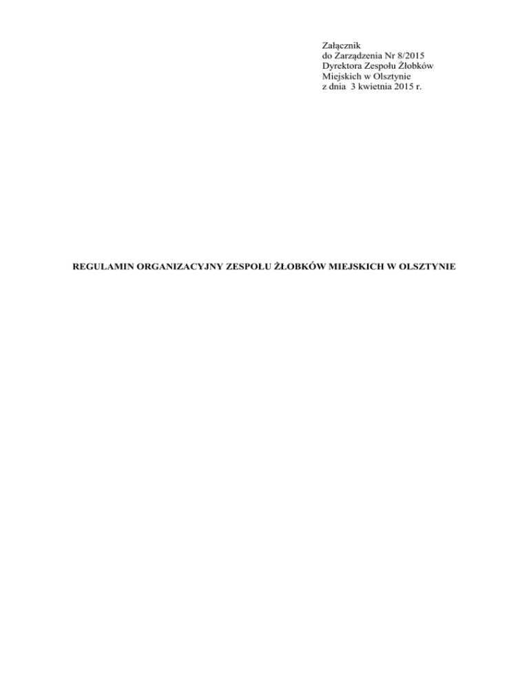 Załącznik do Zarządzenia Nr 8/2015 Dyrektora Zespołu Żłobków Miejskich w Olsztynie z dnia 3 kwietnia 2015 r. REGULAMIN ORGANIZACYJNY ZESPOŁU ŻŁOBKÓW MIEJSKICH W OLSZTYNIE Rozdział I Postanowienia ogólne § 1. 1. Regulamin Organizacyjny Zespołu Żłobków Miejskich w Olsztynie, zwany dalej „Regulaminem” określa organizację wewnętrzną, podział zadań oraz zasady działania Zespołu Żłobków Miejskich. 2. Zespół Żłobków Miejskich zwany dalej „Zespołem” jest samorządową jednostką budżetową Gminy Olsztyn i działa na podstawie obowiązującego prawa, a w szczególności: 1) ustawy z dnia 4 lutego 2011 r. o opiece nad dziećmi w wieku do lat 3 (t. j. Dz. U. z 2013r., poz. 1457), 2) ustawy z dnia 8 marca 1990r. o samorządzie gminnym (t. j. Dz. U. z 2013r., poz. 594 z późn. zm.), 3) ustawy z dnia 21 listopada 2008r. o pracownikach samorządowych (t. j. Dz. U. z 2014r., poz. 1202), 4) ustawy z dnia 24 kwietnia 2003r. o działalności pożytku publicznego i wolontariacie (t .j. Dz. U. z 2014r., poz. 1118), 5) ustawy z dnia 27 sierpnia 2009r. o finansach publicznych (t. j. Dz. U. z 2013r., poz. 885 z późn. zm.), 6) ustawy z dnia 29 września 1994r. o rachunkowości (t. j. Dz. U. z 2013r., poz. 330 z późn. zm.), 7) ustawy z dnia 29 stycznia 2004r. Prawo zamówień publicznych (t. j. Dz. U. z 2013r., poz. 907 z późn. zm.), 8) statutu Zespołu Żłobków Miejskich, 9) niniejszego regulaminu. 2. Ilekroć w regulaminie jest mowa o: 1) Zespole – oznacza to Zespół Żłobków Miejskich w Olsztynie, 2) Radzie Miasta – oznacza to Radę Miasta Olsztyna, 3) Prezydencie – oznacza to Prezydenta Olsztyna, 4) Dyrektorze – oznacza to Dyrektora Zespołu Żłobków Miejskich w Olsztynie, 5) żłobku – oznacza to żłobek jako wewnętrzną jednostkę organizacyjną Zespołu, 6) załatwianiu spraw – oznacza to każde działanie w ramach obowiązków służbowych podejmowane na podstawie przepisów prawa, w celu wykonywania zadań, 7) komórce organizacyjnej – oznacza to wyodrębniony element struktury Zespołu, realizujący zadania określone w niniejszym Regulaminie, w szczególności Dział, samodzielne stanowisko pracy oraz jednostki organizacyjne Zespołu, 8) statucie – oznacza to Statut Zespołu Żłobków Miejskich w Olsztynie, nadany uchwałą Rady Miasta Olsztyna, 9) regulaminie – oznacza to niniejszy regulamin, 10) przedstawicielu ustawowym – należy przez to rozumieć rodzica wykonującego władzę rodzicielską, opiekuna prawnego oraz inne osoby, którym sąd powierzył sprawowanie opieki nad dzieckiem. 2. Strukturę organizacyjną Zespołu określa schemat organizacyjny stanowiący załącznik Nr 1 do niniejszego regulaminu. Rozdział II Zasady kierowania Zespołem § 2. 1. Pracą Zespołu kieruje Dyrektor na podstawie pełnomocnictwa udzielonego przez Prezydenta Olsztyna. 2. Dyrektora zatrudnia i zwalnia Prezydent Olsztyna. 3. Dyrektor zarządza Zespołem i reprezentuje go na zewnątrz. 4. Dyrektor wykonuje czynności pracodawcy w stosunku do osób zatrudnionych w Zespole. 5. Zwierzchnikiem służbowym Dyrektora jest Prezydent. 6. Dyrektor wykonuje swoje funkcje przy pomocy Głównego Księgowego oraz Dyrektorów Żłobków. 7. Do zadań Dyrektora należy w szczególności: 1) nadzór i koordynacja działalności poszczególnych żłobków oraz pozostałych wewnętrznych komórek organizacyjnych, 2) realizowanie budżetu Zespołu, 3) nadzorowanie przestrzegania obowiązujących procedur, 4) gospodarowanie mieniem Zespołu poprzez zachowanie go w należytym stanie, oraz wydatkowanie środków pieniężnych z zachowaniem zasady gospodarności, celowości i efektywności, 5) kierowanie pracą Zespołu, 6) wydawanie zarządzeń, regulaminów, poleceń, wskazówek, 7) współpraca z Wydziałami Urzędu Miasta Olsztyna, 8) nadzorowanie i kontrolowanie terminów oraz prawidłowości załatwiania spraw, 9) zapewnienie właściwego dopływu informacji merytorycznych i finansowych do Zespołu, 10) występowanie do Prezydenta w sprawach organizacyjnych, finansowych i zasad działania Zespołu, 11) wykonywanie kontroli zarządczej w zakresie wynikającym z przepisów prawa, a także wewnętrznych obowiązujących w Zespole regulaminów i procedur. § 3. 1. Dyrektorzy jednostek organizacyjnych Zespołu i Główny Księgowy działają w zakresie spraw powierzonych im przez Dyrektora i ponoszą przed nim odpowiedzialność za ich realizację. 2. Wykonując powierzone zadania Dyrektorzy Żłobków i Główny Księgowy zapewniają prawidłową i terminową realizację zadań wynikających z zakresu działania Zespołu w podporządkowanych im komórkach organizacyjnych oraz nadzorują i koordynują ich działalność. 3. Podczas nieobecności Dyrektora, Zespołem kieruje w zakresie udzielonego upoważnienia wyznaczona przez Dyrektora osoba. Rozdział III Organizacja wewnętrzna Zespołu § 4. 1. Strukturę organizacyjną Zespołu tworzą następujące jednostki organizacyjne, działy, oraz samodzielne stanowiska: 1) Dyrektor, 2) Żłobek Miejski Nr 1 w Olsztynie przy ul. Juliusza Malewskiego 2b – „Ż1”, 3) Żłobek Miejski Nr 2 w Olsztynie przy ul. Żołnierskiej 47 – „Ż2”, 4) Żłobek Miejski Nr 3 w Olsztynie przy ul. Maurycego Mochnackiego 37 – „Ż3”, 5) Żłobek Miejski Nr 4 w Olsztynie przy ul. Stanisława Wyspiańskiego 2 – „Ż4”, 6) Dział Finansowo-Księgowy – „DFK”, 7) Samodzielne stanowiska: a) Stanowisko ds. administracyjno-socjalnych – „GS”, b) Stanowisko ds. pracowniczych i administracji – „SPA”, c) Stanowisko ds. płac – „SP”, d) Dietetyk – „D”. 2. Dyrektor Zespołu sprawuje bezpośredni nadzór nad pracą: 1) Żłobka Miejskiego Nr 1, 2) Żłobka Miejskiego Nr 2, 3) Żłobka Miejskiego Nr 3, 4) Żłobka Miejskiego Nr 4, 5) Samodzielnych stanowisk wymienionych w ust. 1 pkt 7. 3. Główny Księgowy sprawuje bezpośredni nadzór nad pracą Działu Finansowo-Księgowego. 4. Pracą żłobkó