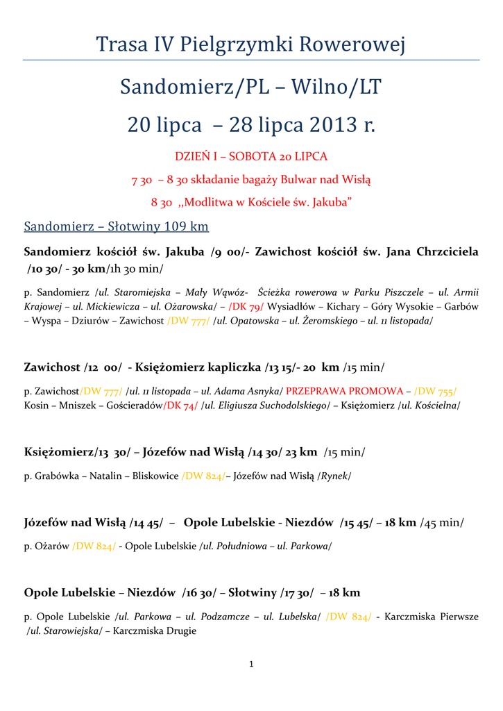 Trasa IV Pielgrzymki Rowerowej Sandomierz/PL – Wilno/LT 20 lipca – 28 lipca 2013 r. DZIEŃ I – SOBOTA 20 LIPCA 7 30 – 8 30 składanie bagaży Bulwar nad Wisłą 8 30 ,,Modlitwa w Kościele św. Jakuba” Sandomierz – Słotwiny 109 km Sandomierz kościół św. Jakuba /9 00/- Zawichost kościół św. Jana Chrzciciela /10 30/ - 30 km/1h 30 min/ p. Sandomierz /ul. Staromiejska – Mały Wąwóz- Ścieżka rowerowa w Parku Piszczele – ul. Armii Krajowej – ul. Mickiewicza – ul. Ożarowska/ – /DK 79/ Wysiadłów – Kichary – Góry Wysokie – Garbów – Wyspa – Dziurów – Zawichost /DW 777/ /ul. Opatowska – ul. Żeromskiego – ul. 11 listopada/ Zawichost /12 00/ - Księżomierz kapliczka /13 15/- 20 km /15 min/ p. Zawichost/DW 777/ /ul. 11 listopada – ul. Adama Asnyka/ PRZEPRAWA PROMOWA – /DW 755/ Kosin – Mniszek – Gościeradów/DK 74/ /ul. Eligiusza Suchodolskiego/ – Księżomierz /ul. Kościelna/ Księżomierz/13 30/ – Józefów nad Wisłą /14 30/ 23 km /15 min/ p. Grabówka – Natalin – Bliskowice /DW 824/– Józefów nad Wisłą /Rynek/ Józefów nad Wisłą /14 45/ – Opole Lubelskie - Niezdów /15 45/ – 18 km /45 min/ p. Ożarów /DW 824/ - Opole Lubelskie /ul. Południowa – ul. Parkowa/ Opole Lubelskie – Niezdów /16 30/ – Słotwiny /17 30/ – 18 km p. Opole Lubelskie /ul. Parkowa – ul. Podzamcze – ul. Lubelska/ /DW 824/ - Karczmiska Pierwsze /ul. Starowiejska/ – Karczmiska Drugie 1 DZIEŃ II – NIEDZIELA 21 LIPCA Słotwiny – Łuków 109 km Słotwiny 8 00 – Wąwolnica / kościół/ 8 45 - 14 km / 2h 00 min/ p. Zaborze – Niezabitów – Wąwolnica /ul. Kębelska, ul. Rynek - ul. Zamkowa 24/ Wąwolnica 10 45 – Choszczów kościół 12 00 – 21 km /15 min/ p. Wąwolnica /ul. Zamkowa 24 – ul. Rynek – ul. 3 Maja / – Zarzeka - Drzewce – Buchałowice – Kurów – Choszczów kościół Choszczów kościół 12 15 – Wola Gułowska 13 45 – 34 km /1 h/ p. Choszczów – Baranów – Sobieszyn - Ledno Ruskie – Kalinowy Dół Wola Gułowska 14 45 – Wola Okrzejska 15 15 – 11 km /30 min/ p. Lipiny – przejazd kolejowy Wola Okrzejska 15 45 – Łuków 16 45 - 21 km p. Stara Wróblina – Stanin – Łuków /ul. Żelechowska – ul. Kaczyńskich Marii i Lecha – ul. Świderska – ul. Wyszyńskiego/ 2 Dzień III – PONIEDZIAŁEK 22 lipca Łuków – Kleszczele 145 km Łuków 8 30 – Czuryły remiza 10 00 - 32 km /15 min/ p. Łuków /ul. Wyszyńskiego - ul. Międzyrzecka /DW 806// – Dębowica – Celiny – Łęcznowola – Zbuczyn /DK 2/ - Choja – Czuryły Czuryły remiza 10 15 – Sawice kościół 12 00 - 34 km /15 min/ p. Krzymosze – Wyczółki /DW 698/ Mordy/ul. Narutowicza - ul. Żwirki i Wigury/ – Kukawki – Pliszki Paprotnia – Łozy - Trębice Sawice kościół 12 15 - Drohiczyn 13 15 - 19 km /1 h 30/ p. Skrzeszew /DK 62/ - Drohiczyn /ul. Warszawska – ul. Ciechanowiecka – ul. Kościelna/ Drohiczyn 14 45 – Grabarka - klasztor 16 15 - 27 km /1 h/ p. Drohiczyn /ul. Kraszewskiego – ul. Warszawska/ – Klekotowo – Drohiczyn /ul. Drohiczyńska – Grodzieńska/ – Wysoka – Boratyniec Lacki Grabarka 17 15 – Kleszczele 18 45 - 33 km p. Milejczyce /DW 693/ - Nowosiółki – Kleszczele DK66 /ul. Kolejowa – ul. 1 Maja/ 3 Dzień IV - WTOREK 23 lipca Kleszczele – Supraśl - 107 km Kleszczele 9 00 – Hajnówka 10 30 - 28 km / 1 h / p. Kleszczele /ul. 1 maja/ - /DW 685/ Dubicze Cerkiewne – Hajnówka /ul. Warszawska – Rondo Jana Pawła II – ul. 3 Maja – ul. Sportowa – ul. Ks. Dziewiatowskiego Antoniego/ Hajnówka 11 30 - Rybaki 13 00 – 30 km /1 h / p. Hajnówka /ul. Sportowa – ul. Białostocka – ul. Główna/ - Nowosady - /DW 685/ Narewka – Bondary – Rybaki Zalew Siemianówka Rybaki 14 00 – Żednia 15 15 - 25 km /15 min/ p. Bondary – Juszkowy Gród – Michałowo – Żednia Parking Leśny Żednia 15 30 – Supraśl 16 45 – 24 km p. Żednia – /DK 65/ Majówka – Supraśl /ul. Piłsudskiego/ 4 Dzień V – ŚRODA 24 lipca Supraśl – Sejny - 148 km Supraśl 8 30 – Sokółka kościół 10 00 33 km /1 h / p. Supraśl /ul. Piłsudskiego – ul. Podleśna /– /DW676/- Kopna Góra –Woronicze – Wierzchlesie – Stara Kamionka – Sokółka /ul. Kryńska – ul. 11 listopada – ul. Grodzieńska/ Sokółka 11 00 – Różanystok 12 30 – 29 km /1 h 30 min/ p. Sokółka /ul. Grodzieńska – ul. Adama Mickiewicza – ul. Wincentego Witosa – ul. Mariańska/ Sokolany - Nierośno – Różanystok Różanystok 14 00 - Lipsk Parking nad rz. Biebrza 14 45 - 15 km /15 min/ p. Stock – /DW 670/ - Dabrowa Białostocka /ul. Wojska Polskiego/ /DW 673/ Lipsk Lipsk Parking nad rz. Biebrza 15 00 – Studzieniczna 17 00 - 36 km /1 h/ p. Lipsk /DW 673/ /ul. Batorego/ - Jasionowo /DW 664/ - Sajenek /DK 16/ Studzieniczna Studzieniczna 18 00 – Sejny 20 00 35 km p. Przewięź /DK 16/ – Giby – /DW 663/ Sejny /ul. 1 Maja - ul. Piłsudskiego Józefa - ul. Konarskiego – ul. Łąkowa/ 5 Dzień VI – CZWARTEK 25 lipca Sejny – dzień odpoczynku Dzień VII – PIĄTEK 26 lipca Sejny – Lentvaris 149 km Sejny 9 00 – Granica Państwa/PL – LT/ 9 45 14 km p. Sejny /DW 653/ul Łąkowa 1 – /ul. Konarskiego – ul. Piłsudskiego Józefa – ul. Juliana Marchlewskiego/ - Poćkuny /DK 16/ – Ogrodniki - Granica Państwa Dzień VII – Sobota 27 lipca Lentvaris – Vilnius 19 km Vilnius - Lentvaris 19 km 6