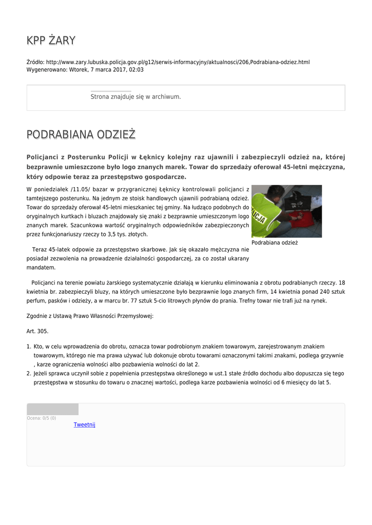 KPP ŻARY Źródło: http://www.zary.lubuska.policja.gov.pl/g12/serwis-informacyjny/aktualnosci/206,Podrabiana-odziez.html Wygenerowano: Wtorek, 7 marca 2017, 02:03 Strona znajduje się w archiwum. PODRABIANA ODZIEŻ Policjanci z Posterunku Policji w Łęknicy kolejny raz ujawnili i zabezpieczyli odzież na, której bezprawnie umieszczone było logo znanych marek. Towar do sprzedaży oferował 45-letni mężczyzna, który odpowie teraz za przestępstwo gospodarcze. W poniedziałek /11.05/ bazar w przygranicznej Łęknicy kontrolowali policjanci z tamtejszego posterunku. Na jednym ze stoisk handlowych ujawnili podrabianą odzież. Towar do sprzedaży oferował 45-letni mieszkaniec tej gminy. Na łudząco podobnych do oryginalnych kurtkach i bluzach znajdowały się znaki z bezprawnie umieszczonym logo znanych marek. Szacunkowa wartość oryginalnych odpowiedników zabezpieczonych przez funkcjonariuszy rzeczy to 3,5 tys. złotych. Podrabiana odzież Teraz 45-latek odpowie za przestępstwo skarbowe. Jak się okazało mężczyzna nie posiadał zezwolenia na prowadzenie działalności gospodarczej, za co został ukarany mandatem. Policjanci na terenie powiatu żarskiego systematycznie działają w kierunku eliminowania z obrotu podrabianych rzeczy. 18 kwietnia br. zabezpieczyli bluzy, na których umieszczone było bezprawnie logo znanych firm, 14 kwietnia ponad 240 sztuk perfum, pasków i odzieży, a w marcu br. 77 sztuk 5-cio litrowych płynów do prania. Trefny towar nie trafi już na rynek. Zgodnie z Ustawą Prawo Własności Przemysłowej: Art. 305. 1. Kto, w celu wprowadzenia do obrotu, oznacza towar podrobionym znakiem towarowym, zarejestrowanym znakiem towarowym, którego nie ma prawa używać lub dokonuje obrotu towarami oznaczonymi takimi znakami, podlega grzywnie , karze ograniczenia wolności albo pozbawienia wolności do lat 2. 2. Jeżeli sprawca uczynił sobie z popełnienia przestępstwa określonego w ust.1 stałe źródło dochodu albo dopuszcza się tego przestępstwa w stosunku do towaru o znacznej wartości, podlega karze pozbawienia wolności od 6 miesięcy do lat 5. Ocena: 0/5 (0) Tweetnij