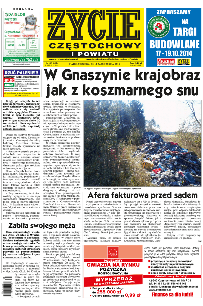 R E K L A M A C Z Ę S TO C H O W Y I P O W I AT U www.zycieczestochowy.pl Nr 118 (323) Nr ISSN 22 99 4440 www.facebook.com/ZycieCzestochowyiPowiatu PIĄTEK-NIEDZIELA, 10-12 PAŹDZIERNIKA 2014 Cena 1,20 zł (w tym 8% VAT) W Gnaszynie krajobraz jak z koszmarnego snu Drogę po starych torach kolejki górniczej, znajdującej się w dzielnicy Gnaszyn, ktoś usilnie stara się zmienić w dzikie wysypisko. Pierwsze kroki w tym kierunku już uczynił – postanowił wysypać w tym miejscu około 20 ton śmieci... Brak wyobraźni niektórych osób naprawdę potrafi zaskoczyć. Droga po starym torowisku ciągnie się od ulicy Drucianej (dzielnica Gnaszyn) do ulicy Lakowej (dzielnica Liszka). Śmieci zostały wyrzucone na ulicę Szybową. – Jeszcze w piątek po południu była ona przejezdna. W sobotę rano naszym oczom ukazał się przerażający krajobraz – relacjonują mieszkańcy Gnaszyna pokazując zrobione w tym miejscu zdjęcia. Obok leżących luzem drobnego kalibru śmieci, jak butelki, makulatura, przedmioty z tworzyw sztucznych znaleźć tam można wypełnione odpadkami foliowe worki, a także całkiem pokaźne elementy... samochodowe. – Przypuszczamy, że śmieci zostały wysypane z naczepy samochodu ciężarowego. Być może była to nawet śmieciarka... W każdym razie widok i smród jest nie do zniesienia – dodają. Sprawa została zgłoszona na policję. – Prowadzimy postępowanie w kierunku przestęp- stwa związanego ze środowiskiem. Czynności w tej sprawie trwają. Prowadzi je komisariat II – wyjaśnia podinspektor Joanna Lazar, oficer prasowy częstochowskich stróżów prawa. Mieszkańcom Gnaszyna zależy na jak najszybszym ustaleniu sprawcy lub sprawców tego czynu. – To przecież nie mieści się w głowie. Jak można przyjechać i porzucić 20 ton śmieci! Osoba, która to zrobiła nie może zostać bezkarna – podkreślają zdenerwowani. O całym zdarzeniu poinformowano też częstochowski magistrat. – Na miejscu byli przedstawiciele wydziału ochrony środowiska. O całej sprawie wie także Częstochowskie Przedsiębiorstwo Komunalne, które sprząta dzikie wysypiska pojawiające się na terenach miejskich lub terenach skarbu państwa – mówi Włodzimierz Tutaj, rzecznik częstochowskiego Urzędu Miasta. – Bez względu na to, czy sprawcy tego czynu będą ustaleni, śmieci trzeba posprzątać. Zostały one wyrzucone w pasie drogowym, dlatego też ich sprzątnięciem prawdopodobnie zajmie się tym Miejski Zarząd Dróg i Transportu w porozumieniu z Częstochowskiej Przedsiębiorstwem Komunalnym. Wkrótce prace związane z posprzątaniem śmieci powinny ruszyć – podsumowuje Włodzimierz Tutaj. kg Zabiła swojego męża Kara dożywotniego więzienia grozi 29-latce z Myszkowa, podejrzanej o zabójstwo. Kobieta śmiertelnie ugodziła nożem swojego małżonka. Zebrany przez policjantów i prokuratora materiał dowodowy pozwolił na przedstawienie jej zarzutu zabójstwa i tymczasowe aresztowanie. Do tragicznego w skutkach zdarzenia doszło w minioną niedzielę w jednym z mieszkań w Myszkowie. Około 14.30 oficer dyżurny otrzymał zgłoszenie, że przed blokiem na ulicy Kościuszki leży mężczyzna z widoczną na szyi raną. Na miejsce skierowano grupę operacyjno-procesową. – Policjanci ustalili, że tego dnia pomiędzy mężczyzną, a jego żoną doszło do awantury domowej, w trakcie której kobieta zadała mu cios nożem w okolicy szyi - podkreśla asp. sztab. mgr Magdalena Modrykamień, oficer prasowy myszkowskich stróżów prawa. Pomimo podjętej przez lekarzy reanimacji, 31-latek zmarł. W mieszkaniu pary funkcjonariusze zatrzymali 29-latkę. Kobieta była pod wpływem alkoholu. Badanie stanu trzeźwości wykazało blisko promil alkoholu w jej organizmie. Na podstawie zebranego materiału dowodowego prokurator przedstawił jej zarzut zabójstwa. Decyzją sądu, mieszkanka Myszkowa została tymczasowo aresztowana na 3 miesiące. Grozi jej nawet dożywotnie więzienie. kg Tak wygląda krajobraz w Gnaszynie. Zdjęcie nadesłane przez czytelników Afera fakturowa przed sądem Przed częstochowskim sądem ruszył proces o zniesławienie z powództwa cywilnego. Sprawa dotyczy redaktor naczelnej Tygodnika Regionalnego „7 dni” Renaty Klucznej w związku z rzekomym naruszeniem dóbr osobistych radnego SLD Janusza Danka. Chodzi o serię artykułów na temat rozliczania dotacji przez Stowarzyszenie „Speedway Fan Club”, którego Danek jest prezesem. Tygodnik pisał, że prezes przedstawiał fałszywe faktury rozliczając się z UM z dotacji. Sąd przyjął wszystkie wnioski dowodowe składane przez nas jako pozwanych, zarówno w kwestii przyjrzenia się materiałom z prokuratorskiego śledztwa w sprawie „lewych” faktur, jak i przesłuchania zgłoszonych przez nas świadków na okoliczność przebiegu rozliczania dotacji czytamy na stronie internetowej Tygodnika. - Może to czytelników nieco zdziwić, ale zgłosiliśmy jako naszych świadków m.in. Krzysztofa Matyjaszczyka, Jaro- sława Marszałka, Mirosława Soboraka i Aleksandra Wiernego licząc na to, że szczerze opiszą (zeznając pod odpowiedzialnością karną za składanie fałszywych zeznań) faktyczny przebieg wydarzeń związanych z procedurą rozliczania przez miasto dotacji „Speedway Fan Clubu”, kwestią fałszywych faktur, okoliczności zawiadomienia przez nich prokuratury itp. Kolejny termin rozprawy wyznaczono na 10 grudnia. mag 2. PIĄTEK-NIEDZIELA, 10-12 PAŹDZIERNIKA 2014 KONSULTACJE ŻYCIA O stażach, zasiłkach i dodatku aktywizacyjnym Czy jako student zaocznych studiów mogę starać sie o staż? Do jakiego roku życia? Jeżeli jest pan zarejestrowany w Powiatowym Urzędzie Pracy jako osoba bezrobotna, może pan ubiegać się o staż. Bliższych informacji udzieli pana doradca klienta. szej niż połowa minimalnego wynagrodzenia za każdego zatrudnionego bezrobotnego. Dofinansowanie przysługuje przez okres 12 miesięcy w przypadku bezrobotnego, który ukończył