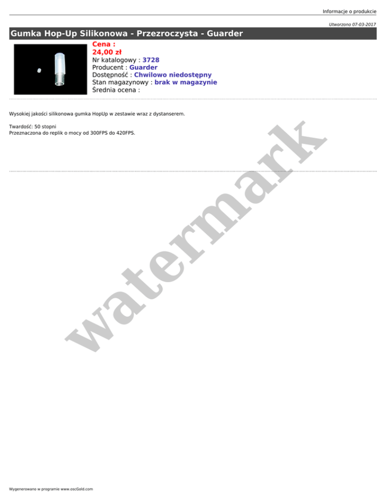 Informacje o produkcie Utworzono 07-03-2017 Gumka Hop-Up Silikonowa - Przezroczysta - Guarder Cena : 24,00 zł Nr katalogowy : 3728 Producent : Guarder Dostępność : Chwilowo niedostępny Stan magazynowy : brak w magazynie Średnia ocena : Wysokiej jakości silikonowa gumka HopUp w zestawie wraz z dystanserem. w at er m ar k Twardość: 50 stopni Przeznaczona do replik o mocy od 300FPS do 420FPS. Wygenerowano w programie www.oscGold.com