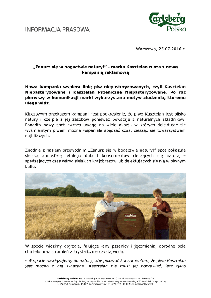 INFORMACJA PRASOWA Warszawa, 25.07.2016 r. „Zanurz się w bogactwie natury!” - marka Kasztelan rusza z nową kampanią reklamową Nowa kampania wspiera linię piw niepasteryzowanych, czyli Kasztelan Niepasteryzowane i Kasztelan Pszeniczne Niepasteryzowane. Po raz pierwszy w komunikacji marki wykorzystano motyw złudzenia, któremu ulega widz. Kluczowym przekazem kampanii jest podkreślenie, że piwo Kasztelan jest blisko natury i czerpie z jej zasobów ponieważ powstaje z naturalnych składników. Ponadto nowy spot zwraca uwagę na wiele okazji, w których delektując się wyśmienitym piwem można wspaniale spędzać czas, ciesząc się towarzystwem najbliższych. Zgodnie z hasłem przewodnim „Zanurz się w bogactwie natury!” spot pokazuje sielską atmosferę letniego dnia i konsumentów cieszących się naturą – spędzających czas wśród sielskich krajobrazów lub delektujących się nią w piwnym kuflu. W spocie widzimy dojrzałe, falujące łany pszenicy i jęczmienia, dorodne pole chmielu oraz strumień z krystalicznie czystą wodą. - W spocie nawiązujemy do natury, aby pokazać konsumentom, że piwo Kasztelan jest mocno z nią związane. Kasztelan nie musi jej poprawiać, lecz tylko Carlsberg Polska SA z siedzibą w Warszawie, PL 02-135 Warszawa, ul. Iłżecka 24 Spółka zarejestrowana w Sądzie Rejonowym dla m.st. Warszawy w Warszawie, XIII Wydział Gospodarczy KRS pod numerem 35347 Kapitał akcyjny: 28.720.701,00 PLN (w pełni opłacony) INFORMACJA PRASOWA wykorzystuje bogactwo naturalnych składników i pozwala konsumentom cieszyć się nimi. Tym razem oprócz znanego już z wcześniejszych spotów piwowara - do zabawy dołączyli młodzi ludzie. Wykorzystaliśmy również efekt zabawnej iluzji – podkreśliła Olga Kozerska, Junior Brand Manager marki Kasztelan. Spot będzie można obejrzeć od 25 lipca 2016 roku w telewizji TVP, TVN, Polsat oraz w kanałach tematycznych tych stacji. Za kreację spotu odpowiada agencja Red8 Advertising, produkcją zajął się Dom Produkcyjny highnoon.pl / Błażej Baar, a reżyserem spotu jest Dariusz Zatorski. Za planowanie i zakup mediów na potrzeby kampanii odpowiedzialny jest dom mediowy PHD Media Direction. Link do spotu: https://www.youtube.com/watch?v=C_EZI5Kp4Zc&feature=youtu.be Carlsberg Polska SA z siedzibą w Warszawie, PL 02-135 Warszawa, ul. Iłżecka 24 Spółka zarejestrowana w Sądzie Rejonowym dla m.st. Warszawy w Warszawie, XIII Wydział Gospodarczy KRS pod numerem 35347 Kapitał akcyjny: 28.720.701,00 PLN (w pełni opłacony) INFORMACJA PRASOWA Dodatkowych informacji udziela: Beata Ptaszyńska-Jedynak Dyrektor ds. komunikacji Carlsberg Polska Tel. 602 411 680, e-mail: [email protected] Carlsberg Polska zajmuje wiodące miejsce w polskiej branży piwowarskiej, z udziałem ilościowym w rynku na poziomie 21,1% (dane za rok 2015), dostarczając marki piwa najwyższej jakości, odwołujące się do przyjemnych i radosnych stron dorosłego stylu życia. Carlsberg Polska ma w swoim portfelu marki: Carlsberg, Okocim, Harnaś, Karmi, Kasztelan, Bosman, Piast. Piwa z grupy Carlsberg Polska warzone są w browarach w Brzesku, Szczecinie i Sierpcu. Łączne zatrudnienie w Polsce wynosi ponad 1300 pracowników. Od roku 2012 do portfolio Carlsberg Polska dołączyły również takie marki jak: Somersby, Grimbergen, piwa Sezonowe Okocim oraz Okocim Radler. Carlsberg Polska SA z siedzibą w Warszawie, PL 02-135 Warszawa, ul. Iłżecka 24 Spółka zarejestrowana w Sądzie Rejonowym dla m.st. Warszawy w Warszawie, XIII Wydział Gospodarczy KRS pod numerem 35347 Kapitał akcyjny: 28.720.701,00 PLN (w pełni opłacony)