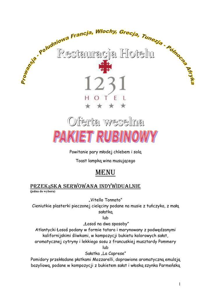 Restauracja Hotelu Oferta weselna Powitanie pary młodej chlebem i solą Toast lampką wina musującego MENU Przekąska serwowana indywidualnie (jedna do wyboru) „Vitello Tonnato” Cieniutkie plasterki pieczonej cielęciny podane na musie z tuńczyka, z małą sałatką lub „Łosoś na dwa sposoby” Atlantycki Łosoś podany w formie tatara i marynowany z podwędzanymi kalifornijskimi śliwkami, w kompozycji bukietu kolorowych sałat, aromatycznej cytryny i lekkiego sosu z francuskiej musztardy Pommery lub Sałatka „La Caprese” Pomidory przekładane płatkami Mozzarelli, doprawione aromatyczną emulsją bazyliową, podane w kompozycji z bukietem sałat i włoską szynka Parmeńską 1 Zupa serwowana indywidualnie (jedna do wyboru) Chłodnik z naturalnego jogurtu i listków botwinki, doprawiony ogórkiem, aromatem ogrodowego koperku i szczypiorku, podany z jajkiem lub Kremowa zupa ze świeżych warzyw skropiona oliwą, truflową, i doprawiona płatkami kabanosa lub Aromatyczny rosół z wiejskiej kury, z makaronem, kawałeczkami kurczaka i kolorowymi warzywami. lub Staropolski żurek doprawiony aromatem wędzonki, suszonych grzybów i świeżo tartego chrzanu Dania główne - mięsne i rybne podane na stoły (trzy do wyboru) “Saltinbocca” Włoskie kotleciki ze schabu smażone z Salami, podane w sosie z papryki ***** Łosoś marynowany z pikantna papryczką pepperoni, pieczony na grillu, podany w maślano-cytrynowej emulsji ***** Eskalopki z piersi kurczaka smażone w jajku i tartym Parmezanie ***** Opiekane roladki z polędwiczek wieprzowych nadziewane szpinakiem, papryka i Fetą, podane na aromatycznym sosie pomidorowym ***** Fileciki Okonia Wiktoriańskiego smażone na maśle, w panierce z włoskich orzechów ***** Soczysta pieczeń z karkówki marynowanej z czosnkiem, jałowcem i ogrodowym rozmarynem, podana z własnym sosem ***** Kotleciki schabowe doprawione smażoną cebulką z pieczarkami Dodatki podane na stoły (Trzy do wyboru) Gotowane ziemniaki doprawione świeżym masłem i koperkiem ***** 2 Mus ziemniaczany doprawiony oliwa truflową i zapieczony pod płaszczykiem Parmezanu ***** Frytki i ziemniaki opiekane ***** Asortyment gotowanych warzyw, doprawione maślano – cytrynową emulsją ***** Staropolska kapusta zasmażana z pomidorami ***** Gotowane różyczki kalafiora i fasolka szparagowa doprawione złocistą bułeczką Deser serwowany indywidualnie (jeden do wyboru) Puchar lodów “Amorek” Lody czekoladowe, waniliowe i truskawkowe podane ze świeżymi owocami, bitą śmietaną, wiórkami czekolady. Doprawione sosem z mlecznej czekolady lub Sałatka ze świeżych owoców z listkami afrodyzjakalnej mięty pieprzowej i sosem truskawkowym, podana z gałką sorbetu malinowego lub Karmelizowany Krem Brulee doprawiony kroplą Martella w trzech odsłonach: z leśnymi jagodami, ogrodowymi truskawkami i Toruńskim piernikiem Kawa / herbata Przekąski i sałatki podane na stoły „Gravad lax” z lososia marynowanego w czarnym pieprzu i Soli Mroskiej, podany z czastkami cytryny i kremowym chrzanem ***** Staropolska sałatka z pieczonej szynki, papryki, kukurydzy i żółtego sera doprawiona aromatem świeżego ogórka i sosem majonezowym ***** Pieczone mięsa: karkówka, schab nadziewany śliwkami, indyk, pasztety, faszerowane polędwiczki wieprzowe ***** Sałatka z grillowanych polędwiczek kurczaka i pieczonych warzyw doprawiona karczochami, kremem balsamicznym i kawałkami koziego sera ***** 3 Filety śledziowe Matyjas przyrządzone w trzech smakach ***** Szparagi zawijane w plaster wędzonej szynki ***** Sałatka z pomidorów i aromatycznego ogórka doprawiona zielonym selerem, świeżo siekaną szalotką i Modenską oliwą Chrupiące bułeczki, masło Desery i owoce ustawione na bufecie Piramida świeżych owoców Szarlotka pieczona w otoczce aromatu cynamonu Sałatka ze świeżych owoców Ciastko “Ambasador” na czekoladowym cieście “Cherry” ciasto z marynowanymi wiśniami Dania gorące serwowane indywidualnie (godzina do ustalenia) Staropolska zupa gulaszowa doprawiona owocem dzikiego jałowca i sokiem z kwaszonych ogórków Danie gorące podane na stoły Pieczone udko kurczaka Tort weselny do pokrojenia przez Młodą Parę zarówno godzina podania jak i wielkość, smak, forma sa do indywidualnego ustalenia, a jego koszt będzie dodany do wartości wesela w kwocie. Przedział cenowy tortów weselnych to od 150 zł do 1100 zł kawa / herbata Danie gorące serwowane indywidualnie po północy (godzina do ustalenia) Aromatyczny barszcz czerwony podany z ciepłym pasztecikiem nadziewanym kapusta i grzybami 4 W skład pakietu jest wliczona również: noc poślubna Młodej Pary, lub w dowolnie wybranym terminie (oczywiście po ówczesnej rezerwacji na ogólnie obowiązujących zasadach wolnych pokoi) śniadanie hotelowe następnego dnia możliwość dostarczenia na przyjęcie własnych alkoholi napoi, ale zostanie doliczona oplata „korkowa” 5 zł per / person możliwość dostarczenia własnego tortu, ale zostanie doliczona opłata „talerzykowa” 5 zł per / person możliwość korzystania z restauracyjnego nagłośnienia lub zorganizowania własnego bez dodatkowych opłat możliwość zorganizowania we własnym zakresie zespołu muzycznego bez dodatkowych opłat dekoracja kwiatowa na stolach oferta jest ważna dla minimum 30 osób Cena sprzedażna pakietu rubinowego wynosi brutto 240 zł za osobę, plus wartość wybranego przez organizatora tortu weselnego za dzieci, liczymy 50 % tej ceny za pracowników obsługi z Państwa strony (zespól muzyczny, Dj, kamerzysta, itp) również liczymy 50 % tej ceny. Oddzielny stół Na wszelkiego rodzaju przyjęcia „zorganizowane” powyżej 30 osob, proponujemy: Soki owocowe w dzbanach 12zł/l Woda mineralna w dzbankach 8zł/l Biale wino wytrawne 0,7 lt, 40 zl / but Gaio Bianco ’10 (I.G.T. Sicily, Tinazzi – Włochy) Czerwone wino wytrawne 0,7 lt, 40 zl / but Gaio Rosso ’10 (I.G.T. Sicily, Tinazzi – W