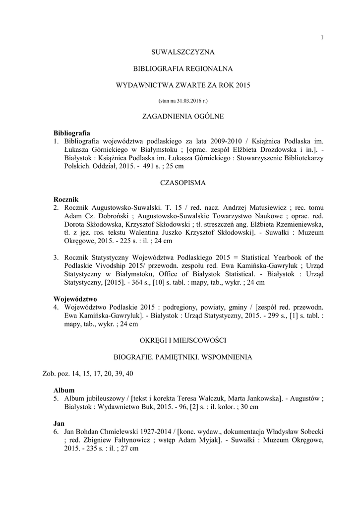 Suwalszczyzna – wydawnictwa za 2015 r – bibliografia regionalna
