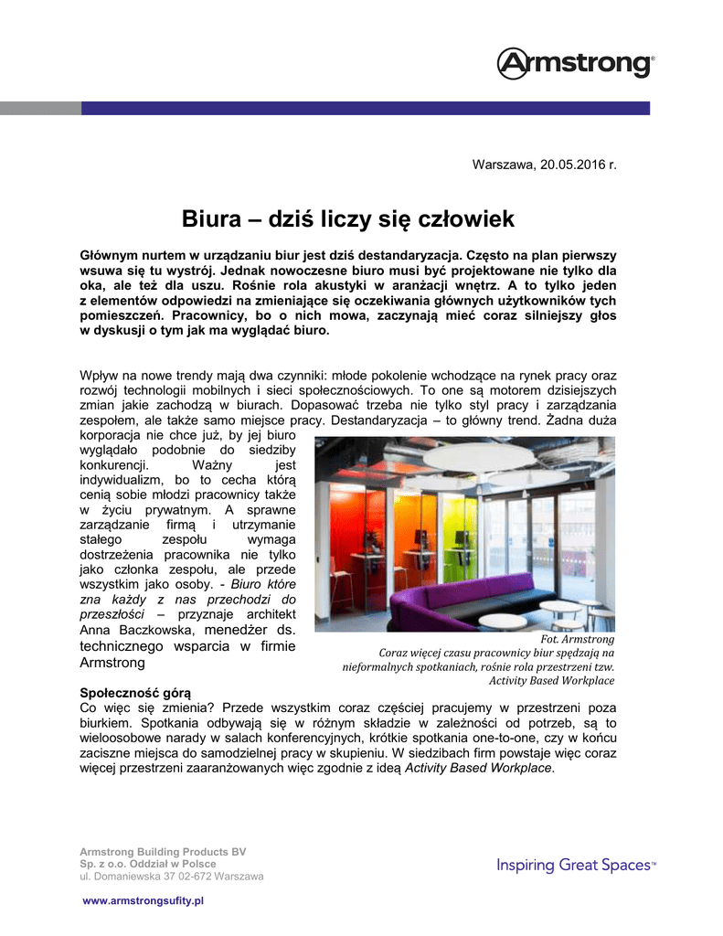 Warszawa, 20.05.2016 r. Biura – dziś liczy się człowiek Głównym nurtem w urządzaniu biur jest dziś destandaryzacja. Często na plan pierwszy wsuwa się tu wystrój. Jednak nowoczesne biuro musi być projektowane nie tylko dla oka, ale też dla uszu. Rośnie rola akustyki w aranżacji wnętrz. A to tylko jeden z elementów odpowiedzi na zmieniające się oczekiwania głównych użytkowników tych pomieszczeń. Pracownicy, bo o nich mowa, zaczynają mieć coraz silniejszy głos w dyskusji o tym jak ma wyglądać biuro. Wpływ na nowe trendy mają dwa czynniki: młode pokolenie wchodzące na rynek pracy oraz rozwój technologii mobilnych i sieci społecznościowych. To one są motorem dzisiejszych zmian jakie zachodzą w biurach. Dopasować trzeba nie tylko styl pracy i zarządzania zespołem, ale także samo miejsce pracy. Destandaryzacja – to główny trend. Żadna duża korporacja nie chce już, by jej biuro wyglądało podobnie do siedziby konkurencji. Ważny jest indywidualizm, bo to cecha którą cenią sobie młodzi pracownicy także w życiu prywatnym. A sprawne zarządzanie firmą i utrzymanie stałego zespołu wymaga dostrzeżenia pracownika nie tylko jako członka zespołu, ale przede wszystkim jako osoby. - Biuro które zna każdy z nas przechodzi do przeszłości – przyznaje architekt Anna Baczkowska, menedżer ds. technicznego wsparcia w firmie Armstrong Fot. Armstrong Coraz więcej czasu pracownicy biur spędzają na nieformalnych spotkaniach, rośnie rola przestrzeni tzw. Activity Based Workplace Społeczność górą Co więc się zmienia? Przede wszystkim coraz częściej pracujemy w przestrzeni poza biurkiem. Spotkania odbywają się w różnym składzie w zależności od potrzeb, są to wieloosobowe narady w salach konferencyjnych, krótkie spotkania one-to-one, czy w końcu zaciszne miejsca do samodzielnej pracy w skupieniu. W siedzibach firm powstaje więc coraz więcej przestrzeni zaaranżowanych więc zgodnie z ideą Activity Based Workplace. Armstrong Building Products BV Sp. z o.o. Oddział w Polsce ul. Domaniewska 37 02-672 Warszawa www.armstrongsufity.pl Te wspólne przestrzenie stają się standardem z jeszcze jednego powodu. W dobie rosnącego odsetka osób pracujących zdalnie z domu, lub będących więcej w delegacjach, niż w biurze istnieje konieczność omówienia od czasu do czasu firmowych tematów w zacisznym miejscu w siedzibie firmy. Wówczas większe lub mniejsze przestrzenie tzw. collaboration area, do wspólnej pracy są nieodzowne. Szacuje, iż na Zachodzie blisko 1/3 osób zatrudnionych w firmach to pracownicy mobilni, którzy spędzają w siedzibie firmy nie więcej niż 50 proc. czasu. Ten trend będzie umacniał się także w Polsce. - Miejsca, gdzie ludzie mogą pracować razem, dyskutować w luźnej atmosferze, wymieniać pomysły, sprzeczać się i tworzyć całkiem nowe rozwiązania stają się konieczne w każdej nowoczesnej firmie – wyjaśnia architekt z Armstrong. Fot. Armstrong Nowoczesne kuchnie pracownicze to designerska przestrzeń wpływająca na poprawę samopoczucia pracowników Kolejna przestrzeń wspólnej pracy i prywatnych rozmów to kuchnie pracownicze. Obraz małego, ciemnego pomieszczenia, gdzie przychodziło się jedynie po to, by zrobić kawę i szybko wrócić na lunch przed monitorem komputera to dziś rozwiązanie nie akceptowane przez młodych pracowników. Ich przywiązanie do firmy buduje się również poprzez komfort przebywania w biurze. Dlatego firmy inwestują w kantyny pracownicze. Coraz częściej to obszerne pomieszczenia, które są przestrzenią do spotkań w luźnej atmosferze. Młodzi ludzie, którzy często prowadzą ekologiczny styl życia wolą odgrzewać sobie przygotowane przez siebie zdrowe posiłki, a nie kupować gotowy lunch od dostawców pojawiających się rano w biurowcu. Jak silny jest to trend pokazuje choćby fakt, że w nowej siedzibie Apple zaprojektowanej przez biuro Foster + Partners, która mieć będzie 260 tys. mkw. powierzchni - aż 8 tys. mkw. stanowić będzie przestrzeń firmowej kantyny. Jedna przestrzeń różne funkcje - dziś open space, jutro gabinet szefa Armstrong Building Products BV Sp. z o.o. Oddział w Polsce ul. Domaniewska 37 02-672 Warszawa www.armstrongsufity.pl Wyznacznik dobrze zaplanowanej powierzchni nowoczesnego biura to też elastyczność na codzienne zmiany. Tak jak szybko zmienia się świat nowych technologii i narzędzi, tak szybko musi dziś zmieniać się biuro. To jeden z podstawowych wymogów dużych firm, które muszą dopasować się do realizowanych aktualnie zadań. W zależności od potrzeb szybko i sprawnie muszą mieć możliwość przearanżowania biura. Otwarta przestrzeń na kilka tygodni zajmować może większość biura, gdy firma prowadzi duży projekt w ramach jednego zespołu. Po tym czasie kolejny kontrakt może wymóc konieczność zmiany biura, tak by dysponować np. większą liczbą niezależnych przestrzeni. Nowa jest też dziś rola architekta. Z jednej strony jest nadal kreatorem. Ale zaczyna też pełnić zupełnie nową funkcję – przejmuje rolę moderatora dyskusji pomiędzy pracodawcą, a pracownikami w procesie urządzania biura. – Architekt przygotowuje rozwiązania zaplanowane zgodnie z wizją i budżetem firmy wynajmującej biuro, musi jednak też zwracać uwagę na aspekty „miękkie” jak oczekiwania, zachowania i psychologiczne elementy pracy osób w niej zatrudnionych – mówi Anna Baczkowska. Zarządy firm w końcu zrozumiały, że odpowiednie biuro to nie tylko wystrój. Budynek ma być dla pracowników, a nie prestiżu firmy. W dobie pokolenia Y to wręcz jeden z silnych argumentów zarządzania satysfakcją ludzi. Widzimy dużą presję na zmianę jakości biura ze strony managerów w korporacjach i mniejszych firmach. Hałas – problem nr 1 w biurach Wygląd i design ważny jest głównie dla ludzi młodych. Ale rozwiązania muszą być podyktowane funkcjonalnością. Nie ma mowy o ar