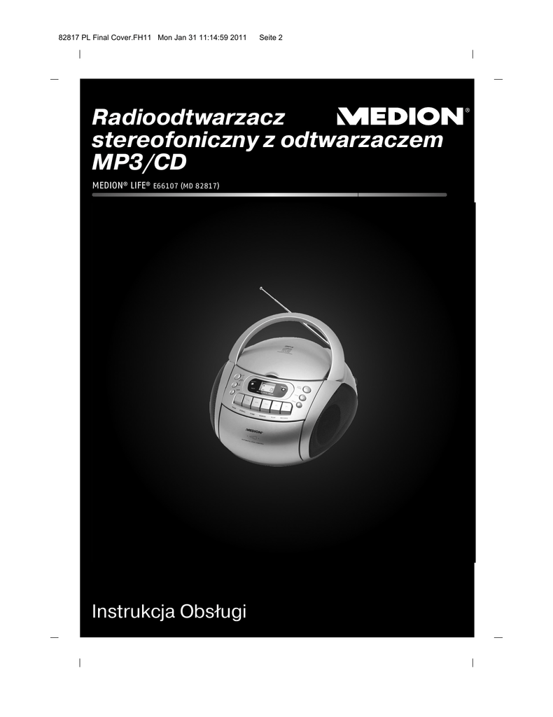 82817 PL Final Cover.FH11 Mon Jan 31 11:14:59 2011 Seite 2 Radioodtwarzacz stereofoniczny z odtwarzaczem MP3/CD MEDION® LIFE® E66107 (MD 82817) Instrukcja Obs³ugi Spis treści Przegląd . . . . . . . . . . . . . . . . . . . . . . . . . . . . . . . . . . . . . . . . . 4 Funkcje ogólne . . . . . . . . . . . . . . . . . . . . . . . . . . . . . . . . . . . . . . . . . . . . . . . . . .4 Funkcje radia . . . . . . . . . . . . . . . . . . . . . . . . . . . . . . . . . . . . . . . . . . . . . . . . . . . .5 Funkcje odtwarzania płyt CD/MP3 . . . . . . . . . . . . . . . . . . . . . . . . . . . . . . . . . . .5 Funkcje magnetofonu kasetowego . . . . . . . . . . . . . . . . . . . . . . . . . . . . . . . . . .5 Wskazówki dotyczące bezpieczeństwa . . . . . . . . . . . . . . . . . 6 Przygotowanie . . . . . . . . . . . . . . . . . . . . . . . . . . . . . . . . . . . . . 11 Rozpakowywanie urządzenia . . . . . . . . . . . . . . . . . . . . . . . . . . . . . . . . . . . . . . 11 Podłączanie do sieci . . . . . . . . . . . . . . . . . . . . . . . . . . . . . . . . . . . . . . . . . . . . . 11 Praca na bateriach instalowanie baterii w urządzeniu . . . . . . . . . . . . . . . . . 12 Opcjonalnie: Podłączanie sluchawek . . . . . . . . . . . . . . . . . . . . . . . . . . . . . . . . 12 Funkcje podstawowe . . . . . . . . . . . . . . . . . . . . . . . . . . . . . . . .13 Włączanie i wyłączanie . . . . . . . . . . . . . . . . . . . . . . . . . . . . . . . . . . . . . . . . . . . 13 Regulacja dźwięku . . . . . . . . . . . . . . . . . . . . . . . . . . . . . . . . . . . . . . . . . . . . . . . 13 Tryb radia . . . . . . . . . . . . . . . . . . . . . . . . . . . . . . . . . . . . . . . .14 Obsługa płyt CD/MP3 . . . . . . . . . . . . . . . . . . . . . . . . . . . . . . .15 Wkładanie i wyjmowanie płyty . . . . . . . . . . . . . . . . . . . . . . . . . . . . . . . . . . . . . 15 PLAY, PAUSE, STOP – płyty CD i MP3 . . . . . . . . . . . . . . . . . . . . . . . . . . . . . . . .16 Szukanie utworów i szybkie przewijanie . . . . . . . . . . . . . . . . . . . . . . . . . . . . . .16 Przycisk MODE: Powtarzanie utworów i odtwarzanie w przypadkowej kolejności . . . . . . . . . . . . . . . . . . . . . . . . . . . . . . . . . . . . . . . . . . . . . . . . . . . . . . 17 Programowanie kolejności odtwarzania . . . . . . . . . . . . . . . . . . . . . . . . . . . . . .18 Odtwarzanie kaset . . . . . . . . . . . . . . . . . . . . . . . . . . . . . . . . 20 Wkładanie kasety . . . . . . . . . . . . . . . . . . . . . . . . . . . . . . . . . . . . . . . . . . . . . . . .20 Odtwarzanie kasety, zatrzymywanie i przerywanie odtwarzania . . . . . . . . . .20 Szybkie przewijanie do przodu i do tyłu . . . . . . . . . . . . . . . . . . . . . . . . . . . . . .20 Autostop . . . . . . . . . . . . . . . . . . . . . . . . . . . . . . . . . . . . . . . . . . . . . . . . . . . . . . . 21 Nagrywanie . . . . . . . . . . . . . . . . . . . . . . . . . . . . . . . . . . . . . . . . . . . . . . . . . . . . 21 Dane Techniczne . . . . . . . . . . . . . . . . . . . . . . . . . . . . . . . . . . 23 Utylizacja . . . . . . . . . . . . . . . . . . . . . . . . . . . . . . . . . . . . . . . . 24 3 Przegląd Funkcje ogólne 4 Funkcje radia Funkcje odtwarzania płyt CD/MP3 Funkcje magnetofonu kasetowego 5 Wskazówki dotyczące bezpieczeństwa Informacje dotyczące niniejszej instrukcji obsługi Przed przystąpieniem do użytkowania produktu proszę uważnie przeczytać wskazówki dotyczące bezpieczeństwa. Stosować się do ostrzeżeń zawartych w instrukcji obsługi. Wszystkie czynności wykonywane przy tym urządzeniu oraz przy jego używaniu wolno wykonywać tylko w sposób opisany w instrukcji obsługi i w podanym tam zakresie. Zawsze przechowywać instrukcje obsługi pod ręką. W przypadku przekazania urządzenia osobie trzeciej należy do niego dołączyć także niniejszą instrukcję obsługi. Użytkowanie zgodne z przeznaczeniem Urządzenie służy do odbioru i odtwarzania stacji radiowych, odtwarzania dźwiękowych płyt CD oraz do nagrywania i odtwarzania kaset dźwiękowych. Urządzenie jest przeznaczone tylko do użytku prywatnego Urządzenia elektryczne nie mogą się znaleźć w rękach dzieci W przypadku połknięcia baterie/akumulatory mogą stwarzać zagrożenie życia. Z tego powodu urządzenie i baterie należy przechować w miejscuniedostępnym dla dzieci. W przypadku połknięcia baterii należy natychmiast zasięgnąć porady lekarskiej. Również opakowania należy przechowywać z dala od dzieci. Istnieje ryzyko uduszenia. Należy pilnować, aby dzieci nigdy nie bawily się urządzeniem. Urządzenie nie może być obsługiwane przez osoby (włączając w to dzieci) z ograniczonymi zdolnościami fizycznymi, zmysłowymi lub umysłowymi, bądź nieposiadające odpowiedniego doświadczenia i/lub wiedzy, chyba, ze korzystają one z urządzenia pod nadzorem osoby odpowiedzialnej za ich bezpieczeństwo lub otrzymały od tej osoby instrukcje dotyczące sposobu korzystania z urządzenia 6 Niebezpieczeństwo dla dzieci i osób osłabionych To urządzenie nie jest przeznaczone do używania przez osoby (włącznie z dziećmi) o ograniczonych zdolnościach fizycznych, zmysłowych i umysłowych lub osoby nieposiadające wystarczającego doświadczenia i/lub wiedzy, chyba że działają one pod nadzorem sprawnej, odpowiedzialnej za nie osoby albo otrzymały od tej osoby wskazówki co do sposobu używania urządzenia. Dzieci należy nadzorować, aby wykluczyć możliwość zabawy urządzeniem. Prawidłowe ustawianie urządzenia Przy ustawianiu urządzenia należy zwracać uwagę na następujące warunki otoczenia: Urządzenie nie nadaje się do używania w pomieszczeniach, w których panuje duża wilgotność powietrza (np. łazienka). Ustawić urządzenie na stabilnym, równym podłożu, unikać uderzeń. Na urządzenie nie mogą działać żadne bezpośrednie źródła ciepła (np. kaloryfery); Urządzenie nie może być narażone