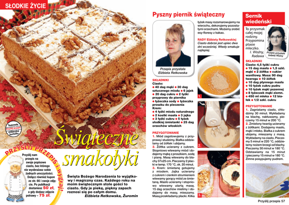 SŁODKIE ŻYCIE Pyszny piernik świąteczny łyżek masy rozsmarowujemy na wierzchu, dekorujemy pozostałymi orzechami. Możemy zrobić esy-floresy z kakao. RADY Elżbiety Retkowskiej Ciasto dobrze jest upiec dwa dni wcześniej. Wtedy smakuje najlepiej. Przepis przysłała Elżbieta Retkowska Testowała pis Przyślij prze redakcyjna kucharka Świąteczne smakołyki Przyślij nam przepis na swoje popisowe ciasto, bez którego nie wyobrażasz sobie żadnych uroczystości. Dołącz również kupon ze str. 66 i swoje zdjęcie. Po publikacji dostaniesz 50 zł, a gdy dodasz zdjęcie potrawy – 75 zł. Święta Bożego Narodzenia to wyjątkowy i magiczny czas. Każdego roku na moim świątecznym stole gości to ciasto. Gdy je piekę, piękny zapach roznosi się po całym domu. Elżbieta Retkowska, Żuromin SKŁADNIKI Ciasto: ● 40 dag mąki ● 30 dag sztucznego miodu ● 6 jajek ● 20 dag cukru ● 2 łyżki przyprawy do piernika ● łyżeczka sody ● łyżeczka proszku do pieczenia Krem: ● 4 łyżki miodu naturalnego ● 2 kostki masła ● 3 jajka ● 3 łyżki cukru ● 5 łyżek słodkiej śmietanki ● 25 dag orzechów włoskich PRZYGOTOWANIE 1. Miód zagotowujemy z przyprawą i studzimy. Białka oddzielamy od żółtek i ubijamy. 2. Żółtka ucieramy z cukrem. Stopniowo wlewamy miód i dodajemy mąkę z proszkiem, sodę i pianę. Masę wlewamy do blachy 37x25 cm. Pieczemy 2 placki w temp. 170 °C, ok. 20 minut. 3. Krem: śmietanę gotujemy z miodem. Jajka ucieramy z cukrem i cienkim strumieniem wlewamy gorący miód ze śmietaną. Masło ucieramy i stopniowo wlewamy utartą masę. 15 dag orzechów mielimy i dodajemy do masy, mieszamy. Masą przekładamy placki. Kilka 1. 2. Sernik wiedeński To przysmak całej mojej rodziny. Przypomina ptasie mleczko. I. Woźny, Radawa Przepis przysłała Izabela Woźny SKŁADNIKI Ciasto: 4,5 łyżki cukru ● 15 dag masła ● 1,5 szkl. mąki ● 2 żółtka ● cukier waniliowy. Masa: 90 dag twarogu ● 10 żółtek ● 10 dag płynnego masła ● 10 łyżek cukru pudru ● 10 łyżek mąki pszennej ● 8 łyżeczek mąki ziemn. ● 450 ml mleka ● 12 białek ● 1/2 szkl. cukru PRZYGOTOWANIE 1. Zagniatamy ciasto, chłodzimy 30 minut. Wykładamy na blachę, nakłuwamy, pieczemy 15 minut w 200 °C. 2. Zmielony twaróg ucieramy z żółtkami. Dodajemy masło, mąki i mleko. Białka z cukrem ubijamy, mieszamy z masą. Wykładamy na ciasto. Pieczemy 5 minut w 220 °C, oddzielamy nożem brzegi od blachy. Pieczemy 30 minut w 180 °C. Odstawiamy na 15 minut i pieczemy 15 minut w 180 °C. Zimne posypujemy pudrem. 3. Przyślij przepis 57