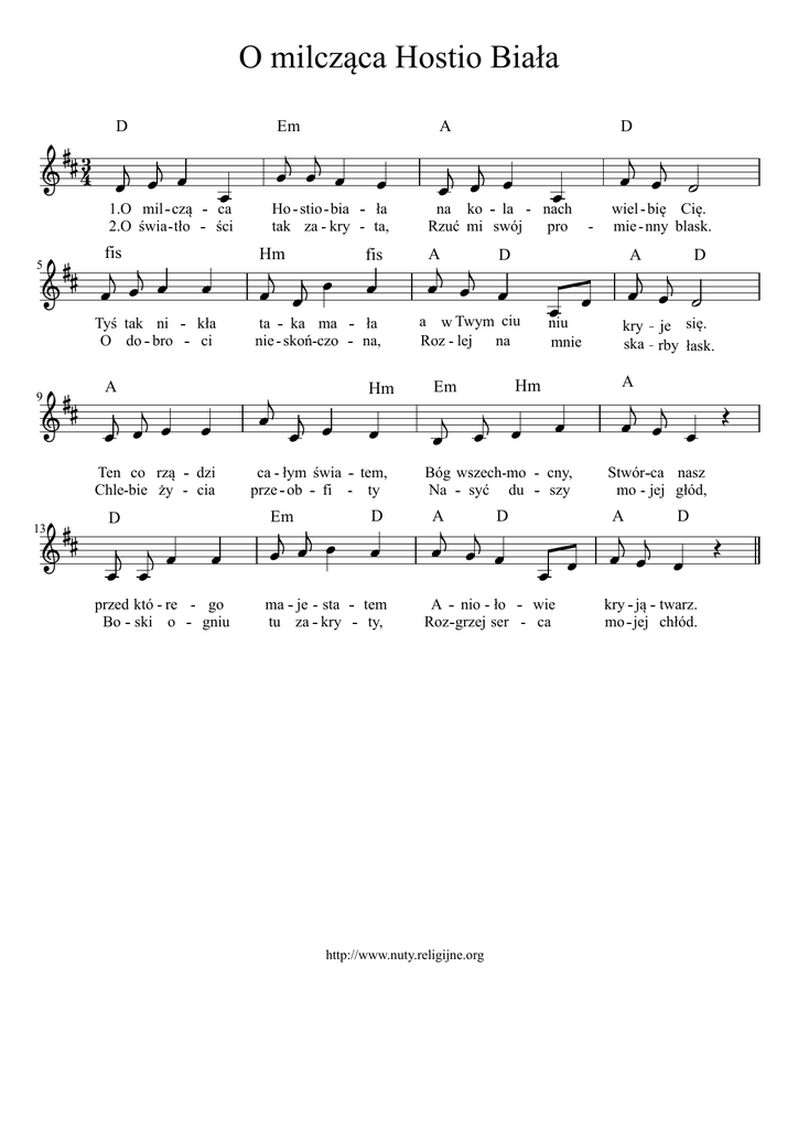 O milcząca Hostio Biała Em D kła ci Ho stio bia tak za kry fis ta ka ma nie skoń czo ła na, Hm dzi cia ca łym świa prze ob fi go gniu tem, ty D Em D przed któ re Bo ski o ła ta, Hm A Ten co rzą Chle bie ży 13 ca ści fis Tyś tak ni O do bro 9 D 43 1.O mil czą 2.O świa tło 5 A ma je sta tu za kry tem ty, na ko la Rzuć mi swój A nach pro D A a w Twym ciu Roz lej na Bóg wszech mo Na syć du D kry je się. ska rby łask. A cny, szy D A nio ło Roz grzej ser http://www.nuty.religijne.org niu mnie Hm Em A wiel bię Cię. mie nny blask. Stwór ca nasz mo jej głód, A wie ca D kry ją twarz. mo jej chłód.