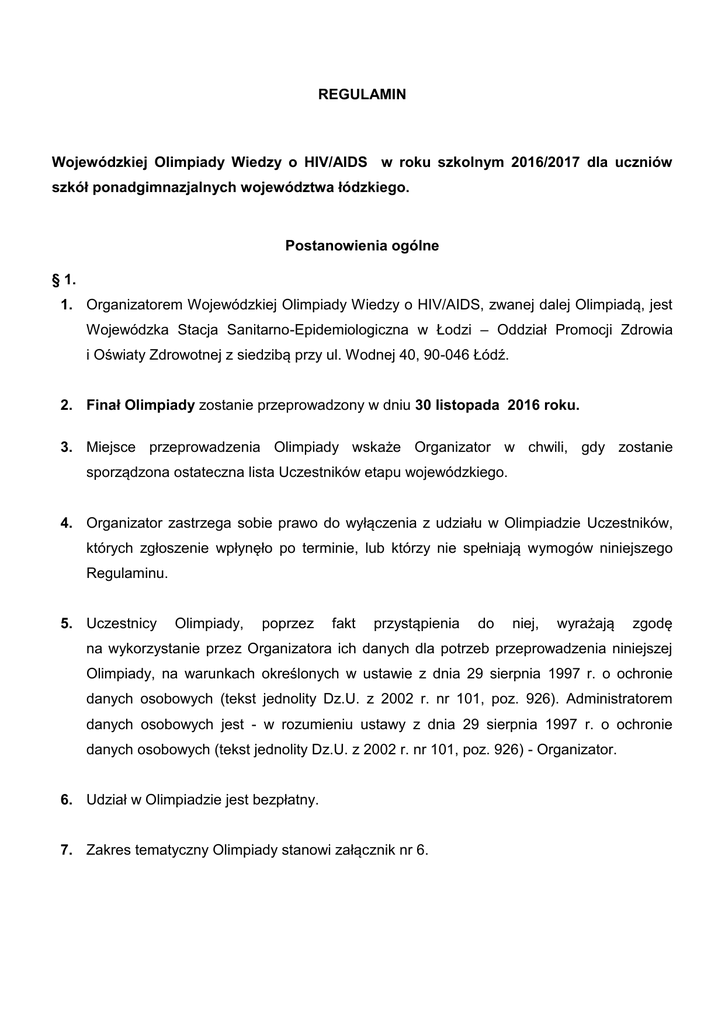 REGULAMIN Wojewódzkiej Olimpiady Wiedzy o HIV/AIDS w roku szkolnym 2016/2017 dla uczniów szkół ponadgimnazjalnych województwa łódzkiego. Postanowienia ogólne § 1. 1. Organizatorem Wojewódzkiej Olimpiady Wiedzy o HIV/AIDS, zwanej dalej Olimpiadą, jest Wojewódzka Stacja Sanitarno-Epidemiologiczna w Łodzi – Oddział Promocji Zdrowia i Oświaty Zdrowotnej z siedzibą przy ul. Wodnej 40, 90-046 Łódź. 2. Finał Olimpiady zostanie przeprowadzony w dniu 30 listopada 2016 roku. 3. Miejsce przeprowadzenia Olimpiady wskaże Organizator w chwili, gdy zostanie sporządzona ostateczna lista Uczestników etapu wojewódzkiego. 4. Organizator zastrzega sobie prawo do wyłączenia z udziału w Olimpiadzie Uczestników, których zgłoszenie wpłynęło po terminie, lub którzy nie spełniają wymogów niniejszego Regulaminu. 5. Uczestnicy Olimpiady, poprzez fakt przystąpienia do niej, wyrażają zgodę na wykorzystanie przez Organizatora ich danych dla potrzeb przeprowadzenia niniejszej Olimpiady, na warunkach określonych w ustawie z dnia 29 sierpnia 1997 r. o ochronie danych osobowych (tekst jednolity Dz.U. z 2002 r. nr 101, poz. 926). Administratorem danych osobowych jest - w rozumieniu ustawy z dnia 29 sierpnia 1997 r. o ochronie danych osobowych (tekst jednolity Dz.U. z 2002 r. nr 101, poz. 926) - Organizator. 6. Udział w Olimpiadzie jest bezpłatny. 7. Zakres tematyczny Olimpiady stanowi załącznik nr 6. Postanowienia specjalne dotyczące zasad przeprowadzenia Wojewódzkiej Olimpiady Wiedzy o HIV/AIDS § 2. 1. Olimpiada adresowana jest do uczniów szkół ponadgimnazjalnych z terenu województwa łódzkiego, zwanych dalej Uczestnikami Olimpiady. 2. Celem Olimpiady jest spopularyzowanie wiedzy młodzieży na temat zapobiegania zakażeniom HIV, wirusowemu zapaleniu wątroby typu B i C, oraz: promowanie zdrowego stylu życia bez narkotyków, alkoholu oraz niedojrzałych i nieodpowiedzialnych zachowań, podwyższenie odpowiedzialności za zdrowie własne i najbliższych, kształtowanie postaw akceptacji i tolerancji wobec osób żyjących z HIV i chorych na AIDS. 3. Formuła Olimpiady zakłada zgłoszenie do uczestnictwa w niej uczniów, zwanych Uczestnikami. 4. Wnioskodawca może zgłosić do udziału w Olimpiadzie maksymalnie trzech uczniów. 5. Wnioskodawcą zgłaszającym uczniów do Olimpiady jest: Dyrektor lub Z-ca Dyrektora szkoły ponadgimnazjalnej z terenu województwa łódzkiego. 6. Wzór wniosku zgłoszeniowego do uczestnictwa w Olimpiadzie stanowi załącznik nr 1 do niniejszego Regulaminu. 7. Czytelnie wypełnione wnioski należy składać w terminie do dnia 14 października 2016 r. do Wojewódzkiej Stacji Sanitarno – Epidemiologicznej w Łodzi, ul. Wodna 40, 90 – 046 Łódź – Organizatora. 8. Do wniosku należy ponadto dołączyć: oświadczenie wnioskodawcy o zapoznaniu się z Regulaminem Olimpiady oraz o przetwarzaniu danych osobowych (zał. nr 2), oświadczenie o zapoznaniu się z Regulaminem Uczestnika Olimpiady, w przypadku ucznia pełnoletniego (zał. nr 3). oświadczenie opiekuna prawnego Uczestnika w sprawie uczestnictwa podopiecznego w Olimpiadzie, w przypadku ucznia niepełnoletniego (zał. nr 4). 9. Nadesłanie zgłoszenia jest równoznaczne z akceptacją Regulaminu. 10. O przyjęciu formularza decyduje data wpływu, a nie data stempla pocztowego. Zgodnie z § 1 ust. 4 wnioski złożone po terminie nie będą rozpatrywane. 11. Olimpiada będzie przebiegać dwuetapowo (etapy powiatowe i etap wojewódzki). 12. Etapy powiatowe Olimpiady zakładają przeprowadzenie testu eliminacyjnego trwającego 60 minut, który pozwoli wyłonić z grona Uczestników najwyżej punktowanych Uczniów – 20 finalistów etapu powiatowego. a) Zadaniem Uczestników będzie udzielenie odpowiedzi na 20 pytań testowych wielokrotnego wyboru oraz 5 pytań problemowych, które będą punktowane w następujący sposób: pytania testowe: odpowiedź prawidłowa – 3 pkt, odpowiedź nieprawidłowa lub brak odpowiedzi – 0 pkt; pytania problemowe: wyczerpująca odpowiedź – 5 pkt, odpowiedź niepełna – od 0.5 do 4.5 pkt, odpowiedź nieprawidłowa lub brak odpowiedzi – 0 pkt. Maksymalna liczba punktów do zdobycia – 85 pkt. b) Etapy powiatowe Olimpiady zostaną zorganizowane na terenie poszczególnych powiatów województwa łódzkiego przez odpowiednie terytorialnie powiatowe stacje sanitarno-epidemiologiczne. Etapy powiatowe odbędą się jednego dnia o tej samej godzinie. Zaplanowany termin: 8 listopada 2016 r. godz. 1000. O miejscu przeprowadzenia Olimpiady oraz liście osób zakwalifikowanych do etapów powiatowych Uczestnicy zostaną powiadomieni. Informacja zostanie zamieszczona również na stronie internetowej WSSE w Łodzi www.pis.lodz.pl Wypełnione testy Uczestników etapów powiatowych, o których mowa w pkt. 12 a zostaną przekazane Organizatorowi a Komisja Konkursowa powołana przez Organizatorów dokona ich oceny merytorycznej. 20 najwyżej punktowanych Uczestników etapów powiatowych Olimpiady zostanie zakwalifikowanych do etapu wojewódzkiego, który odbędzie się 30 listopada 2016 r. Miejsce przeprowadzenia Olimpiady wskaże Organizator w chwili, gdy zostanie sporządzona ostateczna lista Uczestników etapu wojewódzkiego. Lista Finalistów etapu wojewódzkiego ukaże się również na stronie internetowej Organizatora Olimpiady – www.pis.lodz.pl. 13. W drugim etapie Olimpiady, trwającym 60 minut Uczestnicy - finaliści będą odpowiadać na pytania testowe i problemowe przygotowane przez Organizatora. a) Zadaniem Uczestników będzie udzielenie odpowiedzi na 20 pytań testowych wielokrotnego wyboru oraz na 5 pytań problemowych, które będą punktowane w następujący sposób: pytania testowe: odpowiedź prawidłowa – 3 pkt. odpowiedź nieprawidłowa lub brak odpowiedzi – 0 pkt. pytania problemowe: wyczerpująca odpowiedź – 5 pkt. odpowiedź niepełna – od 0.5 do 4.5 pkt. odpowiedź nieprawidłowa lub brak odpowiedzi – 0 pkt. Maksymalna l