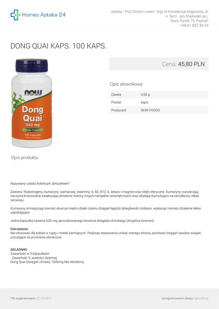 Apteka " Pod Złotym Lwem" mgr M.Konstancja Majewska, dr n. farm. Jan Majewski sp.j. Stary Rynek 75, Poznań +48 61 852 30 24 DONG QUAI KAPS. 100 KAPS. Cena: 45,80 PLN Opis słownikowy Dawka 0,52 g Postać kaps. Producent NOW FOODS Opis produktu Nazywany często kobiecym żeńszeniem” Zawiera: fitoestrogeny, kumaryny, sacharozę, witaminy: A, B2, B12, E, żelazo i magnez oraz olejki eteryczne. Kumaryny rozszerzają naczynia krwionośne zwiększają ukrwienie macicy innych narządów wewnętrznych oraz działają stymulująco na ośrodkowy układ nerwowy. Kumaryny zmniejszają również skurcze mięśni dzięki czemu dzięgiel łagodzi dolegliwości kobiece, wykazuje również działanie lekko uspokajające. Jedna kapsułka zawiera 520 mg sproszkowanego korzenia dzięgiela chińskiego (Angelica sinensis) Ostrzeżenie Nie stosować dla kobiet w ciąży i matek karmiących. Podczas stosowania unikać ostrego słońca, ponieważ dzięgiel zawiera związki uczulające na promienie słoneczne. SKŁADNIKI Zawartość w 3 kapsułkach Zawartość % wartości dziennej Dong Quai (dzięgiel chiński) 1040mg Nie określony Plik wygenerowano: 07-03-2017 Oprogramowanie sklepu: AptusShop Apteka " Pod Złotym Lwem" mgr M.Konstancja Majewska, dr n. farm. Jan Majewski sp.j. Stary Rynek 75, Poznań +48 61 852 30 24 Sposób użycia: 3 kapsułki 2 -3 razy dziennie Zawartość: 100 tabletek Producent: NOW Foods, 395 S Glen Ellynn Road Bloomingedale, Il 60108, USA Przechowywanie: Przechowywać w temperaturze pokojowej, w sposób niedostępny dla małych dzieci. Plik wygenerowano: 07-03-2017 Powered by TCPDF (www.tcpdf.org) Oprogramowanie sklepu: AptusShop