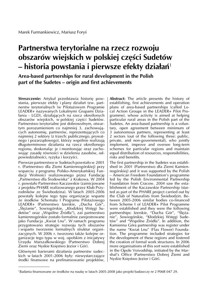 Marek Furmankiewicz, Mariusz Foryś Partnerstwa terytorialne na rzecz rozwoju obszarów wiejskich w polskiej części Sudetów – historia powstania i pierwsze efekty działań1 Area-based partnerships for rural development in the Polish part of the Sudetes – origin and first achievements Streszczenie: Artykuł przedstawia historię pow stania, pierwsze efekty i plany działań tzw. part nerstw terytorialnych (w Pilotażowym Programie LEADER+ nazywanych Lokalnymi Grupami Dzia łania - LGD), działających na rzecz określonych obszarów wiejskich, w polskiej części Sudetów. Partnerstwo terytorialne jest dobrowolnym, otwar tym porozumieniem co najmniej 3, zachowują cych autonomię, partnerów, reprezentujących co najmniej 2 sektory (z trzech: publicznego, prywat nego i pozarządowego), którzy wspólnie realizują długoterminowe działania na rzecz określonego regionu, doskonaląc je i monitorując oraz zacho wując zasadę równości w dzieleniu zasobów, od powiedzialności, ryzyka i korzyści. Pierwsze partnerstwo w Sudetach powstało w 2001 r. (Partnerstwo dla Ziemi Kamiennogórskiej) przy wsparciu z programu Polsko-Amerykańskiej Fun dacji Wolności realizowanego przez Fundację „Partnerstwo dla Środowiska” z Krakowa. W 2004 r. powstało Partnerstwo Kaczawskie (zainicjowane z projektu PHARE realizowanego przez Klub Przy rodników ze Świebodzina). W latach 2005-2006 powstały kolejne tego typu organizacje wsparte ze środków Schematu I Programu Pilotażowego LEADER+ (Partnerstwo Izerskie, „Ducha Gór”, „Ślężanie”, Sowiogórskie, „Kłodzkiej Wstęgi Su detów” oraz „Wspólne Źródła”), zaś partnerstwo kamiennogórskie zostało formalnie zarejestrowane jako Fundacja „Kwiat Lnu”. W ramach programu przygotowano strategie rozwoju tych obszarów i wsparto tworzenie formalnych struktur organi zacyjnych. W 2006 r. tworzono także kolejne or ganizacje tego typu w woj. opolskim z inicjatywy Urzędu Marszałkowskiego (Partnerstwo Dobrej Ziemi oraz Nyskie Księstwo Jezior i Gór). Głównymi barierami działania partnerstw sudec kich w latach 2001-2006 były: niewystarczające środki finansowe na prefinansowanie projektów, 1 Abstract: The article presents the history of establishing, first achievements and operation plans of area-based partnerships (called Lo cal Action Groups in the LEADER+ Pilot Pro gramme), whose activity is aimed at helping particular rural areas in the Polish part of the Sudetes. An area-based partnership is a volun tary, open agreement between minimum of 3 autonomous partners, representing at least 2 sectors (out of the following three: public, private, and non-governmental), who jointly implement, improve and oversee long-term schemes for particular regions and maintain equal distribution of resources, responsibilities, risks and benefits. The first partnership in the Sudetes was establi shed in 2001 (Partnerstwo dla Ziemi Kamien nogórskiej) and it was supported by the Polish – American Freedom Foundation’s programme led by the Polish Environmental Partnership Foundation from Cracow. 2004 saw the esta blishment of the Kaczawskie Partnership (star ted as part of the PHARE project carried out by the Club of Naturalists from Świebodzin. Be tween 2005-2006 similar bodies co-financed from Scheme I of LEADER+ Pilot Programme were established and they were the following partnerships: Izerskie, “Ducha Gór”, “Ślęża nie”, Sowiogórskie, “Kłodzkiej Wstęgi Sude tów” and “Wspólne Źródła”. In addition, the Kamienna Góra partnership was register under the name “Kwiat Lnu” (Flax Flower) Founda tion. The programme included strategies for the development of these regions and fostered the creation of formal work structures. In 2006 more organisations of this sort were established in the Opole Voivodship, initiated by the Mar shal’s Office (Partnerstwo Dobrej Ziemi and Nyskie Księstwo Jezior i Gór). Badania finansowane ze środków na naukę w latach 2005-2008 jako projekt badawczy nr 2 P06R 047 29. 110 MAREK FURMANKIEWICZ, MARIUSZ FORYŚ które później uzyskują zwrot kosztów ze środ ków Unii Europejskiej, trudności prawne wynika jące z braku w Polsce form prawnych, w których na równych prawach współpracować mogłyby samorządy, organizacje pozarządowe i przed siębiorstwa; niewystarczająca liczba personelu obsługującego działania organizacji i tendencje do dominacji niektórych sektorów (zwykle samo rządów lokalnych) w działaniach grupy, trudno ści z zaangażowaniem lokalnych środowisk spo łecznych i słabe struktury organizacyjne. Liczba projektów zrealizowanych przez part nerstwa do połowy 2006 r., ze względu na ich krótkie funkcjonowanie, jest niewielka i dotyczy drobnej infrastruktury i promocji turystycznej, edukacji ekologicznej oraz lokalnych imprez (targi produktów lokalnych, imprezy kulturalne etc.). Generalnie sprzyjają one procesom ekoro zwoju Sudetów poprzez promowanie działalno ści gospodarczej nieuciążliwej dla środowiska. Powstałe LGD mogą stanowić bazę dla realizacji przygotowanych strategii rozwoju przez społecz ności i organizacje lokalne, zarówno w ramach wdrażanego w latach 2006-2007 Schematu II Pilotażowego Programu LEADER+, jak i w latach 2007-2013 w ramach Planu Rozwoju Obszarów Wiejskich, który przewiduje znaczne środki fi nansowe na wsparcie tego typu lokalnych koali cji. The major factors which restricted the functio ning of the Sudetes partnerships between 2001 -2006 were as follows: insufficient funds to co ver pre-financing of projects to be later refunded by UE, legal obstacles resulting from the lack of related legislation in Poland, which would enable local governments, non-governmental bodies and companies to cooperate on equal terms, insufficient number of staff to run the organisations and general tendency for certain sectors (usually local governments) to dominate the group work. The number of projects accomplished by the 