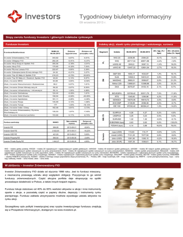 Tygodniowy biuletyn informacyjny 09 września 2013 r. Stopy zwrotu funduszy Investors i głównych indeksów rynkowych Indeksy akcji, stawki rynku pieniężnego i walutowego, surowce Fundusze Investors Fundusz/Subfundusz WAN/JU 06.09.2013 Zmiana tygodniowa Zmiana od początku roku Segment Indeks 06.09.2013 30.08.2013 Zm. tyg. (% / bps) Zm. od pocz. roku (% / bps) -13,3% 343,82 0,07% 4,01% WIG 20 2238,98 2384,22 -6,1% Inv estor Obligacji FIO 282,28 -0,91% -0,37% WIG 46717,04 48871,98 -4,4% -1,6% Inv estor Akcji Duży ch Spółek FIO 355,56 -2,35% -3,91% mWIG 40 3043,5 3087,13 -1,4% 19,2% Inv estor Akcji FIO 175,65 -0,32% 7,54% sWIG 80 12457,22 12801,04 -2,7% 19,3% Inv estor Pły nna Lokata FIO 222,67 0,00% 2,26% S&P 500 1655,17 1632,97 1,4% 16,1% DJIA 14922,5 14810,31 0,8% 13,9% NASDAQ 3660,01 3589,87 2,0% 21,2% 1,61% Nikkei 225 13860,81 13388,86 3,5% 33,3% DAX 8275,67 8103,15 2,1% 8,7% 24,32 -0,21% 3,27% 218,23 -0,75% 20,65% Inv estor Top 50 Mały ch i Średnich Spółek FIO 46,64 0,13% 8,97% (Sub.) Inv estor BRIC 60,88 4,00% -8,56% Inv estor Top 25 Mały ch Spółek FIO (Sub.) Inv estor Nieruchomości i Budownictwa 58,2 0,57% DM Inv estor Zabezpieczenia Emery talnego FIO PL Inv estor Zrównoważony FIO 58,22 2,07% 8,50% (Sub.) Inv estor Inf rastruktury i Inf ormaty ki 59,14 1,30% 4,88% (Sub.) Inv estor Gotówkowy 124,44 -0,05% 1,61% BOVESPA 53749,42 50011,75 7,5% -11,8% (Sub.) Inv estor Gold Otwarty 158,94 -0,60% -20,89% RTS 1345,60 1290,96 4,2% -11,9% (Sub.) Inv estor Agrobiznes 181,11 2,28% -4,46% SENSEX 19270,06 18619,72 3,5% -0,8% (Sub.) Inv estor Rosja 145,99 4,13% -1,86% SHCOMP 2139,99 2098,38 2,0% -5,7% (Sub.) Inv estor Turcja 177 1,33% -18,12% (Sub.) Inv estor Indie i Chiny 162,48 3,91% -3,73% ISE 100 67232,42 66394,41 1,3% -14,0% (Sub.) Inv estor Zrównoważony Ry nków Wschodzący ch 135,53 1,07% -7,40% EURPLN 4,28 4,27 0,2% 4,9% (Sub.) Inv estor Amery ka Łacińska 153,66 5,11% -8,74% USDPLN 3,25 3,23 0,5% 5,0% EURUSD 1,32 1,32 -0,3% -0,1% WIBOR6M (bps) 2,63 2,63 0,0% -135,0% PZSW5 (bps) 4,14 3,98 16,5% 79,0% Investor FIZ WAN/CI Data ostatniej w yceny 984,08 2013-08-31 -8,04% Investor Gold FIZ 2 022,93 2013-08-31 -18,22% Investor CEE FIZ 421,93 2013-08-31 5,00% Investor Property FIZ 983,54 2013-06-30 -2,49% 1 642,27 2013-06-30 4,95% Investor Private Equity FIZ MM / FX Zm iana od początku roku Surowce Fundusz zam knięty EM (Sub.) Inv estor Zmian Klimaty czny ch ropa (USD) 115,63 116,17 -0,5% 3,3% miedź (USD) 7131,25 7077,50 0,8% -9,8% złoto (USD) 1391,90 1395,15 -0,2% -16,9% złoto (EUR) 1057,35 1056,61 0,1% -16,7% WIG – Indeks giełdy polskiej, WIG20 – Indeks 20 największych i najpłynniejszych spółek giełdowych, mWIG40 - Indeks 40 średnich spółek giełdowych, sWIG80 – Indeks 80 małych spółek giełdowych, S&P500 Indeks 500 największych spółek notowanych na rynku amerykańskim, DIJA - Indeks 30 największych spółek notowanych na rynku amerykańskim, NASDAQ - Indeks spółek amerykańskich, Nikkei225 - Indeks 225 największych spółek notowanych na rynku japońskim, DAX – Indeks 30 największych spółek notowanych na rynku niemieckim, BOVESPA - Indeks największych i najbardziej płynnych spółek rynku brazylijskiego, RTS - Indeks największych spółek rynku rosyjskiego, SENSEX - Indeks największych i najbardziej płynnych spółek rynku indyjskiego, SHCOMP - Indeks giełdy chińskiej, ISE100 - Indeks giełdy tureckiej, WIBOR6M – stawka WIBOR 6 miesięczna, PZSW5 - stawka 5 letniego swapa (pięcioletnia stopa procentowa), PL – Polska, DM – kraje rozwinięte, EM – kraje rozwijające się, MM/FX – rynek pieniężny/walutowy, ropa – cena ropy naftowej, miedź – cena miedzi, złoto – cena złota. W zbliżeniu – Investor Zrównoważony FIO Investor Zrównoważony FIO działa od stycznia 1998 roku. Jest to fundusz mieszany, z nieznaczną przewagą udziału akcji względem obligacji. Pozycjonuje to go wśród funduszy zrównoważonych. Część akcyjna portfela daje ekspozycję na spółki prowadzące działalność w Polsce, a także innych krajach regionu. Fundusz lokuje statutowo od 40% do 65% wartości aktywów w akcje i inne instrumenty oparte o akcje, a pozostałą część w papiery dłużne, depozyty i instrumenty rynku pieniężnego. Fundusz zakłada utrzymywanie możliwie wysokiego udziału aktywów na rynku akcji. Szczegółowy opis polityki inwestycyjnej oraz ryzyka inwestycyjnego funduszu znajdują się w Prospekcie Informacyjnym, dostępnym na www.investors.pl. Komentarz rynkowy Ubiegły tydzień był całkiem udany dla znakomitej większości rynków akcyjnych na świecie – niechlubnym wyjątkiem był warszawska giełda. Przy braku międzynarodowego wsparcia i zdecydowanemu sprzeciwowi Rosji, Stany Zjednoczone raczej prędko nie zaatakują Syrii, co z kolei będzie pozytywnie wpływać na indeks Standard&Poors 500 (zyskał 1,4%), przynajmniej do posiedzenia FED’u w przyszłym tygodniu, kiedy to ma być podjęta decyzja odnośnie dalszych losów ekspansywnej polityki monetarnej. W tej sytuacji rośnie zarówno Europa zachodnia (niemiecki DAX 2,1%; brytyjski FT-SE 100 2,1%), ale też odbija rynek turecki (ISE100 1,3%). Dobre dane makro płynące z Chin pozytywnie wpłynęły zarówno na lokalną giełdę (HangSeng wzrósł 4,1%) jak i na rynki zamorskie. Na szczególną uwagę zasługuje tu parkiet brazylijski ze spektakularnym zyskiem 7,5%. Jest to najlepszy wynik tygodniowy od 2011 roku i ładna kontynuacja odbicia. Motorem wzrostów były spółki eksportujące surowce do Chin. Przodował tu producent rudy żelaza Valeo. Wzrosty byłyby pewnie jeszcze większe, gdyby nie przeszkadzały im problemy spółki OGX Petroleo e Gas Participacoes SA, które właścicielem jest Eike Batista (jeden z najbogatszych ludzi świata). Spółka chce zgodnie z posiadanymi opcjami pozyskać od Batisty 1miliard dolarów, na co przedsiębiorca nie ma specjalnie ochoty. Po drugiej stronie spektrum stóp zwrotu znajduje się warszawski r