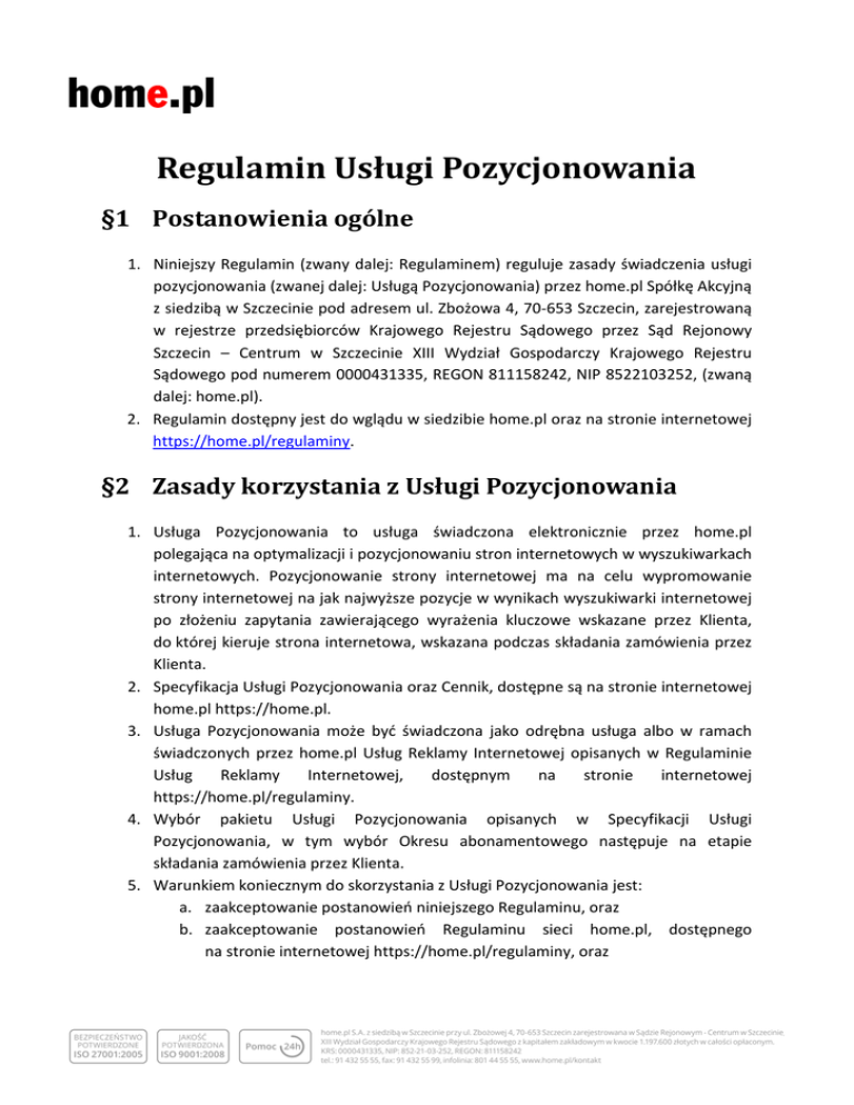 Regulamin Usługi Pozycjonowania §1 Postanowienia ogólne 1. Niniejszy Regulamin (zwany dalej: Regulaminem) reguluje zasady świadczenia usługi pozycjonowania (zwanej dalej: Usługą Pozycjonowania) przez home.pl Spółkę Akcyjną z siedzibą w Szczecinie pod adresem ul. Zbożowa 4, 70-653 Szczecin, zarejestrowaną w rejestrze przedsiębiorców Krajowego Rejestru Sądowego przez Sąd Rejonowy Szczecin – Centrum w Szczecinie XIII Wydział Gospodarczy Krajowego Rejestru Sądowego pod numerem 0000431335, REGON 811158242, NIP 8522103252, (zwaną dalej: home.pl). 2. Regulamin dostępny jest do wglądu w siedzibie home.pl oraz na stronie internetowej https://home.pl/regulaminy. §2 Zasady korzystania z Usługi Pozycjonowania 1. Usługa Pozycjonowania to usługa świadczona elektronicznie przez home.pl polegająca na optymalizacji i pozycjonowaniu stron internetowych w wyszukiwarkach internetowych. Pozycjonowanie strony internetowej ma na celu wypromowanie strony internetowej na jak najwyższe pozycje w wynikach wyszukiwarki internetowej po złożeniu zapytania zawierającego wyrażenia kluczowe wskazane przez Klienta, do której kieruje strona internetowa, wskazana podczas składania zamówienia przez Klienta. 2. Specyfikacja Usługi Pozycjonowania oraz Cennik, dostępne są na stronie internetowej home.pl https://home.pl. 3. Usługa Pozycjonowania może być świadczona jako odrębna usługa albo w ramach świadczonych przez home.pl Usług Reklamy Internetowej opisanych w Regulaminie Usług Reklamy Internetowej, dostępnym na stronie internetowej https://home.pl/regulaminy. 4. Wybór pakietu Usługi Pozycjonowania opisanych w Specyfikacji Usługi Pozycjonowania, w tym wybór Okresu abonamentowego następuje na etapie składania zamówienia przez Klienta. 5. Warunkiem koniecznym do skorzystania z Usługi Pozycjonowania jest: a. zaakceptowanie postanowień niniejszego Regulaminu, oraz b. zaakceptowanie postanowień Regulaminu sieci home.pl, dostępnego na stronie internetowej https://home.pl/regulaminy, oraz c. zaakceptowanie postanowień Regulaminu Usług Reklamy Internetowej, dostępnego na stronie internetowej https://home.pl/regulaminy, w przypadku, gdy Usługa Pozycjonowania jest świadczona w ramach świadczonych przez home.pl Usług Reklamy Internetowej, oraz d. zaakceptowanie i zobowiązanie się do spełnienia warunków technicznych, w tym udzielenia informacji i dostępów, koniecznych do ustawienia parametrów niezbędnych do wykonania Usługi Pozycjonowania wskazanych przez specjalistę z home.pl w trybie pkt. 6 poniżej. 6. Po dokonaniu przez Klienta zapłaty wynagrodzenia homel.pl z tytułu zakupu Usługi Pozycjonowania specjalista z home.pl skontaktuje się z Klientem telefonicznie na numer telefonu podany przez Klienta w Panelu Klienta celem otrzymania informacji koniecznych do ustawienia parametrów niezbędnych do wykonania w trybie elektronicznym Usługi Pozycjonowania. 7. home.pl rozpoczyna wykonywanie działań w ramach Usługi Pozycjonowania po otrzymaniu od Klienta informacji koniecznych do ustawienia parametrów niezbędnych do wykonania w trybie elektronicznym Usługi Pozycjonowania w trybie pkt. 6 powyżej. 8. home.pl wykonuje działania w ramach Usługi Pozycjonowania zgodnie z ustaleniami uzgodnionymi w trybie pkt. 6 powyżej. 9. Poszczególne działania w ramach Usługi Pozycjonowania mogą rozpocząć się w terminie wskazanym przez Klienta, przy czym ich termin rozpoczęcia i zakończenia nie może przekroczyć Okresu abonamentowego Usługi Pozycjonowania. 10. home.pl zobowiązuje się umożliwić Klientowi monitorowanie efektów Usługi Pozycjonowania w panelu monitoringu pozycji. W tym celu home.pl w terminie 7 dni roboczych od dnia otrzymania ceny z tytułu Usługi Pozycjonowania prześle Klientowi w trybie elektronicznym na adres email podany w Panelu Klienta dane konieczne do uzyskania dostępu do panelu monitoringu pozycji, w tym login i hasło. §3 Realizacja Usługi Pozycjonowania 1. Sposób i zakres świadczenia Usługi Pozycjonowania przez home.pl uzależniony jest od technologii i specyfiki strony internetowej Klienta oraz uzyskania przez home.pl wszelkich dostępów i pozwoleń od Klienta, wskazanych w niniejszym Regulaminie. 2. home.pl jest uprawniony do żądania usunięcia ze strony internetowej Klienta elementów uniemożliwiających lub utrudniających wykonanie Usługi Pozycjonowania. 3. W trakcie realizacji Usługi Pozycjonowania na różnych Data Center wyszukiwarki Google mogą występować różnice pozycji strony internetowej Klienta, spowodowane specyfiką i ustawieniami działaniami wyszukiwarki Google, co związane jest miedzy innymi z posiadaniem przez firmę Google wielu Data Center w różnych lokalizacjach, w których wyniki są aktualizowane nie zawsze w tym samym czasie. Wskazany brak pełnej synchronizacji czasowej może wywołać różnice w odpowiedziach na zapytania składane do różnych Data Center firmy Google przez system sprawdzania pozycji, za pośrednictwem jego serwerów i infrastruktury, co nie oznacza nieprawidłowości w realizacji Usługi, a Klient akceptuje ten fakt i zobowiązuje się nie zgłaszać wobec home.pl jakichkolwiek roszczeń z tym związanych. 4. Klient zobowiązuje się do: a. niedokonywania nieuzgodnionych z home.pl zmian w kodzie źródłowym strony internetowej Klienta, b. utrzymywania dostępności strony internetowej objętej Usługą Pozycjonowania, c. wprowadzania zmian treści i grafik strony internetowej zaproponowanych przez home.pl koniecznych dla wykonania Usługi Pozycjonowania, d. nietworzenia kopii zapasowej strony internetowej, niezlecania jej wykonania, ale także niekopiowania i nieprzenoszenia w całości bądź w części treści zamieszczonych na stronie internetowej na inne strony internetowe bądź serwisy, w tym gazety internetowe, blogi, fora internetowe, e. niestosowania automatycznego przekierowywania na stronie internetowej na inną domenę niż wskazana podczas zamawia