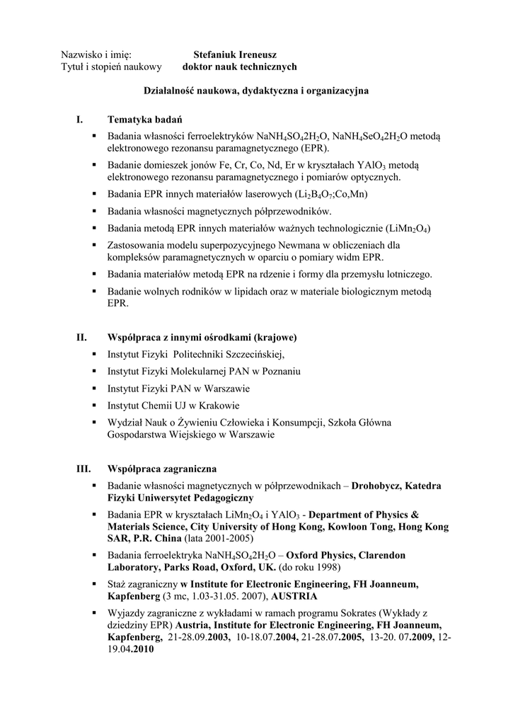 Nazwisko i imię: Tytuł i stopień naukowy Stefaniuk Ireneusz doktor nauk technicznych Działalność naukowa, dydaktyczna i organizacyjna Tematyka badań I. Badania własności ferroelektryków NaNH4SO42H2O, NaNH4SeO42H2O metodą elektronowego rezonansu paramagnetycznego (EPR). Badanie domieszek jonów Fe, Cr, Co, Nd, Er w kryształach YAlO3 metodą elektronowego rezonansu paramagnetycznego i pomiarów optycznych. Badania EPR innych materiałów laserowych (Li2B4O7;Co,Mn) Badania własności magnetycznych półprzewodników. Badania metodą EPR innych materiałów ważnych technologicznie (LiMn2O4) Zastosowania modelu superpozycyjnego Newmana w obliczeniach dla kompleksów paramagnetycznych w oparciu o pomiary widm EPR. Badania materiałów metodą EPR na rdzenie i formy dla przemysłu lotniczego. Badanie wolnych rodników w lipidach oraz w materiale biologicznym metodą EPR. Współpraca z innymi ośrodkami (krajowe) II. Instytut Fizyki Politechniki Szczecińskiej, Instytut Fizyki Molekularnej PAN w Poznaniu Instytut Fizyki PAN w Warszawie Instytut Chemii UJ w Krakowie Wydział Nauk o Żywieniu Człowieka i Konsumpcji, Szkoła Główna Gospodarstwa Wiejskiego w Warszawie Współpraca zagraniczna III. Badanie własności magnetycznych w półprzewodnikach – Drohobycz, Katedra Fizyki Uniwersytet Pedagogiczny Badania EPR w kryształach LiMn2O4 i YAlO3 - Department of Physics & Materials Science, City University of Hong Kong, Kowloon Tong, Hong Kong SAR, P.R. China (lata 2001-2005) Badania ferroelektryka NaNH4SO42H2O – Oxford Physics, Clarendon Laboratory, Parks Road, Oxford, UK. (do roku 1998) Staż zagraniczny w Institute for Electronic Engineering, FH Joanneum, Kapfenberg (3 mc, 1.03-31.05. 2007), AUSTRIA Wyjazdy zagraniczne z wykładami w ramach programu Sokrates (Wykłady z dziedziny EPR) Austria, Institute for Electronic Engineering, FH Joanneum, Kapfenberg, 21-28.09.2003, 10-18.07.2004, 21-28.07.2005, 13-20. 07.2009, 1219.04.2010 Udział w grantach (po roku 2000) IV. Grant zagraniczny City Unviersity of Hong Kong (AP PR T91422)wykonawca (interpretacja widm EPR) (2003-2007) Grant KBN Nr 1 PO3B 02127 - magnetyczne własności roztworów stałych CdCrTe z dużą zawartością Cr.- główny wykonawca (2004-2006) Grant inwestycyjny Wyposażenie do spektrometru elektronowego rezonansu paramagnetycznego Udział w badaniach nowych materiałów w ramach Centrum Zaawansowanych Technologii "AERONET - Dolina Lotnicza", w Projekcie "Nowoczesne technologie materiałowe stosowane w przemyśle lotniczym", Nr POIG.01.01.02-00-015/08-00 w Programie Operacyjnym Innowacyjna Gospodarka (PO IG). Grant KBN: N202 148 31/2726,- Modelowanie SPM i NCC oraz korelacja własności strukturalnych, spektroskopowych i magnetycznych jonów przejściowych w materiałach ważnych technologicznie. Miejsce realizacji: Politechnika Szczecińska do 2008 i od 2009 Zachodniopomorski Uniwersytet Technologiczny w Szczecinie, Instytut Fizyki Grant KBN: N N507 264740 Technologia PLD cienkich warstw Cr1-xTe oraz Zn1-xCrxTe, Uniwersytet Rzeszowski\Wydział Matematyczno-Przyrodniczy. Termin rozpoczęcia umowy 2011-05-25.Termin zakończenia umowy 2013-05-24 Osiągnięcia V. Wykrycie przejścia fazowego II rodzaju w krysztale NaNH4SO42H2O domieszkowanym chromem oraz w czystym metodą EPR oraz pomiarów dielektrycznych. Wykonanie oprogramowania w Labview oraz sprzęgnięcie komputera ze spektrometrem EPR do sterowania i akwizycji danych Wykonanie specjalistycznego oprogramowania do analizy i obliczeń widm EPR oraz modelu superpozycyjnego z wykorzystaniem metody Monte-Carlo przy pomocy języka obiektowego Delphi. Zakup używanego spektrometru EPR i jego uruchomienie (pierwsze pomiary wykonano 6.01.2006) Zorganizowanie pracowni w Laboratorium nr 1 Uniwersyteckiego Centrum Innowacji i Transferu Wiedzy Techniczno-Przyrodniczej, zakup nowoczesnego spektrometru EPR i jego uruchomienie. VI. Dorobek dydaktyczny Cykle wykładów z dziedziny EPR prowadzone dla studentów w Institute for Electronic Engineering, (FH Joanneum, Kapfenberg, Austria) w ramach programu Sokrates w latach 21-28.09.2003, 10-18.07.2004, 21-28.07.2005, 13-20. 07.2009, 12-19.04.2010 Wygłoszenie wykładu w IF Politechniki Szczecińskiej nt: „Własności magnetyczne stopów Cd1-xCrxTe” w dn 25.01.2008 Wykład wygłoszony w Instytucie Chemii Uniwersytetu Jagiellońskiego NT: „EPR jonu Co2+ w krysztale YAlO3”. Kraków 22.03 2002. Wygłoszenie wykładu na Wydziale Technologii Żywności SGGW nt: „Zastosowanie metody EPR w badaniach wolnych rodników” w dn 25.04.2009 Prowadzenie wykładów, ćwiczeń i laboratoriów z szeregu przedmiotów: fizyka ogólna, elektronika, fizyka kwantowa, techniki laserowe, optyka atmosfery, mechanika płynów, termodynamika techniczna, agrofizyka, materiały inżynierskie. Organizacja i unowocześnienie pracowni fizycznej, oraz opracowanie nowych ćwiczeń. seminarium dyplomowe ( promotor około 40 prac licencjackich/ inżynierskich oraz 5 prac magisterskich) VII. Organizacja pracowni studenckich Organizacja od podstaw nowej pracowni do przedmiotu Techniki laserowe Udział w zorganizowaniu Pracowni Mikroanalizy składu gleby i wody VIII. Inna działalność Członek zespołu ekspertów w Komitecie Technicznym d.s. Optyki i przyrządów optycznych, Polskiego Komitetu Normalizacyjnego, - reprezentant UR Ekspert Zewnętrzny Narodowego Programu Foresight Polska 2020 Wyróżnienia i nagrody IX. Nagroda Rektora Wyższej Szkoły Pedagogicznej w Rzeszowie - 2 razy (1989, 1997) Nagroda Rektora Uniwersytetu Rzeszowskiego 2008 , za osiągnięcia naukowe. Podziękowanie od Rektora UR za prowadzenie zajęć w języku angielskim dla studentów zagranicznych uczelni partnerskich UR w ramach programu Erazmus Wyróżnienia biograficzne X. Tytuł “Outstanding Scientist of the 21th Century” nadany przez International Biographical Centre Nominacja do “25th Silver Anniversary Edition of Who’s Who in the World” Nota biograficzna w “10th An