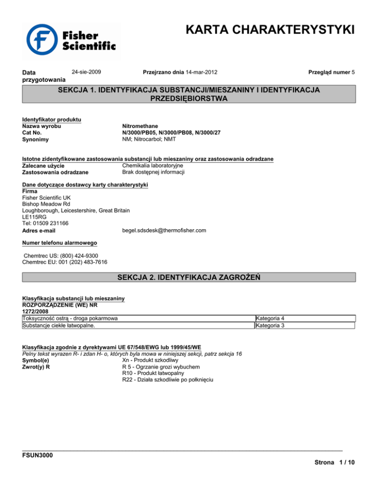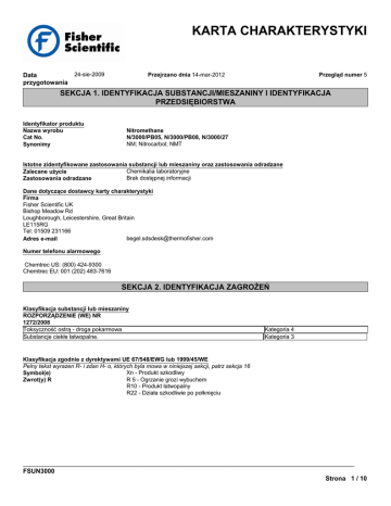 KARTA CHARAKTERYSTYKI 24-sie-2009 Data przygotowania Przejrzano dnia 14-mar-2012 Przegląd numer 5 SEKCJA 1. IDENTYFIKACJA SUBSTANCJI/MIESZANINY I IDENTYFIKACJA PRZEDSIĘBIORSTWA Identyfikator produktu Nazwa wyrobu Cat No. Synonimy Nitromethane N/3000/PB05, N/3000/PB08, N/3000/27 NM; Nitrocarbol; NMT Istotne zidentyfikowane zastosowania substancji lub mieszaniny oraz zastosowania odradzane Chemikalia laboratoryjne Zalecane użycie Brak dostępnej informacji Zastosowania odradzane Dane dotyczące dostawcy karty charakterystyki Firma Fisher Scientific UK Bishop Meadow Rd Loughborough, Leicestershire, Great Britain LE115RG Tel: 01509 231166 [email protected] Adres e-mail Numer telefonu alarmowego Chemtrec US: (800) 424-9300 Chemtrec EU: 001 (202) 483-7616 SEKCJA 2. IDENTYFIKACJA ZAGROŻEŃ Klasyfikacja substancji lub mieszaniny ROZPORZĄDZENIE (WE) NR 1272/2008 Toksyczność ostrą - droga pokarmowa Substancje ciekłe łatwopalne. Kategoria 4 Kategoria 3 Klasyfikacja zgodnie z dyrektywami UE 67/548/EWG lub 1999/45/WE Pelny tekst wyrazen R- i zdan H- o, których byla mowa w niniejszej sekcji, patrz sekcja 16 Xn - Produkt szkodliwy Symbol(e) R 5 - Ogrzanie grozi wybuchem Zwrot(y) R R10 - Produkt łatwopalny R22 - Działa szkodliwie po połknięciu _____________________________________________________________________________________________ FSUN3000 Strona 1 / 10 KARTA CHARAKTERYSTYKI Przejrzano dnia 14-mar-2012 Nitromethane _____________________________________________________________________________________________ SEKCJA 2. IDENTYFIKACJA ZAGROŻEŃ Elementy etykiety Hasło ostrzegawcze Uwaga Zwroty wskazujące rodzaj zagrożenia H302 - Działa szkodliwie po połknięciu H226 - Łatwopalna ciecz i pary Zwroty wskazujace srodki ostroznosci P301 + P312 - W PRZYPADKU POŁKNIĘCIA: W przypadku złego samopoczucia skontaktować się z OŚRODKIEM ZATRUĆ lub z lekarzem P304 + P340 - W PRZYPADKU DOSTANIA SIĘ DO DRÓG ODDECHOWYCH: wyprowadzić lub wynieść poszkodowanego na świeże powietrze i zapewnić warunki do odpoczynku w pozycji umożliwiającej swobodne oddychanie P210 - Przechowywać z dala od źródeł ciepła/iskrzenia/otwartego ognia/gorących powierzchni. Palenie wzbronione Inne zagrożenia Brak dostępnej informacji. SEKCJA 3. SKŁAD/INFORMACJA O SKŁADNIKACH Składniki Nitromethane 75-52-5 Nr WE. Procent wagowy Nr CAS 67/548/EEC klasyfikacji EEC No. 200-876-6 >95 75-52-5 Xn; R22 R5-10 CLP klasyfikacji - rozporządzenia (WE) nr 1272/2008 Acute Tox. 4 (H302) Flam. Liq. 3 (H226) Nr REACH. - Pelny tekst wyrazen R- i zdan H- o, których byla mowa w niniejszej sekcji, patrz sekcja 16 _____________________________________________________________________________________________ FSUN3000 Strona 2 / 10 KARTA CHARAKTERYSTYKI Przejrzano dnia 14-mar-2012 Nitromethane _____________________________________________________________________________________________ SEKCJA 4. ŚRODKI PIERWSZEJ POMOCY Opis środków pierwszej pomocy Kontakt z oczami Wymagana jest natychmiastowa opieka medyczna. Natychmiast płukać dużą ilością wody, także pod powiekami przynajmniej przez 15 minut. Nie wycierać skażonego miejsca.. Kontakt przez skórę Zmyć natychmiast dużą ilością wody z mydłem po zdjęciu zanieczyszczonej odzieży i obuwia. W przypadku podrażnienia skóry lub reakcji alergicznych udać się do lekarza. Połknięcie NIE prowokować wymiotów. Nieprzytomnej osobie nigdy nie podawać nic doustnie. Wypić dużą ilość wody. Natychmiast powiadomić lekarza. Zagrożenie spowodowane aspiracją. Jeśli to możliwe, potem wypić mleko. Wdychanie Wynieść poszkodowanego z miejsca zagrożenia, zapewnić spokój. Przenieść na świeże powietrze. W przypadku trudności w oddychaniu, podać tlen. Jeżeli osoba poszkodowana nie oddycha, zastosować sztuczne oddychanie. Uzyskać pomoc lekarską. Uwagi dla lekarza Leczenie objawowe SEKCJA 5. POSTĘPOWANIE W PRZYPADKU POŻARU Środki gaśnicze Stosowne środki gaśnicze Obwałować wodę po pożarową do dalszej utylizacji. Aerozol wodny. Dwutlenek węgla (CO2). Piana. Suche proszki gaśnicze. Dla chłodzenia nieotwartych pojemników można użyć spraju wodnego. pianka chemiczna. mgla wodna. Środki gaśnicze, których nie wolno użyć ze względów bezpieczeństwa Suche proszki gaśnicze. Szczególne zagrożenia związane z substancją lub mieszaniną Produkt łatwopalny. Pary mogą tworzyć z powietrzem mieszaniny wybuchowe. Pary mogą przemieścić się do źródła zapłonu i spowodować wybuch zwrotny. Pojemniki mogą wybuchnąć po podgrzaniu. Informacje dla straży pożarnej Podobnie jak w przypadku innych pożarów, stosować odpowiedni izolujący aparat oddechowy i pełny ubiór ochronny. SEKCJA 6. POSTĘPOWANIE W PRZYPADKU NIEZAMIERZONEGO UWOLNIENIA DO ŚRODOWISKA Indywidualne środki ostrożności, wyposażenie ochronne i procedury w sytuacjach kryzysowych Usunąć wszystkie źródła zapłonu. Przedsięwziąć środki ostrożności zapobiegające wyładowaniu elektrostatycznemu. _____________________________________________________________________________________________ FSUN3000 Strona 3 / 10 KARTA CHARAKTERYSTYKI Przejrzano dnia 14-mar-2012 Nitromethane _____________________________________________________________________________________________ Środki ostrożności w zakresie ochrony środowiska Zapobiegać dalszemu wyciekowi lub rozlaniu jeżeli to bezpieczne Metody i materiały zapobiegające rozprzestrzenianiu się skażenia i służące do usuwania skażenia Wchłonąć w obojętny materiał sorpcyjny (np. piasek, żel krzemionkowy, pochłaniacz kwasów, pochłaniacz uniwersalny, trociny). Przechować w odpowiednich, zamkniętych pojemnikach do czasu usunięcia.. Usunąć wszystkie źródła zapłonu. Stosować narzędzi iskrobezpieczne i wyposażenie w wykonaniu przeciwwybuchowym. SEKCJA 7. POSTĘPOWANIE Z SUBSTANCJAMI I MIESZANINAMI ORAZ ICH MAGAZYNOWANIE Środki ostrożności dotyczące bezpiecznego obchodzenia się z substanc