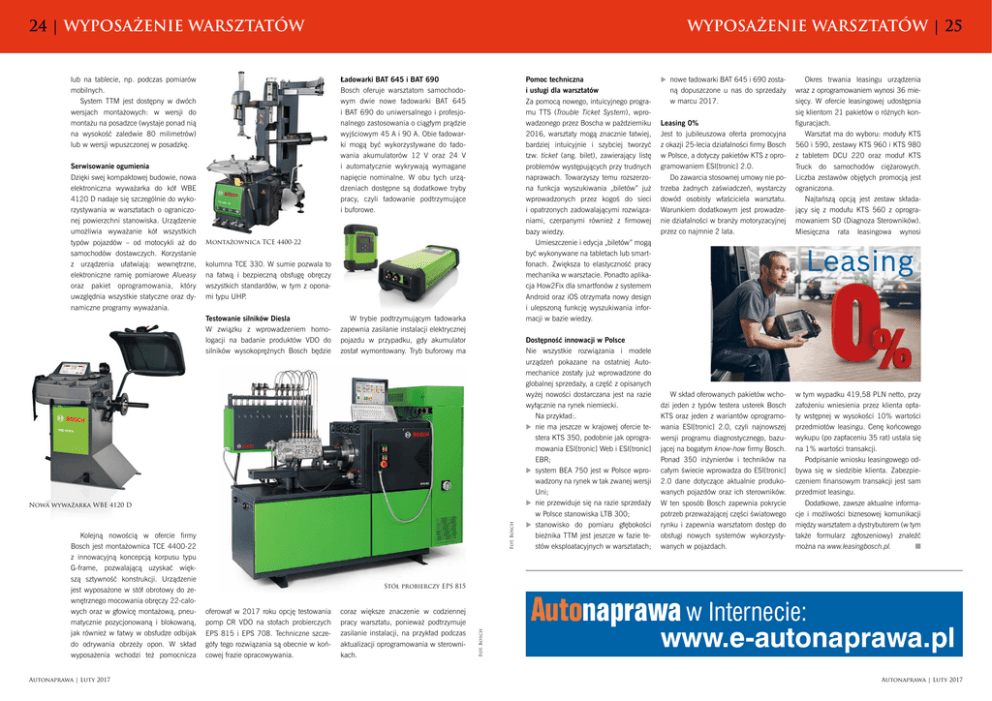 24 | WYPOSAŻENIE WARSZTATÓW Ładowarki BAT 645 i BAT 690 Bosch oferuje warsztatom samochodowym dwie nowe ładowarki BAT 645 i BAT 690 do uniwersalnego i profesjonalnego zastosowania o ciągłym prądzie wyjściowym 45 A i 90 A. Obie ładowarki mogą być wykorzystywane do ładowania akumulatorów 12 V oraz 24 V i automatycznie wykrywają wymagane napięcie nominalne. W obu tych urządzeniach dostępne są dodatkowe tryby pracy, czyli ładowanie podtrzymujące i buforowe. lub na tablecie, np. podczas pomiarów mobilnych. System TTM jest dostępny w dwóch wersjach montażowych: w wersji do montażu na posadzce (wystaje ponad nią na wysokość zaledwie 80 milimetrów) lub w wersji wpuszczonej w posadzkę. Serwisowanie ogumienia Dzięki swej kompaktowej budowie, nowa elektroniczna wyważarka do kół WBE 4120 D nadaje się szczególnie do wykorzystywania w warsztatach o ograniczonej powierzchni stanowiska. Urządzenie umożliwia wyważanie kół wszystkich typów pojazdów – od motocykli aż do samochodów dostawczych. Korzystanie z urządzenia ułatwiają: wewnętrzne, elektroniczne ramię pomiarowe Alueasy oraz pakiet oprogramowania, który uwzględnia wszystkie statyczne oraz dynamiczne programy wyważania. WYPOSAŻENIE WARSZTATÓW | 25 Pomoc techniczna i usługi dla warsztatów Za pomocą nowego, intuicyjnego programu TTS (Trouble Ticket System), wprowadzonego przez Boscha w październiku 2016, warsztaty mogą znacznie łatwiej, bardziej intuicyjnie i szybciej tworzyć tzw. ticket (ang. bilet), zawierający listę problemów występujących przy trudnych naprawach. Towarzyszy temu rozszerzona funkcja wyszukiwania „biletów” już wprowadzonych przez kogoś do sieci i opatrzonych zadowalającymi rozwiązaniami, czerpanymi również z firmowej bazy wiedzy. Umieszczenie i edycja „biletów” mogą być wykonywane na tabletach lub smartfonach. Zwiększa to elastyczność pracy mechanika w warsztacie. Ponadto aplikacja How2Fix dla smartfonów z systemem Android oraz iOS otrzymała nowy design i ulepszoną funkcję wyszukiwania informacji w bazie wiedzy. Montażownica TCE 4400-22 kolumna TCE 330. W sumie pozwala to na łatwą i bezpieczną obsługę obręczy wszystkich standardów, w tym z oponami typu UHP. Testowanie silników Diesla W związku z wprowadzeniem homologacji na badanie produktów VDO do silników wysokoprężnych Bosch będzie W trybie podtrzymującym ładowarka zapewnia zasilanie instalacji elektrycznej pojazdu w przypadku, gdy akumulator został wymontowany. Tryb buforowy ma Autonaprawa | Luty 2017 Stół probierczy EPS 815 oferował w 2017 roku opcję testowania pomp CR VDO na stołach probierczych EPS 815 i EPS 708. Techniczne szczegóły tego rozwiązania są obecnie w końcowej frazie opracowywania. coraz większe znaczenie w codziennej pracy warsztatu, ponieważ podtrzymuje zasilanie instalacji, na przykład podczas aktualizacji oprogramowania w sterownikach. Fot. Bosch Kolejną nowością w ofercie firmy Bosch jest montażownica TCE 4400-22 z innowacyjną koncepcją korpusu typu G-frame, pozwalającą uzyskać większą sztywność konstrukcji. Urządzenie jest wyposażone w stół obrotowy do zewnętrznego mocowania obręczy 22-calowych oraz w głowicę montażową, pneumatycznie pozycjonowaną i blokowaną, jak również w łatwy w obsłudze odbijak do odrywania obrzeży opon. W skład wyposażenia wchodzi też pomocnicza Fot. Bosch Nowa wyważarka WBE 4120 D Dostępność innowacji w Polsce Nie wszystkie rozwiązania i modele urządzeń pokazane na ostatniej Automechanice zostały już wprowadzone do globalnej sprzedaży, a część z opisanych wyżej nowości dostarczana jest na razie wyłącznie na rynek niemiecki. Na przykład:. nie ma jeszcze w krajowej ofercie testera KTS 350, podobnie jak oprogramowania ESI[tronic] Web i ESI[tronic] EBR; system BEA 750 jest w Polsce wprowadzony na rynek w tak zwanej wersji Uni; nie przewiduje się na razie sprzedaży w Polsce stanowiska LTB 300; stanowisko do pomiaru głębokości bieżnika TTM jest jeszcze w fazie testów eksploatacyjnych w warsztatach; nowe ładowarki BAT 645 i 690 zosta- Leasing 0% Jest to jubileuszowa oferta promocyjna z okazji 25-lecia działalności firmy Bosch w Polsce, a dotyczy pakietów KTS z oprogramowaniem ESI[tronic] 2.0. Do zawarcia stosownej umowy nie potrzeba żadnych zaświadczeń, wystarczy dowód osobisty właściciela warsztatu. Warunkiem dodatkowym jest prowadzenie działalności w branży motoryzacyjnej przez co najmnie 2 lata. Okres trwania leasingu urządzenia wraz z oprogramowaniem wynosi 36 miesięcy. W ofercie leasingowej udostępnia się klientom 21 pakietów o różnych konfiguracjach. Warsztat ma do wyboru: moduły KTS 560 i 590, zestawy KTS 960 i KTS 980 z tabletem DCU 220 oraz moduł KTS Truck do samochodów ciężarowych. Liczba zestawów objętych promocją jest ograniczona. Najtańszą opcją jest zestaw składający się z modułu KTS 560 z oprogramowaniem SD (Diagnoza Sterowników). Miesięczna rata leasingowa wynosi W skład oferowanych pakietów wchodzi jeden z typów testera usterek Bosch KTS oraz jeden z wariantów oprogramowania ESI[tronic] 2.0, czyli najnowszej wersji programu diagnostycznego, bazującej na bogatym know-how firmy Bosch. Ponad 350 inżynierów i techników na całym świecie wprowadza do ESI[tronic] 2.0 dane dotyczące aktualnie produkowanych pojazdów oraz ich sterowników. W ten sposób Bosch zapewnia pokrycie potrzeb przeważającej części światowego rynku i zapewnia warsztatom dostęp do obsługi nowych systemów wykorzystywanych w pojazdach. w tym wypadku 419,58 PLN netto, przy założeniu wniesienia przez klienta opłaty wstępnej w wysokości 10% wartości przedmiotów leasingu. Cenę końcowego wykupu (po zapłaceniu 35 rat) ustala się na 1% wartości transakcji. Podpisanie wniosku leasingowego odbywa się w siedzibie klienta. Zabezpieczeniem finansowym transakcji jest sam przedmiot leasingu. Dodatkowe, zawsze aktualne informacje i