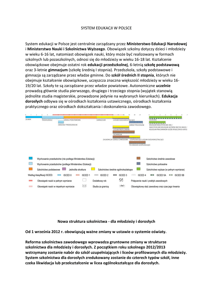 SYSTEM EDUKACJI W POLSCE System edukacji w Polsce jest centralnie zarządzany przez Ministerstwo Edukacji Narodowej i Ministerstwo Nauki i Szkolnictwa Wyższego. Obowiązek szkolny dotyczy dzieci i młodzieży w wieku 6-16 lat, natomiast obowiązek nauki, który może być realizowany w formach szkolnych lub pozaszkolnych, odnosi się do młodzieży w wieku 16-18 lat. Kształcenie obowiązkowe obejmuje ostatni rok edukacji przedszkolnej, 6-letnią szkołę podstawową oraz 3-letnie gimnazjum (szkołę średnią I stopnia). Przedszkola, szkoły podstawowe i gimnazja są zarządzane przez władze gminne. Do szkół średnich II stopnia, których nie obejmuje kształcenie obowiązkowe, uczęszcza znaczna większość młodzieży w wieku 1619/20 lat. Szkoły te są zarządzane przez władze powiatowe. Autonomiczne uczelnie prowadzą głównie studia pierwszego, drugiego i trzeciego stopnia (wyjątek stanowią jednolite studia magisterskie, prowadzone jedynie na wybranych kierunkach). Edukacja dorosłych odbywa się w ośrodkach kształcenia ustawicznego, ośrodkach kształcenia praktycznego oraz ośrodkach dokształcania i doskonalenia zawodowego. Nowa struktura szkolnictwa - dla młodzieży i dorosłych Od 1 września 2012 r. obowiązują ważne zmiany w ustawie o systemie oświaty. Reforma szkolnictwa zawodowego wprowadza gruntowne zmiany w strukturze szkolnictwa dla młodzieży i dorosłych. Z początkiem roku szkolnego 2012/2013 wstrzymany zostanie nabór do szkół uzupełniających i liceów profilowanych dla młodzieży. System szkolnictwa dla dorosłych zredukowany zostanie do czterech typów szkół, inne czeka likwidacja lub przekształcenie w licea ogólnokształcące dla dorosłych. Edukacja po gimnazjum Ustawa z dn. 19.08.2011 r. o zmianie ustawy o systemie oświaty oraz niektórych innych ustaw (Dz.U. Nr 205, poz. 1206) przewiduje, że nauka na IV etapie edukacyjnym realizowana będzie w: 1) trzyletniej zasadniczej szkole zawodowej umożliwiającej uzyskanie dyplomu potwierdzającego kwalifikacje zawodowe po zdaniu egzaminów potwierdzających kwalifikacje w danym zawodzie, a także otwierającej drogę do dalszego kształcenia począwszy od klasy drugiej liceum ogólnokształcącego dla dorosłych, 2) trzyletnim liceum ogólnokształcącym, którego ukończenie umożliwia uzyskanie świadectwa dojrzałości po zdaniu egzaminu maturalnego, 3) czteroletnim technikum, którego ukończenie umożliwia uzyskanie dyplomu potwierdzającego kwalifikacje zawodowe po zdaniu egzaminów potwierdzających kwalifikacje w danym zawodzie i świadectwa dojrzałości – po zdaniu egzaminu maturalnego, 4) szkole policealnej o okresie nauczania nie dłuższym niż 2,5 roku, umożliwiającej uzyskanie dyplomu potwierdzającego kwalifikacje zawodowe po zdaniu egzaminów potwierdzających kwalifikacje w danym zawodzie, 5) trzyletniej szkole specjalnej przysposabiającej do pracy dla uczniów z upośledzeniem umysłowym w stopniu umiarkowanym lub znacznym oraz dla uczniów z niepełnosprawnościami sprzężonymi, której ukończenie umożliwia uzyskanie świadectwa potwierdzającego przysposobienie do pracy. Wygaszanie szkół Tak jak dotąd, ukończenie liceum i technikum będzie równoznaczne z uzyskaniem średniego wykształcenia. Uczeń kończący zasadniczą szkołę zawodową uzyska wykształcenie zasadnicze zawodowe, poziom wykształcenia ogólnego będzie mógł podnieść tylko w liceum ogólnokształcącym dla dorosłych. Stopniowo wygaszone zostaną obecnie funkcjonujące typy szkół dla młodzieży: licea profilowane, uzupełniające licea ogólnokształcące, technika uzupełniające. W nowym systemie szkolnym będą funkcjonować cztery typy szkół dla dorosłych: szkoła podstawowa, gimnazjum, liceum ogólnokształcące i szkoła policealna. W szkołach tych stosowana będzie odrębna organizacja kształcenia, o przyjęcie do nich będą mogły ubiegać się osoby mające 18 lat lub kończące 18 lat w roku kalendarzowym, w którym są przyjmowane do szkoły. Pozostałe dotychczasowe typy szkół dla dorosłych zostaną wygaszone. Wygaszanie niektórych typów szkół w latach 2012–2013 Szkoła Typ szkoły Termin wstrzymania naboru do klas I liceum profilowane dla młodzieży uzupełniające liceum ogólnokształcące 1 wrzesień 2012 technikum uzupełniające zasadnicza szkoła zawodowa technikum dla dorosłych 1 wrzesień 2012 liceum profilowane uzupełniające liceum ogólnokształcące dla dorosłych technikum uzupełniające 1 wrzesień 2013 Od początku roku szkolnego 2012/2013 organy prowadzące będą mogły tworzyć centra kształcenia zawodowego i ustawicznego, czyli placówki mające służyć konsolidacji edukacji zawodowej i ustawicznej. Zgodnie z ust. 1 tego przepisu w skład centrum będą mogły wejść: szkoły dla dorosłych (szkoła podstawowa, gimnazjum, liceum ogólnokształcące, szkoła policealna), szkoły prowadzące kształcenie zawodowe (zasadnicza szkoła zawodowa, technikum, szkoła policealna), placówki kształcenia ustawicznego, placówki kształcenia praktycznego, ośrodki dokształcania i doskonalenia zawodowego, umożliwiające uzyskanie i uzupełnienie wiedzy, umiejętności i kwalifikacji zawodowych. Nowe zadania oświatowe powiatów - kwalifikacyjne kursy zawodowe Do zadań własnych powiatu należy zakładanie i prowadzenie szkół prowadzących kształcenie zawodowe tj. w technikach, zasadniczych szkołach zawodowych, szkołach policealnych. Od 1 września 2012 r. zadaniem samorządu powiatowego będzie również tworzenie warunków do prowadzenia kwalifikacyjnych kursów zawodowych. POZIOMY I FORMA STUDIÓW Na podstawie art. 2 ust. 1 ustawy - Prawo o szkolnictwie wyższym Studia pierwszego stopnia – forma kształcenia, na którą są przyjmowani kandydaci posiadający świadectwo dojrzałości, kończąca się uzyskaniem kwalifikacji pierwszego stopnia. Studia drugiego stopnia – forma kształcenia, na którą są przyjmowani kandydaci po