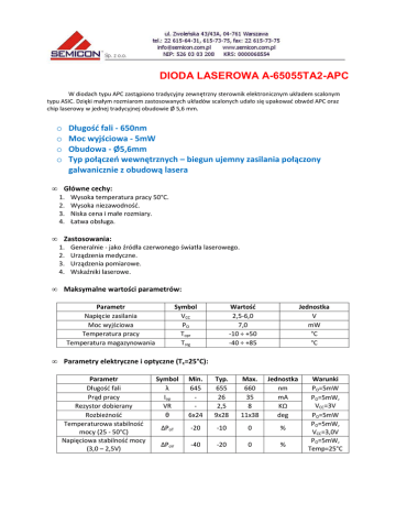 DIODA LASEROWA A-65055TA2-APC W diodach typu APC zastąpiono tradycyjny zewnętrzny sterownik elektronicznym układem scalonym typu ASIC. Dzięki małym rozmiarom zastosowanych układów scalonych udało się upakować obwód APC oraz chip laserowy w jednej tradycyjnej obudowie Ø 5,6 mm. Długość fali - 650nm Moc wyjściowa - 5mW Obudowa - Ø5,6mm Typ połączeń wewnętrznych – biegun ujemny zasilania połączony galwanicznie z obudową lasera o o o o • Główne cechy: 1. 2. 3. 4. • Zastosowania: 1. 2. 3. 4. • Wysoka temperatura pracy 50°C. Wysoka niezawodność. Niska cena i małe rozmiary. Łatwa obsługa. Generalnie - jako źródła czerwonego światła laserowego. Urządzenia medyczne. Urządzenia pomiarowe. Wskaźniki laserowe. Maksymalne wartości parametrów: Parametr Napięcie zasilania Moc wyjściowa Temperatura pracy Temperatura magazynowania • Symbol VCC PO Topr Tstg Wartość 2,5-6,0 7,0 -10 ÷ +50 -40 ÷ +85 Jednostka V mW °C °C Parametry elektryczne i optyczne (Tc=25°C): Parametr Długość fali Prąd pracy Rezystor dobierany Rozbieżność Temperaturowa stabilność mocy (25 - 50°C) Napięciowa stabilność mocy (3,0 – 2,5V) Symbol λ Iop VR θ Min. 645 6x24 Typ. 655 26 2,5 9x28 Max. 660 35 8 11x38 Jednostka nm mA KΩ deg ∆PoT -20 -10 0 % ∆PoV -40 -20 0 % Warunki PO=5mW PO=5mW, VCC=3V PO=5mW PO=5mW, VCC=3,0V PO=5mW, Temp=25°C DIODA LASEROWA A-65055TA2-APC • Schemat blokowy: 1. W tradycyjnym układzie diody laserowej (LD - laser diode) potrzebna jest duża liczba elementów zewnętrznych, które zapewniają stałą optyczną moc wyjściową. Jednym z tych elementów jest rezystor dobierany (VR - variable resistor), używany w celu regulacji mocy wyjściowej do zadanej wartości. 2. Dioda laserowa A-65055GA2-APC zawiera prawie wszystkie elementy sterownika wewnątrz obudowy Ø 5,6 mm. Tylko jeden element umieszczony jest na zewnątrz - rezystor dobierany. 3. Umieszczone na rysunku obok kondensatorowe tłumiki oscylacji (C1, C2) zapewniają odpowiednią stabilizację mocy wyjściowej. • Wymiary zewnętrzne i oznaczenia pinów: 1. Napięcie zasilania Vcc 2. Masa GND 3. Rezystor dobierany VR • Środki ostrożności: o Przed załączeniem zasilania należy ustawić maksymalną wartość rezystora dobieranego, co spowoduje zminimalizowanie optycznej mocy wyjściowej. Operacja ta zabezpiecza diodę laserową przed uszkodzeniem. o Nie przekraczać maksymalnych wartości parametrów. Praca przy parametrach wyższych niż maksymalne może spowodować uszkodzenie elementu. o Zachować szczególną ostrożność - dioda laserowa jest czuła na ładunki elektrostatyczne i stany nieustalone napięcia, występujące przy załączaniu zasilacza. o Aby uzyskać stabilne charakterystyki i wysoką niezawodność diody laserowej wymagane jest odpowiednie chłodzenie. Rekomendowane jest zastosowanie radiatora. o Promieniowanie laserowe może powodować uszkodzenia wzroku. Nigdy nie należy patrzeć bezpośrednio w wiązkę laserową! Zaleca się stosowanie okularów ochronnych, bądź obserwację wiązki za pomocą kamery. Więcej informacji o ochronie oczu przed promieniowaniem laserowym znajduje się w dziale „Klasy bezpieczeństwa urządzeń laserowych” oraz „Okulary ochronne”. DIODA LASEROWA A-65055TA2-APC • Zalecenia producenta dotyczące sterownika diody APC: P1: Wartość średnia optycznej mocy wyjściowej P2: Wartość maksymalna optycznej mocy wyjściowej ∆P: Amplituda oscylacji optycznej mocy wyjściowej T1: Czas pomiędzy narastaniem i opadaniem wartości maksymalnej optycznej mocy wyjściowej f2=(1/T2): Częstotliwość optycznej mocy wyjściowej