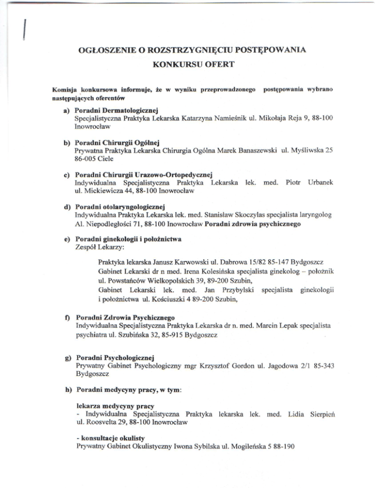 OGŁOSZENIE O ROZSTRZYGNIĘCIU POSTĘPOWANIA KONKURSU O F E R T Komisja konkursowa informuje, że w wyniku przeprowadzonego następujących oferentów postępowania wybrano a) Poradni Dermatologicznej Specjalistyczna Praktyka Lekarska Katarzyna Namieśnik ul. Mikołaja Reja 9, 88-100 Inowrocław b) Poradni Chirurgii Ogólnej Prywatna Praktyka Lekarska Chirurgia Ogólna Marek Banaszewski ul. Myśliwska 25 86-005 Ciele c) Poradni Chirurgii Urazowo-Ortopedycznej Indywidualna Specjalistyczna Praktyka Lekarska lek. med. Piotr Urbanek ul. Mickiewicza 44, 88-100 Inowrocław d) Poradni otolaryngologicznej Indywidualna Praktyka Lekarska lek. med. Stanisław Skoczylas specjalista laryngolog Al. Niepodległości 71, 88-100 Inowrocław Poradni zdrowia psychicznego e) Poradni ginekologii i położnictwa Zespół Lekarzy: Praktyka lekarska Janusz Karwowski ul. Dąbrowa 15/82 85-147 Bydgoszcz Gabinet Lekarski dr n med. Irena Kolesińska specjalista ginekolog - położnik ul. Powstańców Wielkopolskich 39, 89-200 Szubin, Gabinet Lekarski lek. med. Jan Przybylski specjalista ginekologii i położnictwa ul. Kościuszki 4 89-200 Szubin, f) Poradni Zdrowia Psychicznego Indywidualna Specjalistyczna Praktyka Lekarska dr n. med. Marcin Lepak specjalista psychiatra ul. Szubińska 32, 85-915 Bydgoszcz g) Poradni Psychologicznej Prywatny Gabinet Psychologiczny mgr Krzysztof Gordon ul. Jagodowa 2/1 85-343 Bydgoszcz h) Poradni medycyny pracy, w tym: lekarza medycyny pracy - Indywidualna Specjalistyczna Praktyka lekarska lek. med. Lidia Sierpień ul. Roosvelta 29, 88-100 Inowrocław - konsultacje okulisty Prywatny Gabinet Okulistyczny Iwona Sybilska ul. Mogileńska 5 88-190 - konsultacje neurologa Indywidualna Praktyka Lekarska ul. Krasińskiego 20 88-400 Żnin Maciej kiszka lekarz medycyny - konsultacje laryngologa Indywidualna Praktyka Lekarska lek. med. Stanisław Skoczylas specjalista laryngolog Al. Niepodległości 71, 88-100 Inowrocław i) Podstawowej Opieki Zdrowotnej Praktyka Lekarska Kinga Mrotek ul. Czerkawska 5/36, 85-641 Bydgoszcz j) dyżurów lekarskich w ramach nocnej i świątecznej opieki w podstawowej opiece zdrowotnej - Praktyka Lekarska Kinga Mrotek ul. Czerkawska 5/36, 85-641 Bydgoszcz - Indywidualna Specjalistyczna Praktyka Lekarska lek. med. Sławomir Horbatiuk ul. Bema 10/21 89-200 Szubin, - Prywatna Praktyka Lekarska Katarzyna Brazowska ul. Józefa Budy 1, 86-014 Siecienko, - Prywatna Praktyka Lekarska Jerzy Brazowski ul. Józefa Budy 1, 86-014 Siecienko, k) Poradni Stomatologicznej - usługi lekarskie wraz z protezami - Gabinet Stomatologiczny Barcin Prywatny Gabinet Stomatologiczny lek. stom. Hanna Żukowska - Bryja ul. Gnieźnieńska 21, 85-313 Bydgoszcz - Gabinet Stomatologiczny Piechcin Adrian Mularski, ul. Gdańska 80, 85-021 Bydgoszcz Członkowie Komisji: Dariusz Drzewiecki - Przewodni" Magdalena Paszkiet - członek ..: Agnieszka Szeliga - sekretarz ... Barcin, dnia 18.12.2014 r. Pouczenie: Świadczeniodawca może założyć odwołanie dotyczące rozstrzygnięcia postępowania, do Dyrektora SPZOZ w Barcinie w terminie 7 dni od dnia ogłoszenia o rozstrzygnięciu. Odwołanie wniesione po terminie nie podlega rozpatrzeniu.