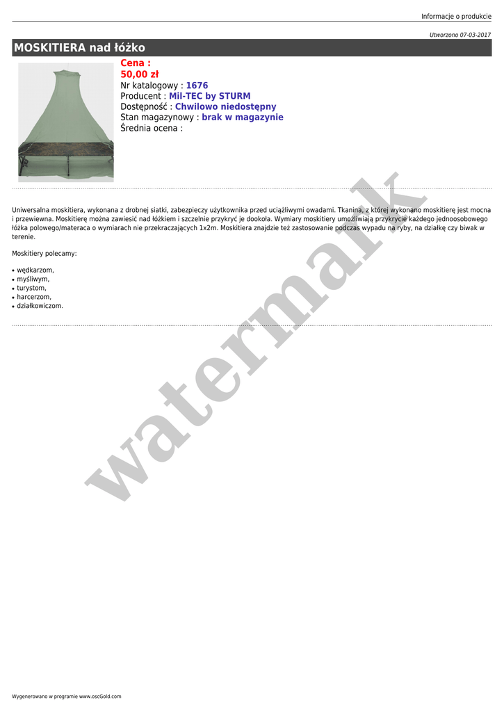 Informacje o produkcie Utworzono 07-03-2017 MOSKITIERA nad łóżko Cena : 50,00 zł er m ar k Nr katalogowy : 1676 Producent : Mil-TEC by STURM Dostępność : Chwilowo niedostępny Stan magazynowy : brak w magazynie Średnia ocena : Uniwersalna moskitiera, wykonana z drobnej siatki, zabezpieczy użytkownika przed uciążliwymi owadami. Tkanina, z której wykonano moskitierę jest mocna i przewiewna. Moskitierę można zawiesić nad łóżkiem i szczelnie przykryć je dookoła. Wymiary moskitiery umożliwiają przykrycie każdego jednoosobowego łóżka polowego/materaca o wymiarach nie przekraczających 1x2m. Moskitiera znajdzie też zastosowanie podczas wypadu na ryby, na działkę czy biwak w terenie. Moskitiery polecamy: ● ● ● ● w at ● wędkarzom, myśliwym, turystom, harcerzom, działkowiczom. Wygenerowano w programie www.oscGold.com