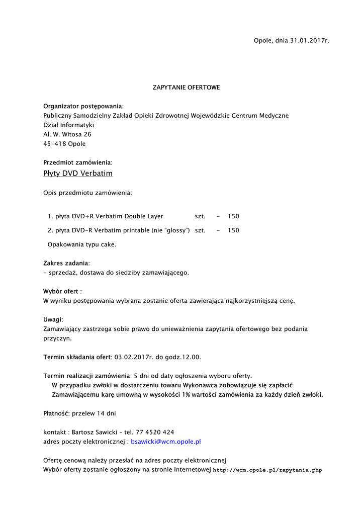 Opole, dnia 31.01.2017r. ZAPYTANIE OFERTOWE Organizator postępowania: Publiczny Samodzielny Zakład Opieki Zdrowotnej Wojewódzkie Centrum Medyczne Dział Informatyki Al. W. Witosa 26 45-418 Opole Przedmiot zamówienia: Płyty DVD Verbatim Opis przedmiotu zamówienia: 1. płyta DVD+R Verbatim Double Layer szt. - 150 2. płyta DVD-R Verbatim printable (nie “glossy”) szt. - 150 Opakowania typu cake. Zakres zadania: - sprzedaż, dostawa do siedziby zamawiającego. Wybór ofert : W wyniku postępowania wybrana zostanie oferta zawierająca najkorzystniejszą cenę. Uwagi: Zamawiający zastrzega sobie prawo do unieważnienia zapytania ofertowego bez podania przyczyn. Termin składania ofert: 03.02.2017r. do godz.12.00. Termin realizacji zamówienia: 5 dni od daty ogłoszenia wyboru oferty. W przypadku zwłoki w dostarczeniu towaru Wykonawca zobowiązuje się zapłacić Zamawiającemu karę umowną w wysokości 1% wartości zamówienia za każdy dzień zwłoki. Płatność: przelew 14 dni kontakt : Bartosz Sawicki – tel. 77 4520 424 adres poczty elektronicznej : [email protected] Ofertę cenową należy przesłać na adres poczty elektronicznej Wybór oferty zostanie ogłoszony na stronie internetowej http://wcm.opole.pl/zapytania.php
