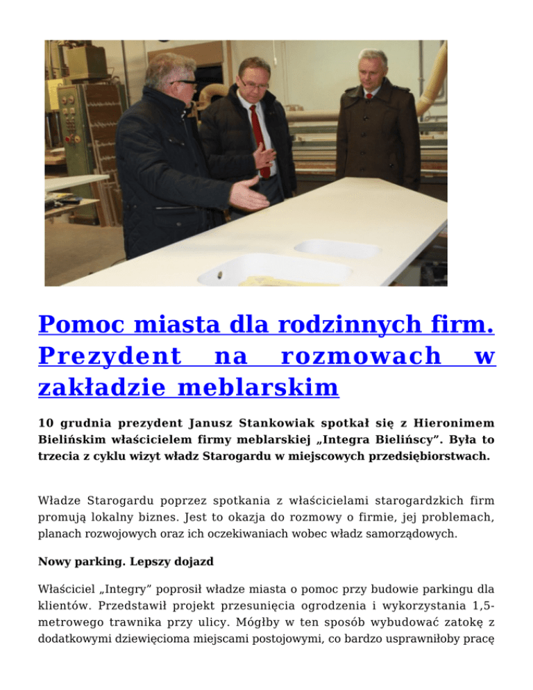 Pomoc miasta dla rodzinnych firm. Prezydent na rozmowach w zakładzie meblarskim 10 grudnia prezydent Janusz Stankowiak spotkał się z Hieronimem Bielińskim właścicielem firmy meblarskiej „Integra Bielińscy”. Była to trzecia z cyklu wizyt władz Starogardu w miejscowych przedsiębiorstwach. Władze Starogardu poprzez spotkania z właścicielami starogardzkich firm promują lokalny biznes. Jest to okazja do rozmowy o firmie, jej problemach, planach rozwojowych oraz ich oczekiwaniach wobec władz samorządowych. Nowy parking. Lepszy dojazd Właściciel „Integry” poprosił władze miasta o pomoc przy budowie parkingu dla klientów. Przedstawił projekt przesunięcia ogrodzenia i wykorzystania 1,5metrowego trawnika przy ulicy. Mógłby w ten sposób wybudować zatokę z dodatkowymi dziewięcioma miejscami postojowymi, co bardzo usprawniłoby pracę firmy. Pytał urzędników, czy taka przebudowa jest zgodna z przepisami. Władze miasta obejrzały miejsce planowanej inwestycji. Obiecały pomoc przy uzyskiwaniu wymaganych pozwoleń. Hieronim Bieliński zwrócił też uwagę na utrudnienia związane z przejazdem przez tory kolejowe. Po zamknięciu szlabanów tworzą się tam korki. Twierdzi, że to problem dla wielu okolicznych firm. Pytał, czy są plany przebudowy przejazdu kolejowego i poszerzenia pobliskiego ronda na skrzyżowaniu ulic Jagiełly i Skarszewskiej. Wiceprezydent Przemysław BiesekTalewski poinformował, że władze miasta będą dążyć do budowy tunelu pod torami. Liczą też, że ruch w mieście zmniejszy planowana obwodnica. Prezydent pytał o zatrudnianie fachowców, których na rynku jest niewielu. Hieronim Bieliński twierdzi, że przyczyną problemu jest brak w Starogardzie szkół zawodowych. Jerzy Suchomski ze Związku Pracodawców Starogardzkiego Klubu Biznesu zapowiedział organizację targów rzemieślniczych dla przedsiębiorców, którzy szkolą młodzież zawodowo. Odbędą się w styczniu 2016. Wychowanie we wiórach Wychowałem się we wiórach – opowiadał Hieronim Bieliński o swej stolarskiej pasji. Mój ojciec, brat, szwagier – wszyscy są stolarzami. Firmę przejąłem po ojcu i liczę, że po mnie przejmą ją moje dzieci. „Integra Bielińscy” zatrudnia 24 pracowników. Produkuje meble i aranżuje wnętrza na życzenie klienta. Proponuje oryginalne oraz nowoczesne rozwiązania zabudowy przede wszystkim kuchni, garderób, sypialni i łazienek. Eksportuje też meble do Rosji, Niemiec, Szwecji i Finlandii. Właściciel firm oprowadził władze miasta po zakładzie. Pokazał m.in. pracę snycerza, który zajmuje się rzeźbieniem mebli. W spotkaniu oprócz prezydenta Janusza Stanowiaka uczestniczyli również wiceprezydent Przemysław Biesek-Talewski oraz Naczelnik Wydziału Inicjatyw Gospodarczych – Tadeusz Błędzki. Związek Pracodawców Starogardzki Klub Biznesu reprezentował Jerzy Suchomski. Kolejne spotkania samorządu z lokalnym przedsiębiorcą już w 2016 roku.