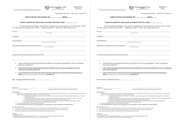 Załącznik nr 2 ORYGINAŁ ...................................................................... Załącznik nr 2 KOPIA ...................................................................... (oznaczenie podmiotu przeprowadzającego badanie lekarskie) (oznaczenie podmiotu przeprowadzającego badanie lekarskie) Rodzaj badania lekarskiego: wstępne/okresowe/kontrolne *) Rodzaj badania lekarskiego: wstępne/okresowe/kontrolne *) ORZECZENIE LEKARSKIE NR ….………….…./(ROK)…….. ORZECZENIE LEKARSKIE NR ….………….…./(ROK)…….. wydane na podstawie skierowania na badanie lekarskie z dnia …………………. wydane na podstawie skierowania na badanie lekarskie z dnia …………………. W wyniku badania lekarskiego i oceny narażeń́ występujących na stanowisku pracy, stosownie do art. 43 pkt 2 i art. 229 § 4 ustawy z dnia 26 czerwca 1974 r. – Kodeks pracy (Dz. U. z 2016 r. poz. 1666), orzeka się̨, że: W wyniku badania lekarskiego i oceny narażeń́ występujących na stanowisku pracy, stosownie do art. 43 pkt 2 i art. 229 § 4 ustawy z dnia 26 czerwca 1974 r. – Kodeks pracy (Dz. U. z 2016 r. poz. 1666), orzeka się̨, że: P a n (i) ....................................................................................................................................................................................... P a n (i) ....................................................................................................................................................................................... (imię i nazwisko) (imię i nazwisko) nr PESEL **) ................................................................................................................................................................................. nr PESEL **) ................................................................................................................................................................................. zamieszkały(a) w ......................................................................................................................................................................... zamieszkały(a) w ......................................................................................................................................................................... (miejscowość́ , ulica, nr domu, nr lokalu) - (miejscowość́ , ulica, nr domu, nr lokalu) - zatrudniony(-na)/przyjmowany(-na)*) do pracy w...................................................................................................................... zatrudniony(-na)/przyjmowany(-na)*) do pracy w...................................................................................................................... (nazwa i adres pracodawcy) (nazwa i adres pracodawcy) ...................................................................................................................................................................................................... ...................................................................................................................................................................................................... na stanowisku/stanowiskach/stanowisko/stanowiska*)................................................................................................................ na stanowisku/stanowiskach/stanowisko/stanowiska*)................................................................................................................ ...................................................................................................................................................................................................... ...................................................................................................................................................................................................... • wobec braku przeciwwskazań́ zdrowotnych jest zdolny(-na) do wykonywania/podjęcia pracy na określonym stanowisku (symbol 21)*) • wobec braku przeciwwskazań́ zdrowotnych jest zdolny(-na) do wykonywania/podjęcia*) pracy na określonym stanowisku (symbol 21)*) • wobec istnienia przeciwwskazań́ zdrowotnych jest niezdolny(-na) do wykonywania/podjęcia*) pracy na określonym stanowisku (symbol 22)*) • wobec istnienia przeciwwskazań́ zdrowotnych jest niezdolny(-na) do wykonywania/podjęcia*) pracy na określonym stanowisku (symbol 22)*) • wobec istnienia przeciwwskazań́ zdrowotnych utracił(a) zdolność́ do wykonywania dotychczasowej pracy z dniem................................................................. (symbol 23)*). • wobec istnienia przeciwwskazań́ zdrowotnych utracił(a) zdolność́ do wykonywania dotychczasowej pracy z dniem................................................................. (symbol 23)*). *) Data następnego badania okresowego ........................................................ Data następnego badania okresowego ........................................................ Katowice, .......................................... Katowice, .......................................... (miejscowość́ , data) ....................................................................... (pieczątka i podpis lekarza przeprowadzającego badanie lekarskie|) POUCZENIE ***): 1. Osoba badana lub pracodawca może w terminie 7 dni od dnia otrzymania orzeczenia lekarskiego wnieść́ odwołanie wraz z jego uzasadnieniem za pośrednictwem lekarza, który je wydał, do jednego z podmiotów odwoławczych, którymi są̨: 1) wojewódzkie ośrodki medycyny pracy właściwe ze względu na miejsce świadczenia pracy lub siedzibę̨ jednostki organizacyjnej, w której jest zatrudniony pracownik; 2) instytuty badawcze dziedzinie medycyny pracy lub Uniwersyteckie Centrum Medycyny Morskiej i Tropikalnej w Gdyni, w przypadku orzeczenia lekarskiego wydanego przez lekarza zatrudnionego w wo