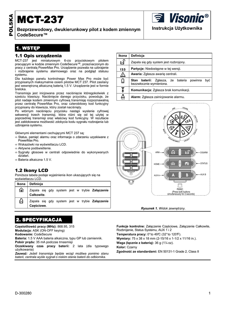 Zgodność ze standardami: EN 50131-1 Grade 2, Class II